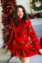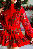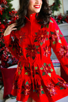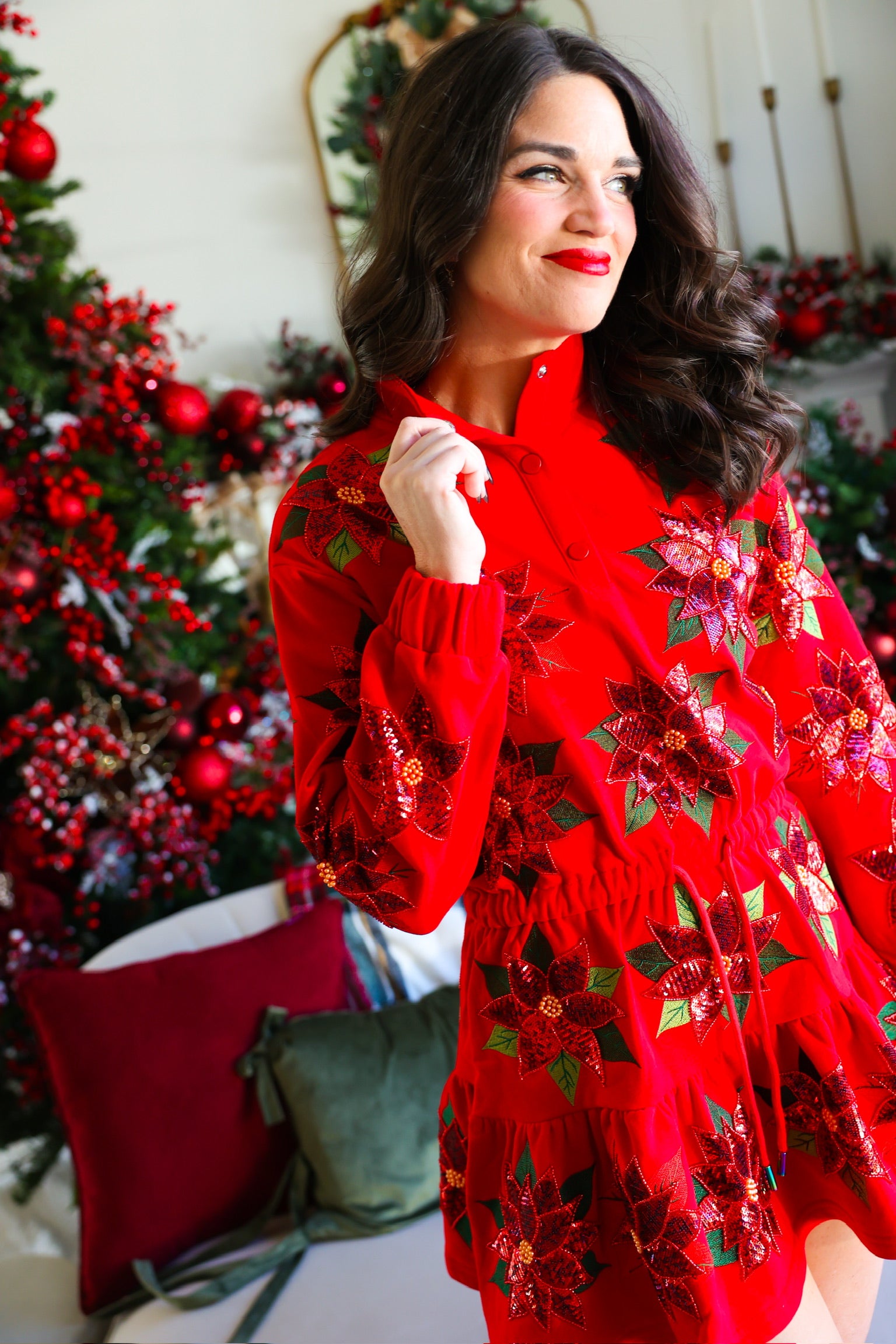 Red Poinsettia Button Up Mock Neck Tie Sweatshirt Dress Queen of Sparkles