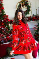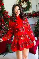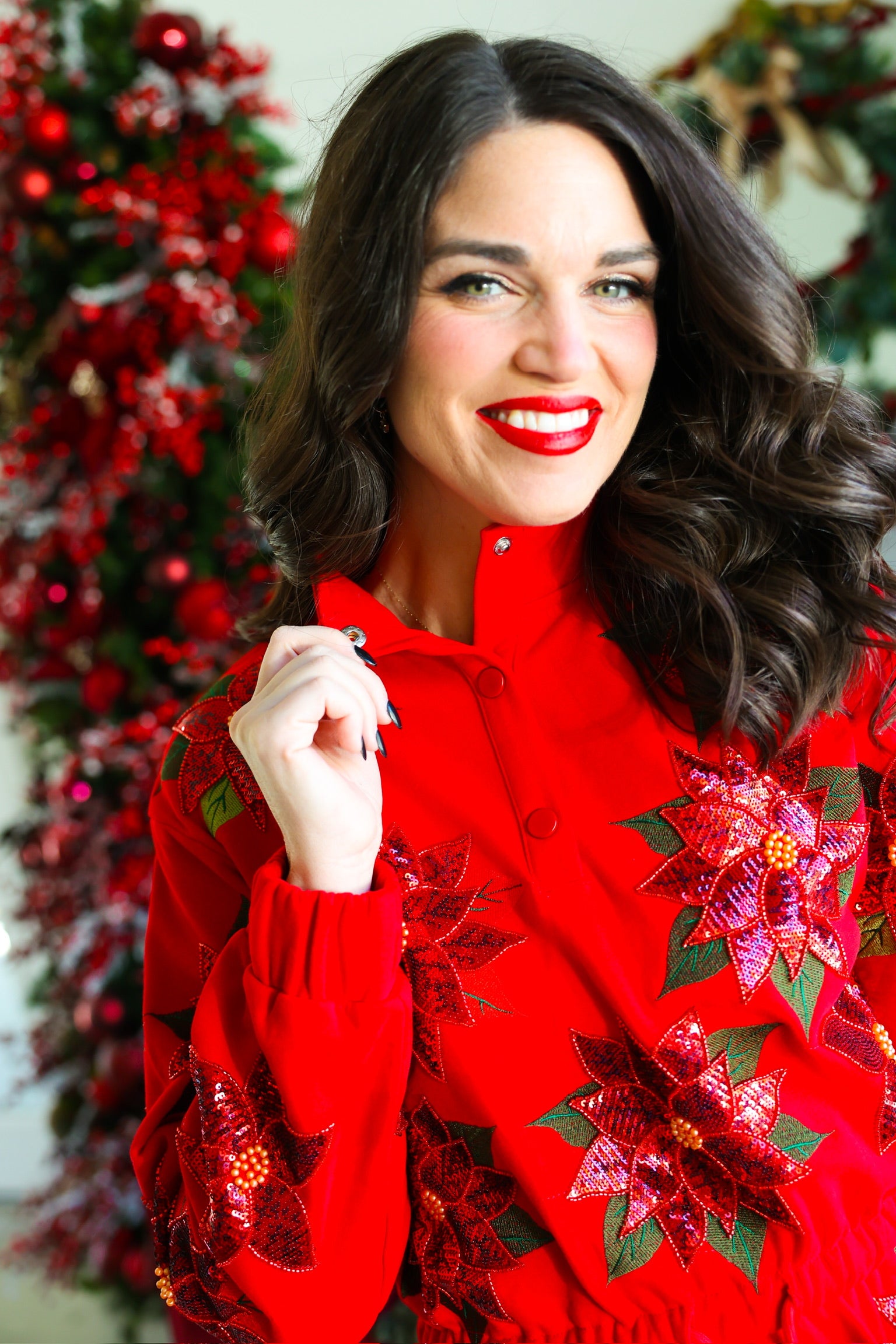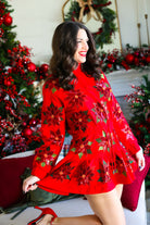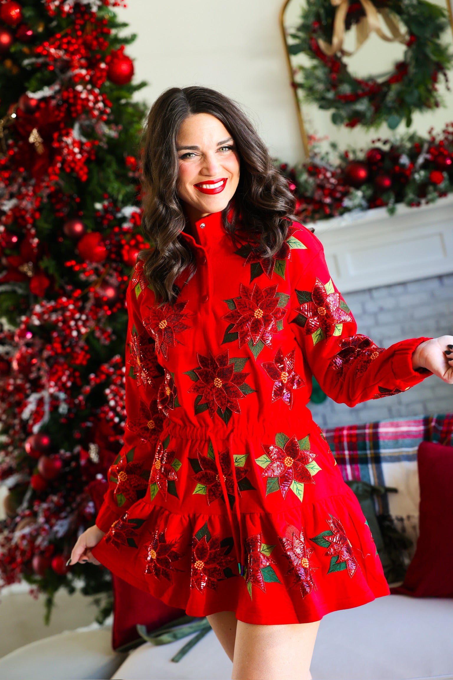 Embrace holiday charm with the Red Poinsettia Button Up Mock Neck Tie Sweatshirt Dress. Featuring vibrant poinsettia details and a sophisticated mock neck with a stylish tie, this dress blends festive flair with cozy comfort. Its button-up design adds a touch of elegance, making it perfect for seasonal gatherings or festive outings. Stand out as the Queen of Sparkles and celebrate the season wrapped in warmth and style.