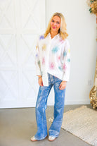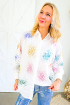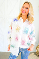 Express your artistic side in the White Multi Splatter Button Up Cotton Dress from Queen of Sparkles. This eye-catching piece features a vibrant multi-colored splatter design that adds personality and movement to a timeless silhouette. Crafted from soft, breathable cotton, it offers all-day comfort without sacrificing style. The classic button-up front provides easy styling versatility—wear it as a dress, layer it over basics, or tie it at the waist for a fresh look. Perfect for creative souls who refuse to blend in, this dress celebrates individuality with bold flair. Make every moment memorable with a piece that's as unique and dynamic as you are.