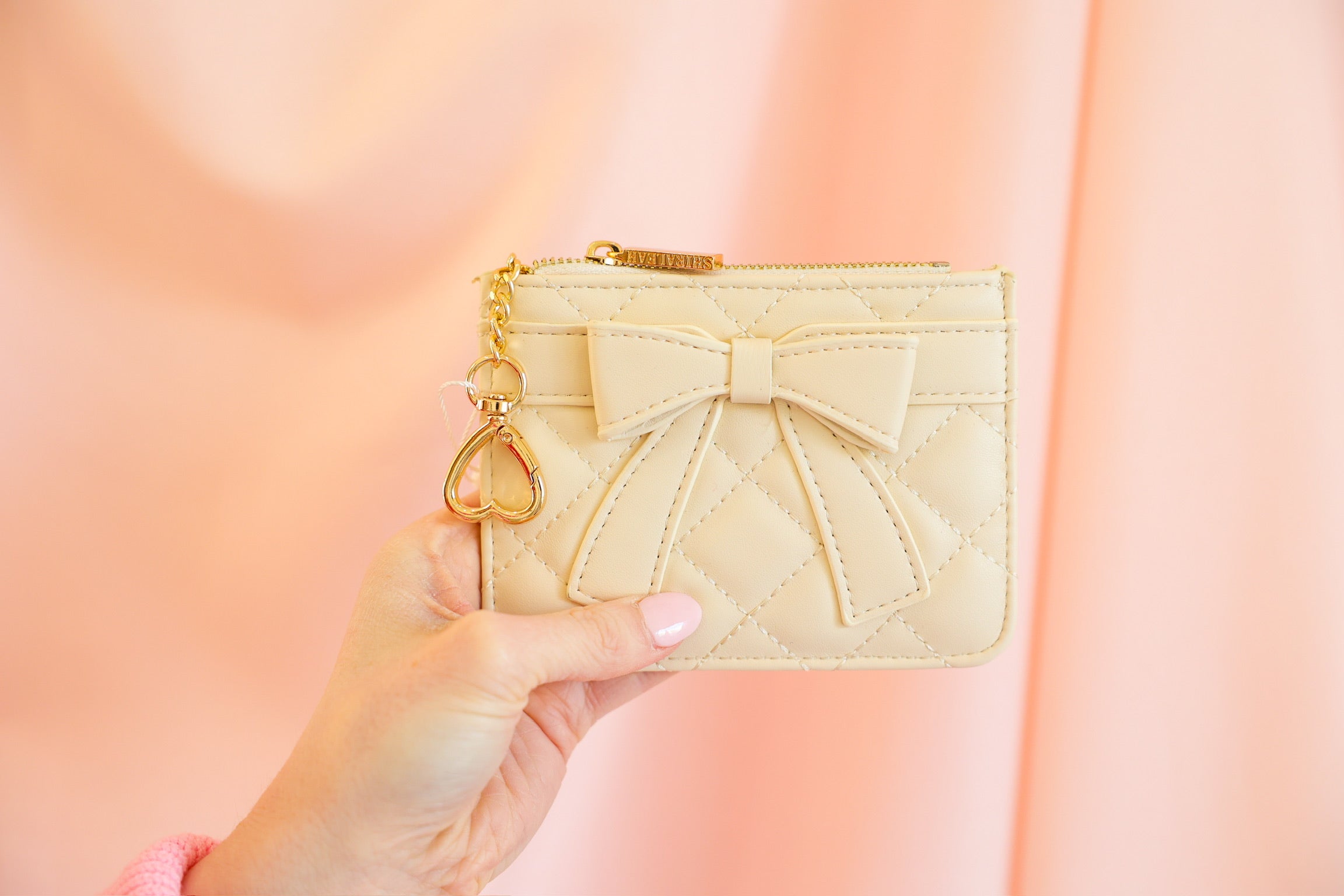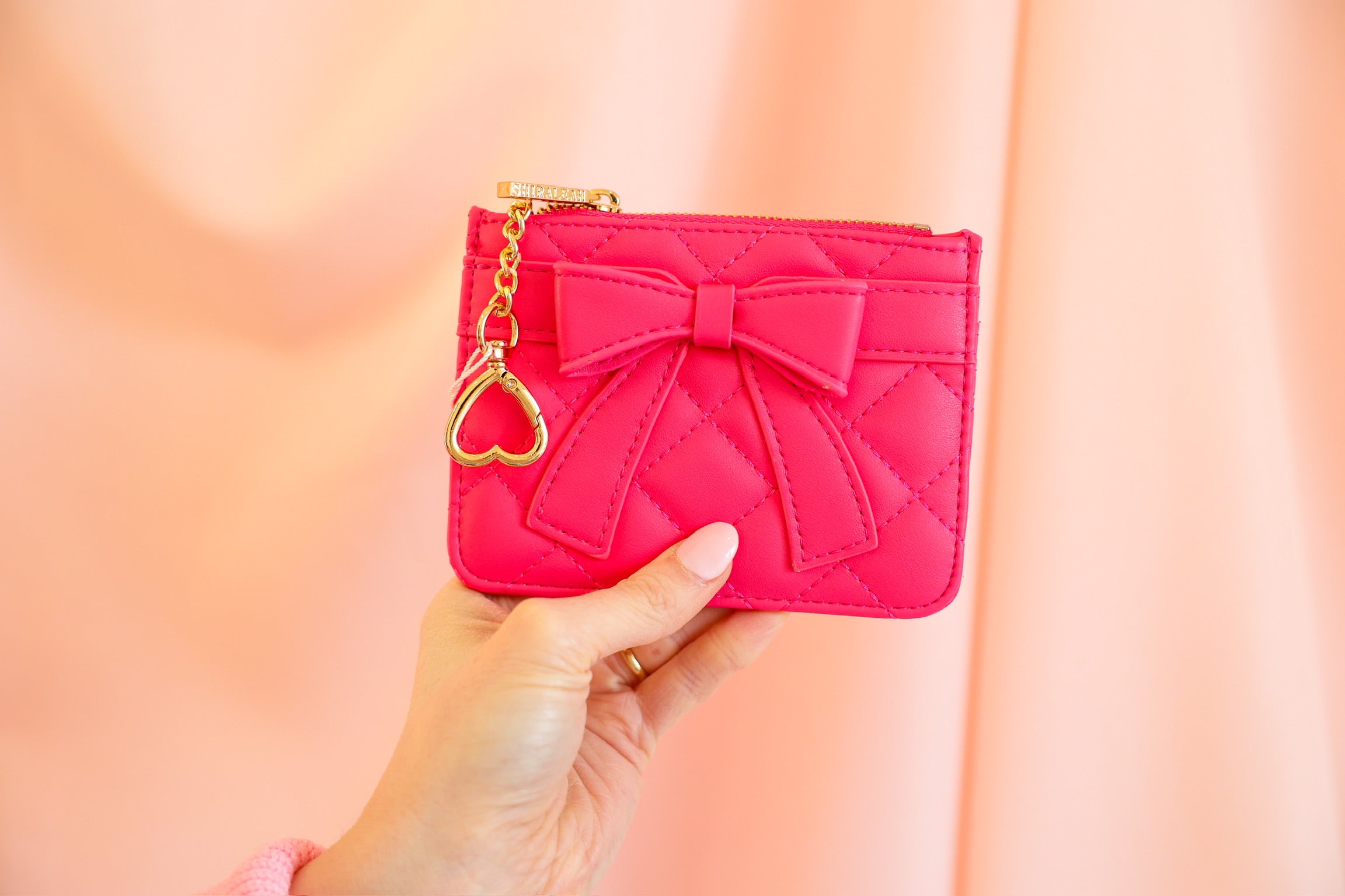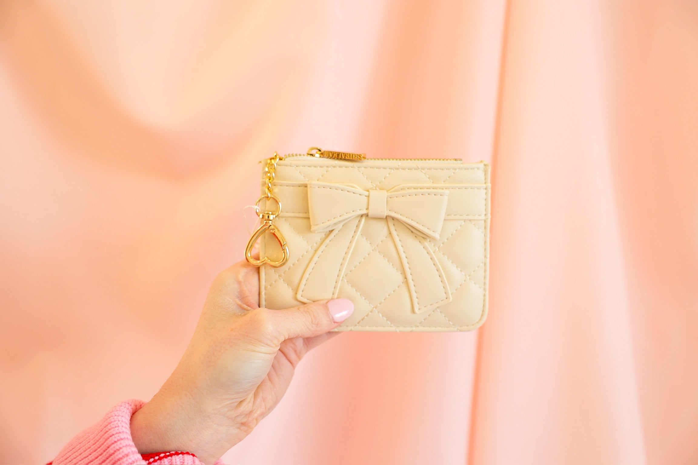 Small accessory, big heart-eyes 💘 The Shiraleah Quilted Bow Card Case is where everyday function meets ultra-cute design. Featuring a diamond-quilted faux leather finish and an oversized bow front and center, this little essential adds instant charm to your daily routine. Finished with a gold heart-shaped key ring, it clips easily to your keys or bag—so your cards, cash, and tiny treasures are always close at hand.
