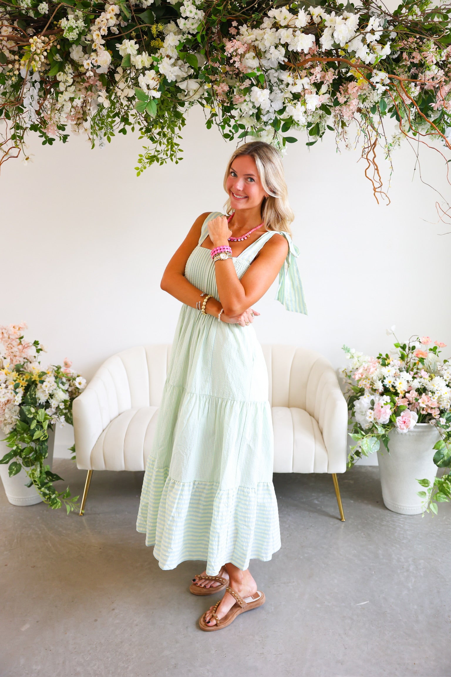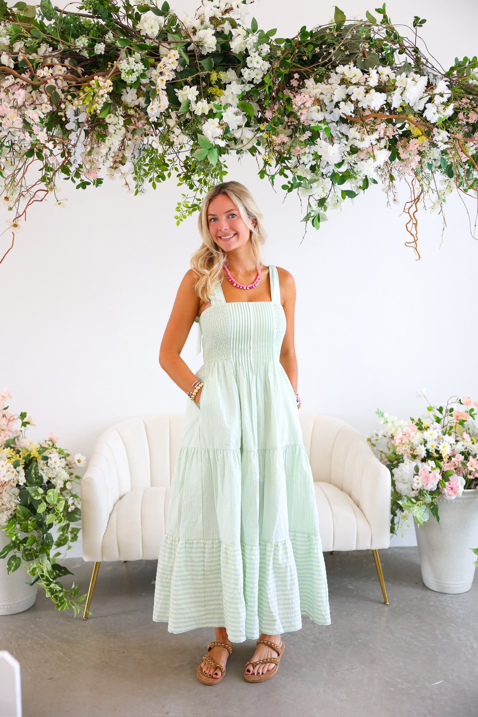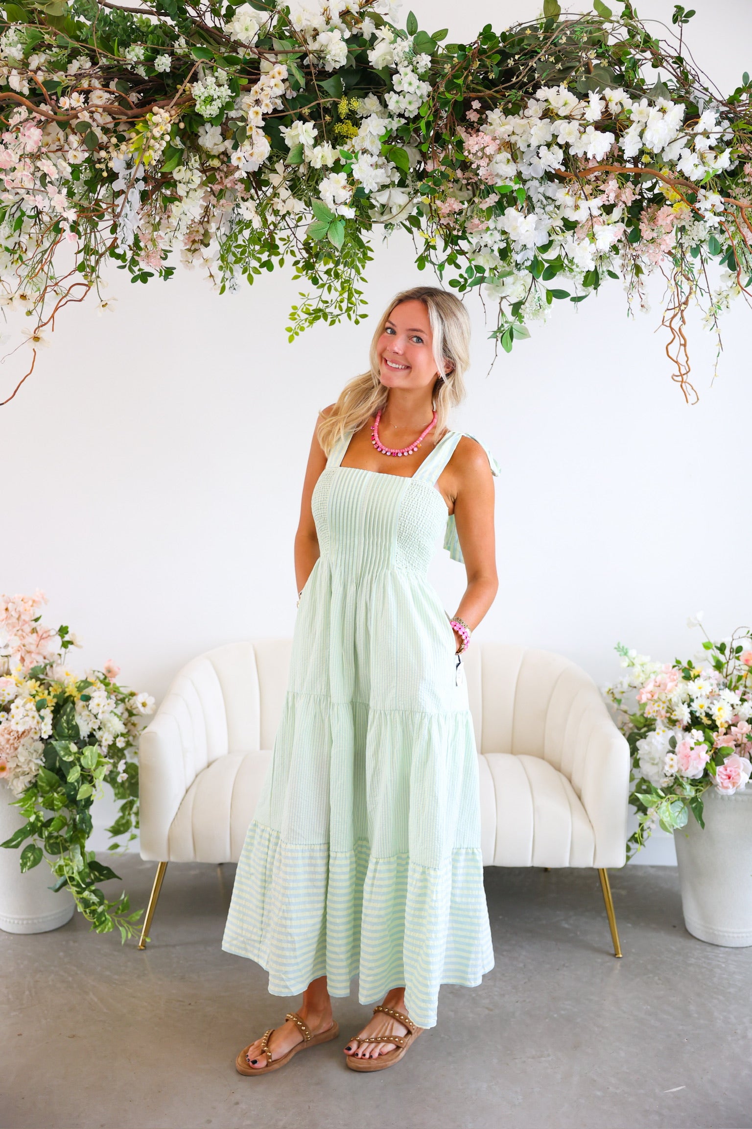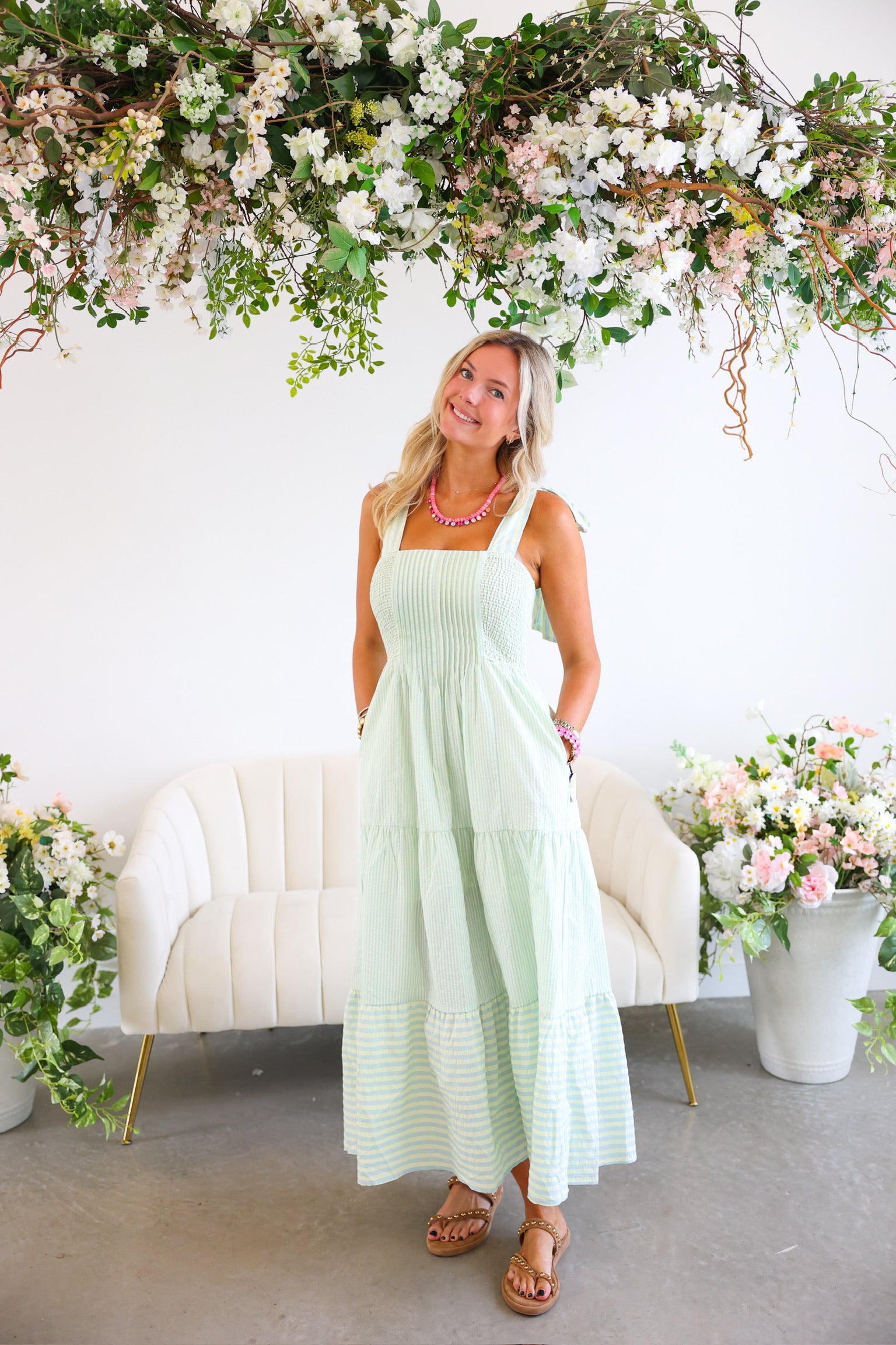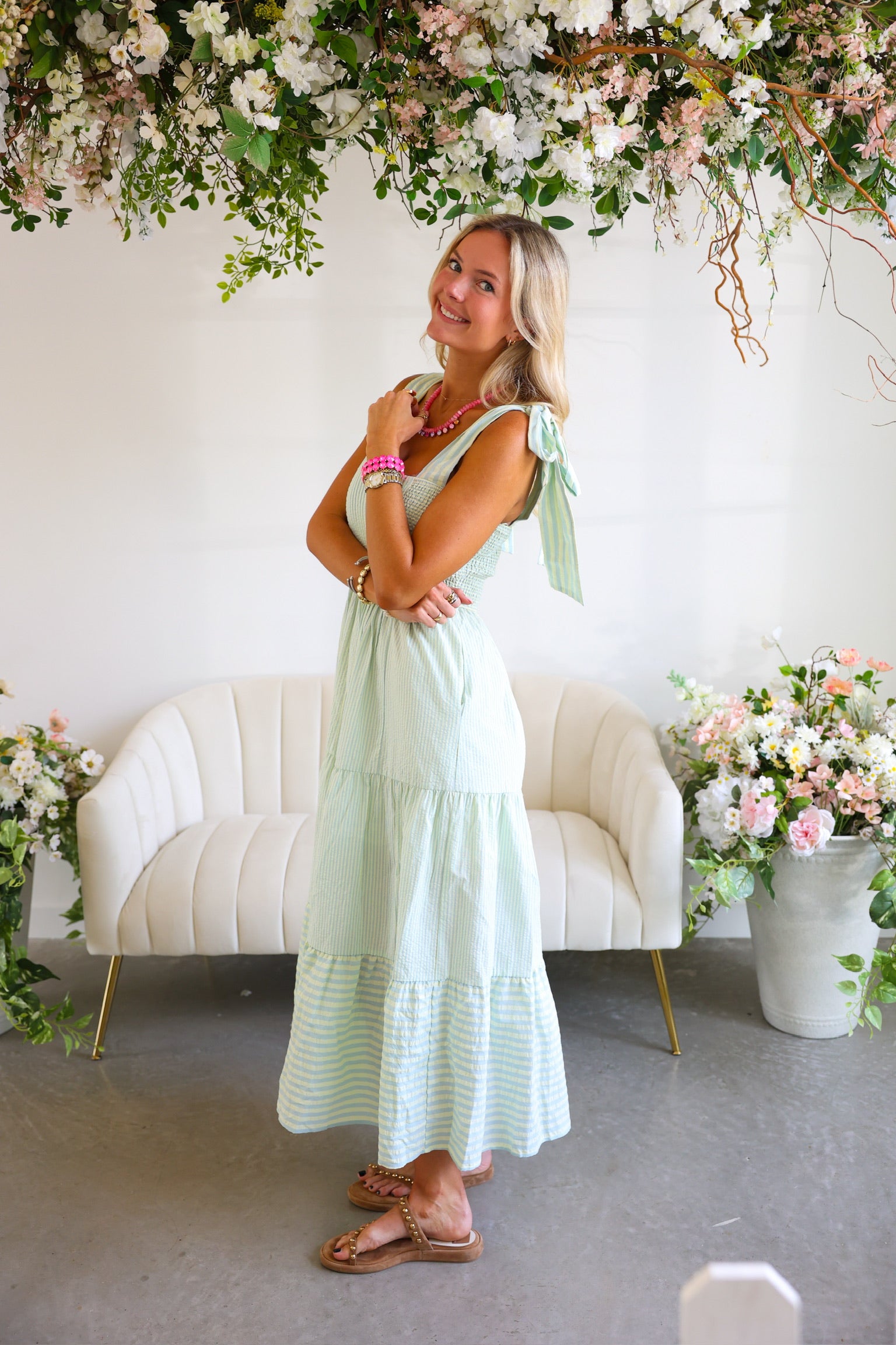 Soft, feminine, and effortlessly charming, this Peach Love striped midi dress is made for sunny days and easy styling. Featuring a smocked bodice for a flattering, comfortable fit, adjustable tie straps, and a flowy tiered skirt, this dress moves beautifully with you. The mint and blue stripe pattern keeps it fresh and versatile—perfect for everything from brunch to beach vacations.