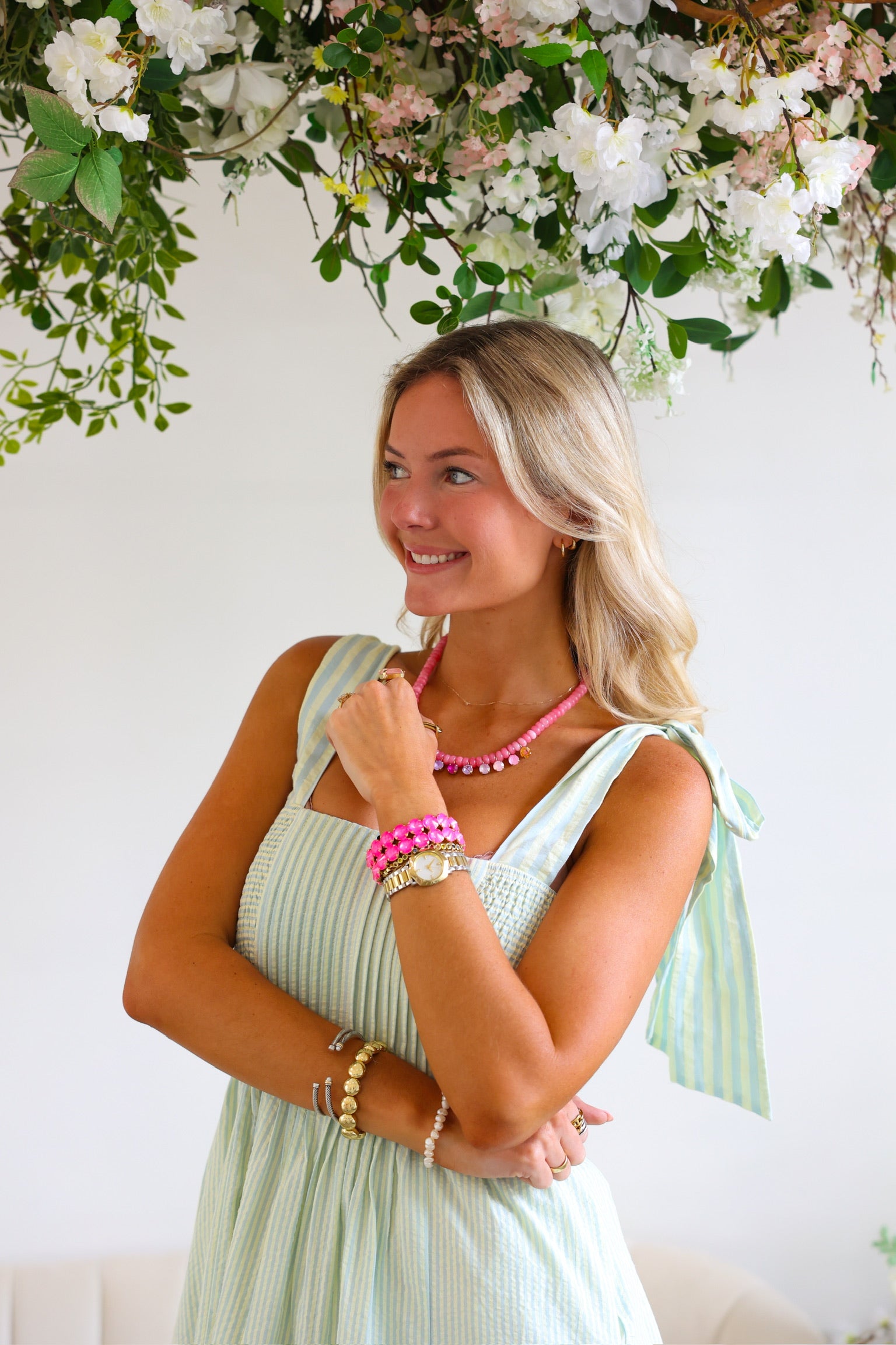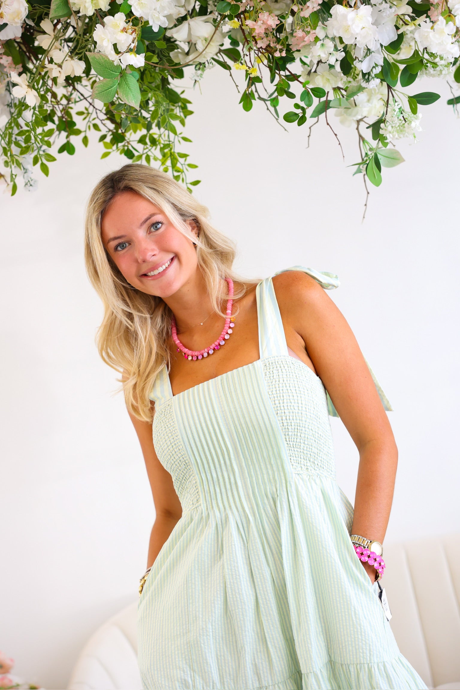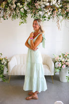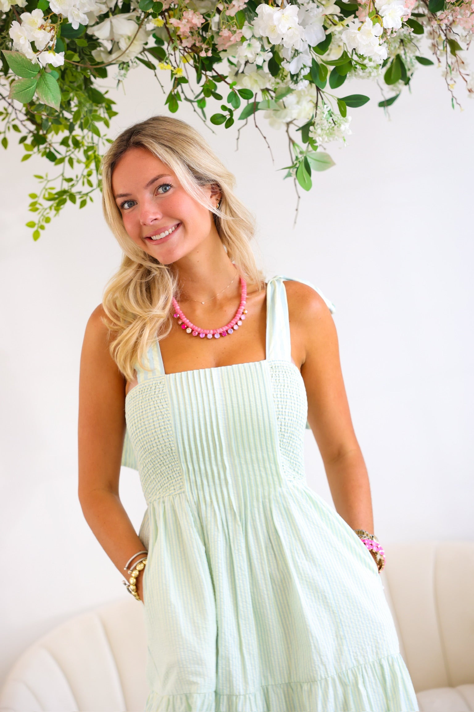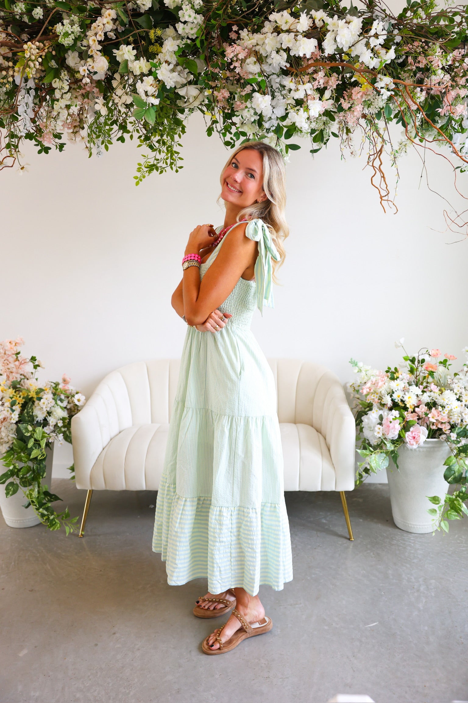 Soft, feminine, and effortlessly charming, this Peach Love striped midi dress is made for sunny days and easy styling. Featuring a smocked bodice for a flattering, comfortable fit, adjustable tie straps, and a flowy tiered skirt, this dress moves beautifully with you. The mint and blue stripe pattern keeps it fresh and versatile—perfect for everything from brunch to beach vacations.