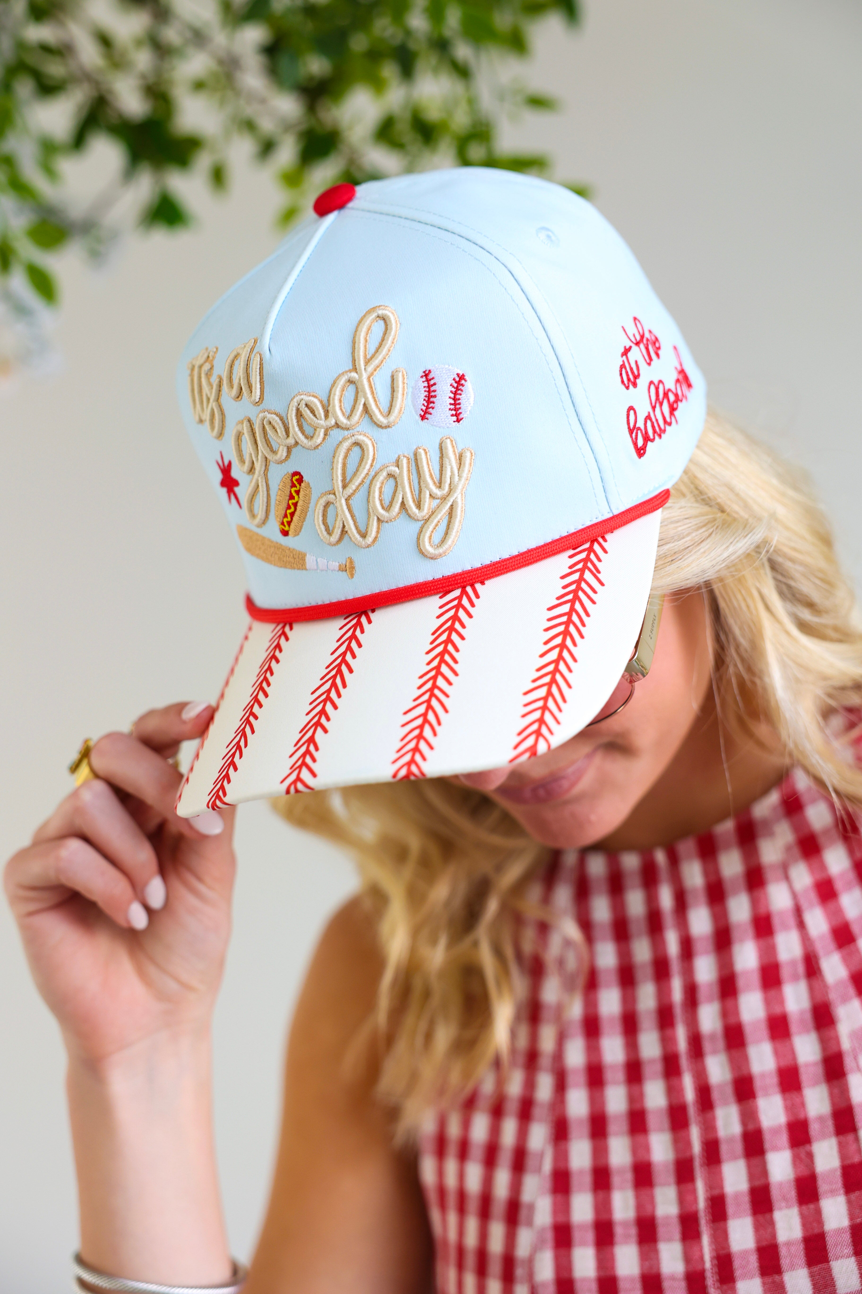 The light blue crown paired with red stitching detail on the brim gives it that classic baseball vibe ⚾️, while the bold embroidery keeps it boutique-level cute. It’s the perfect finishing touch for game days, tournaments, tailgates, or casual summer outfits.
