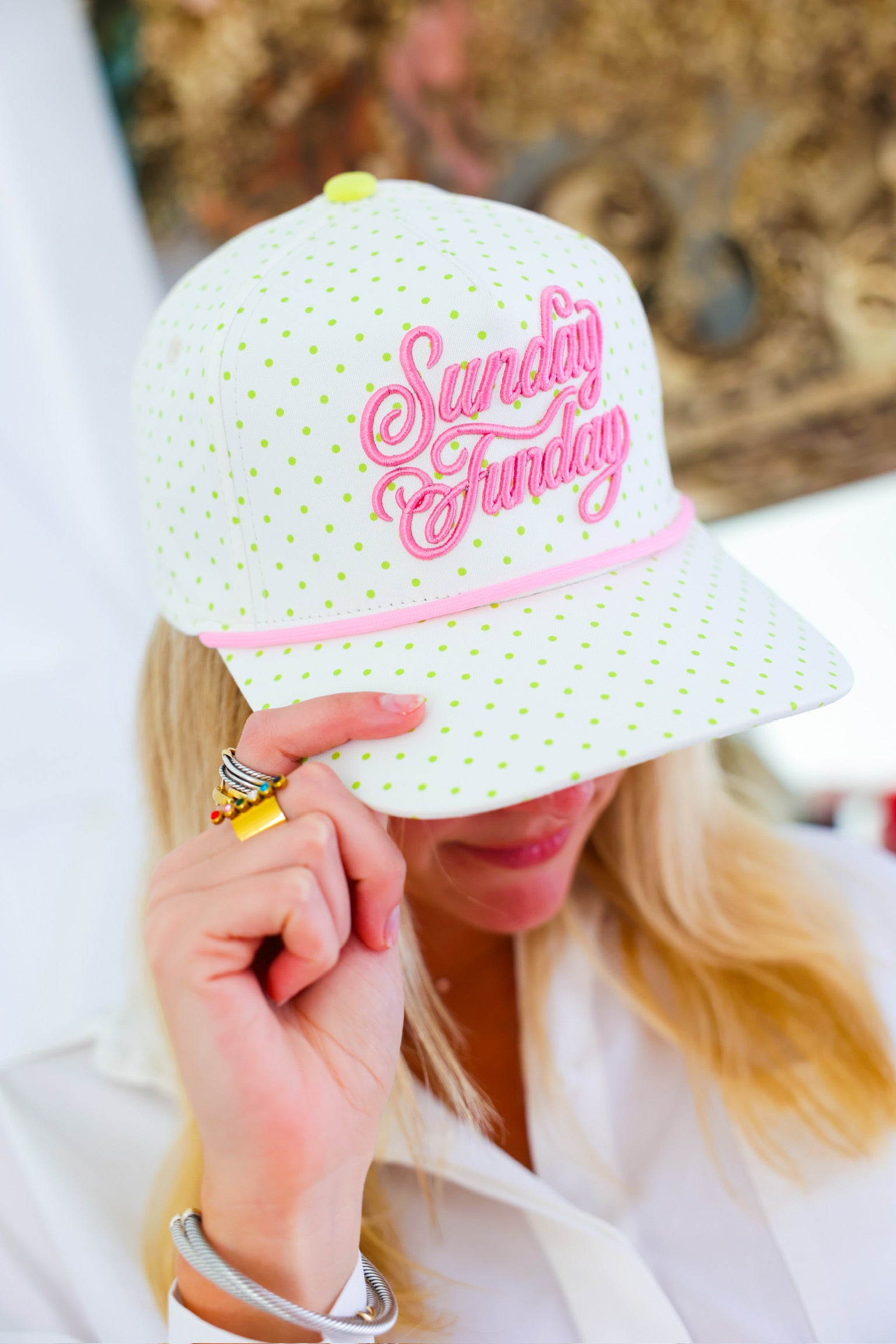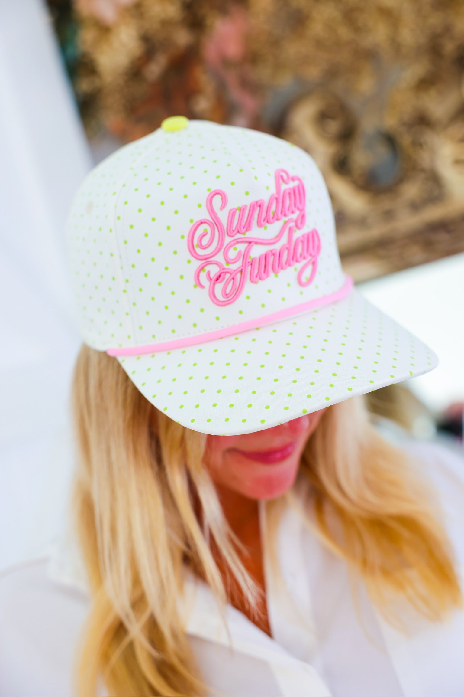 The Sunday Funday Hat is your go-to accessory for girls’ brunch, patio cocktails, pool days, and every carefree weekend moment in between. Featuring bold pink embroidered “Sunday Funday” lettering on a playful white base with lime green polka dots 💚, this cap is equal parts sporty and girly.