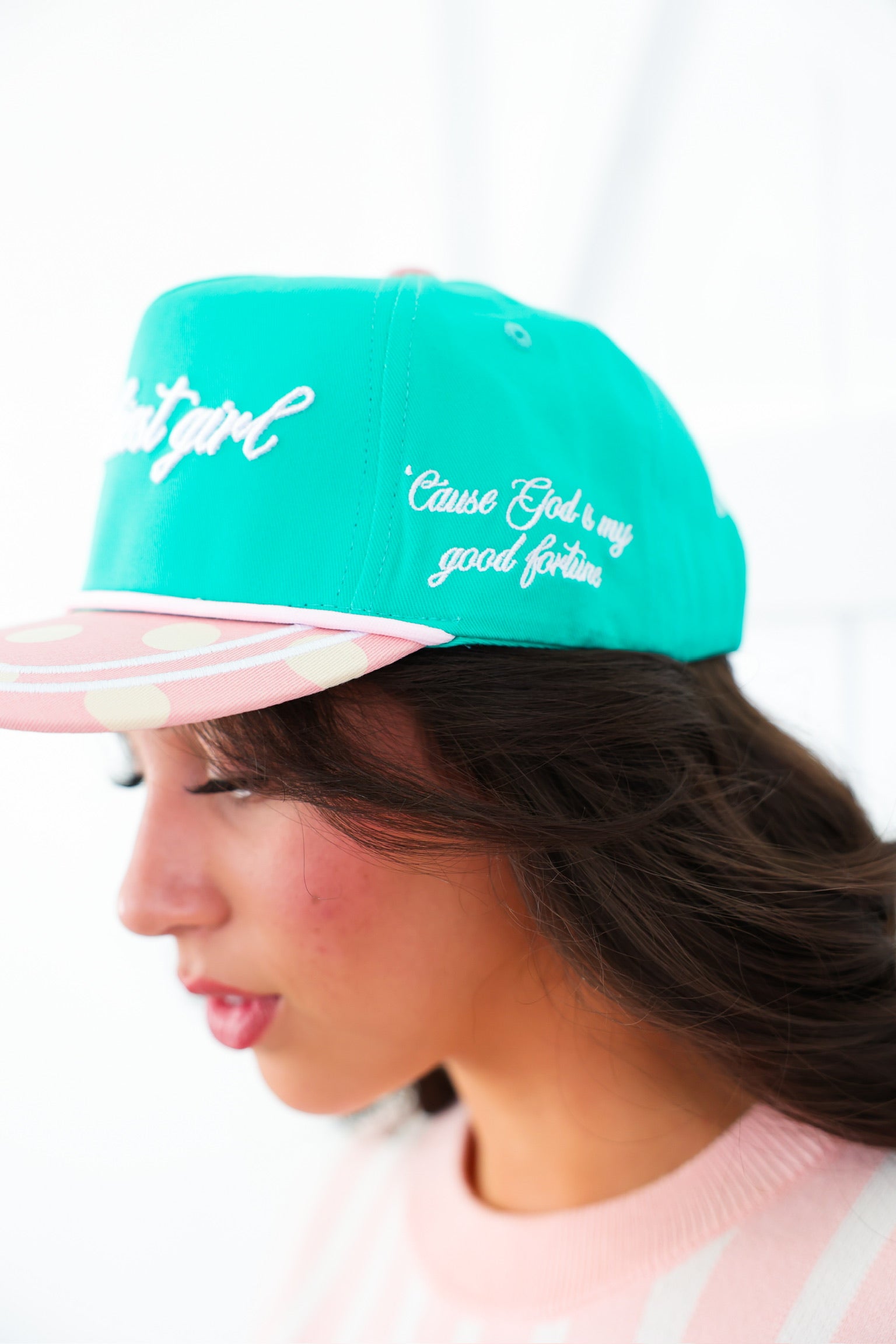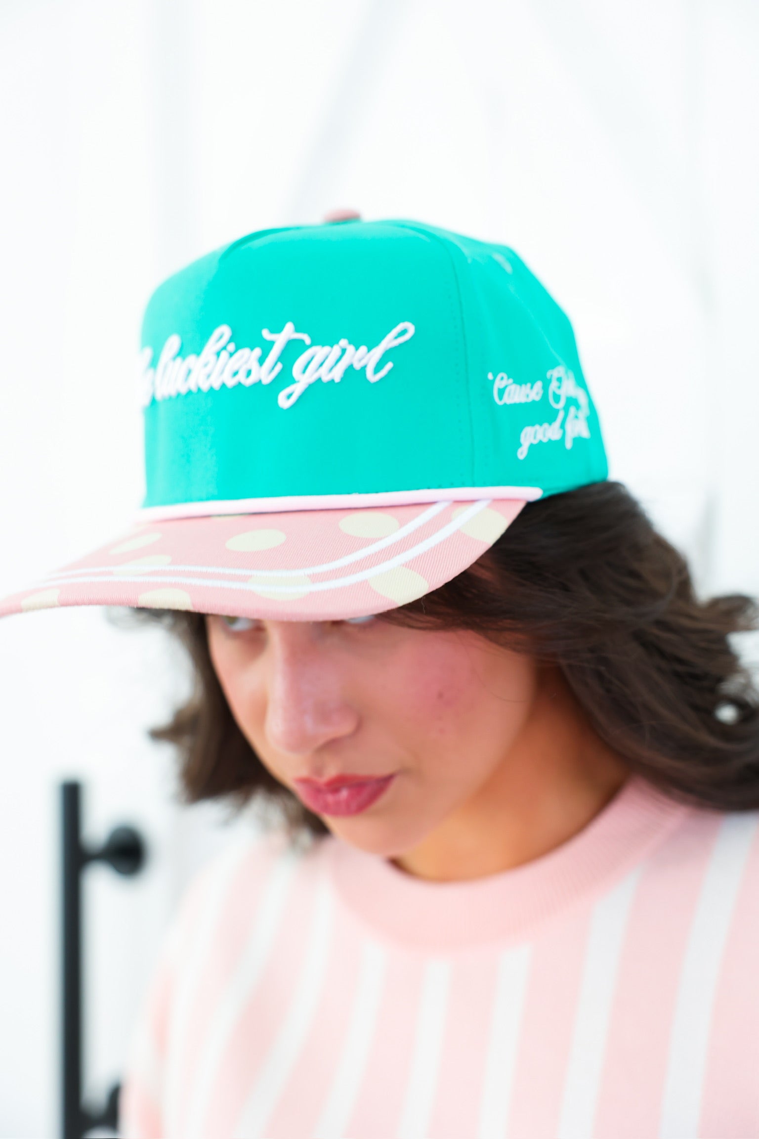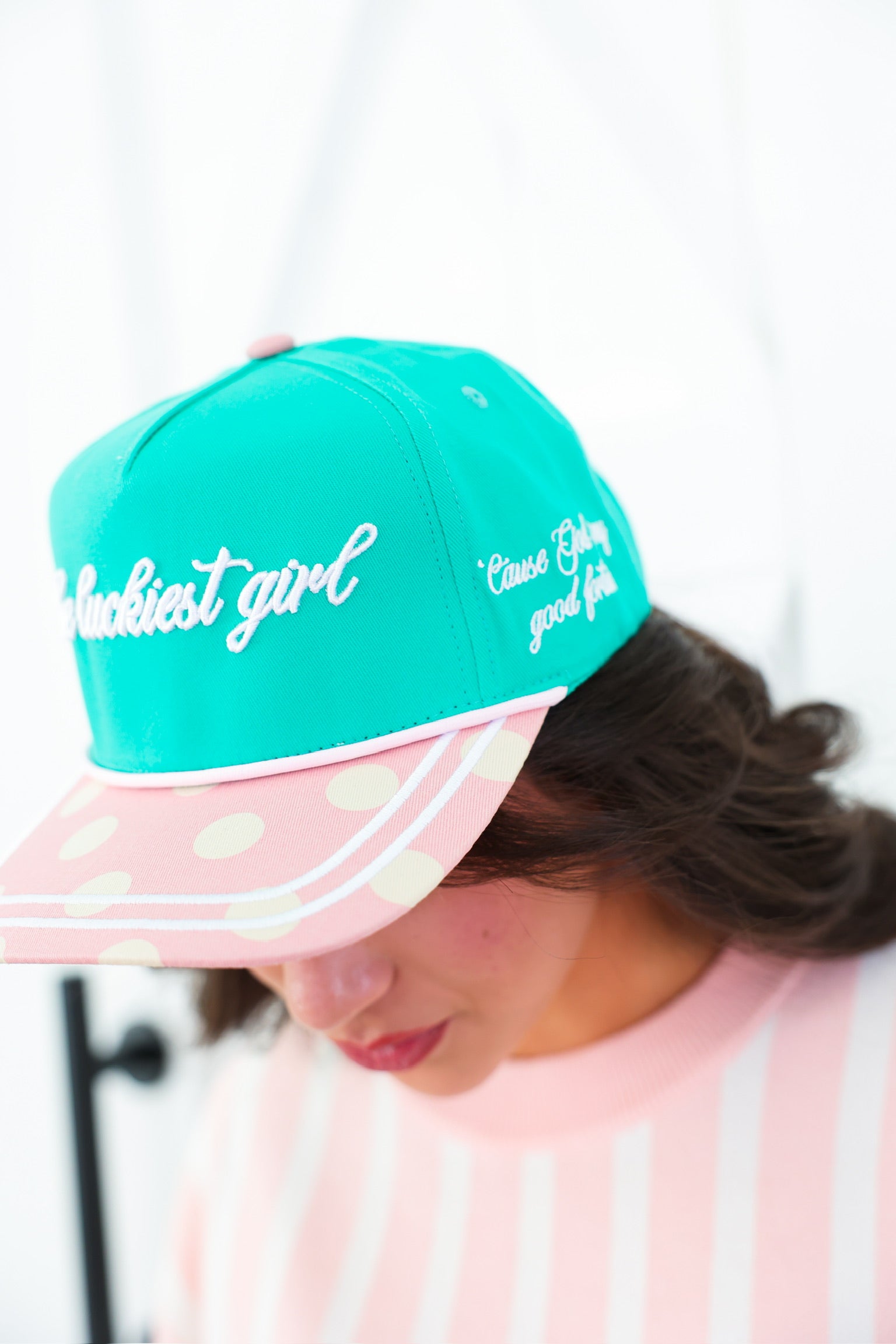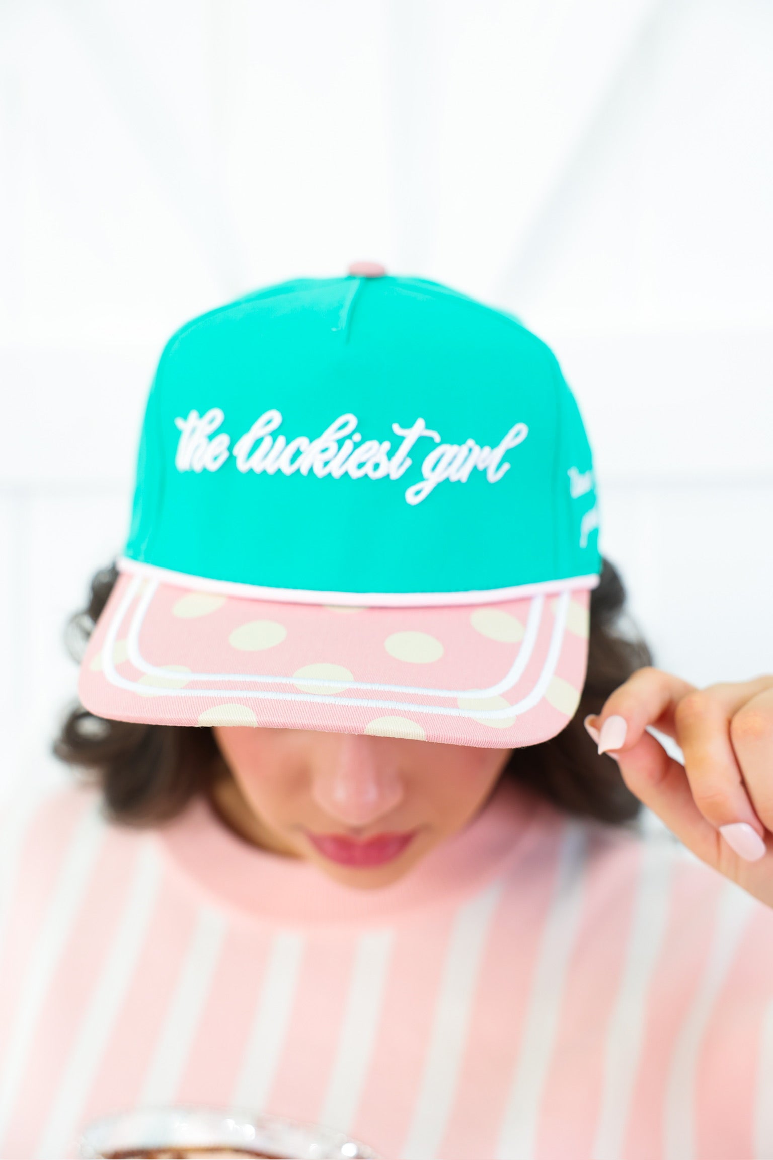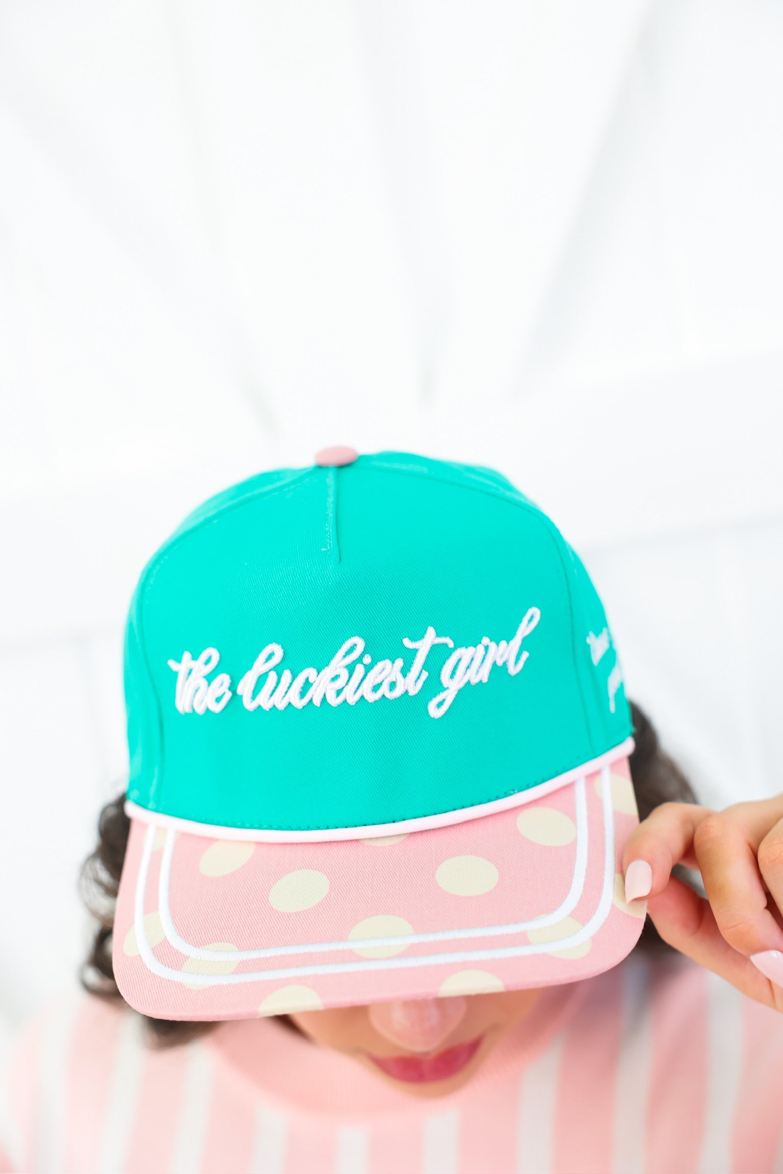 Add a pop of color and charm to your everyday look with our “The Luckiest Girl” Trucker Hat — the ultimate statement accessory for sunny days, casual errands, and boutique-girl style. Featuring a vibrant turquoise crown with playful script embroidery and a soft pink polka dot brim, this hat brings the perfect mix of sporty and sweet to any outfit.