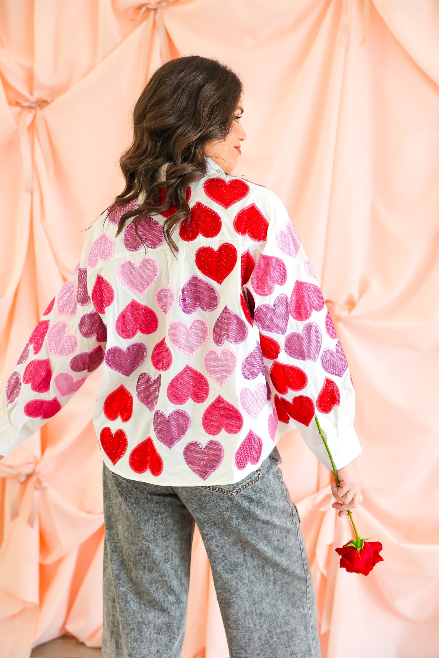 Queen of Sparkles White Multi Rhinestone Hearts Button Up Cotton Top