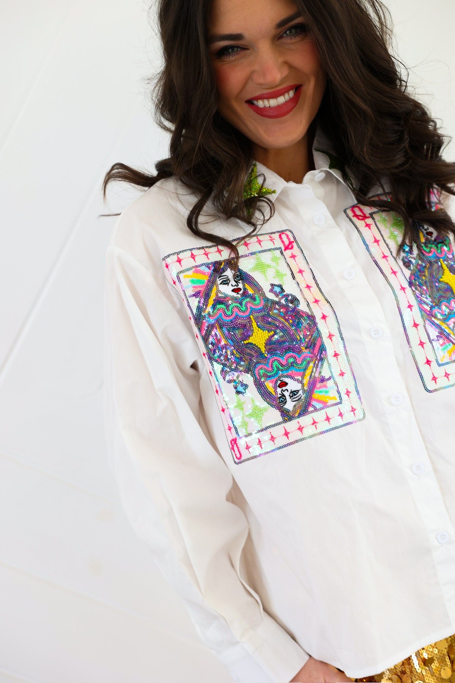 Queen of Sparkles White Queen Card & Sparkle Collar Button Up Cotton Top