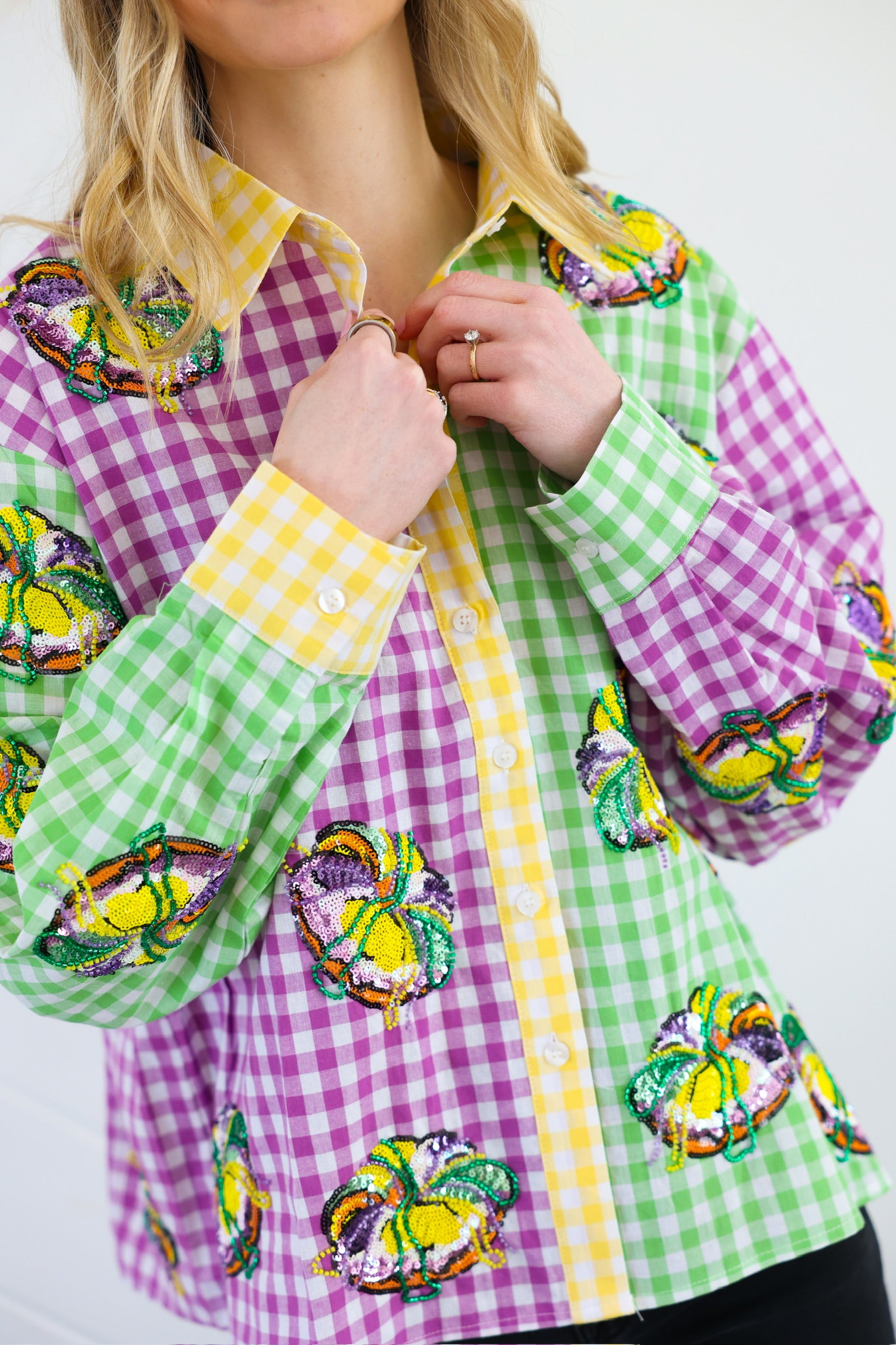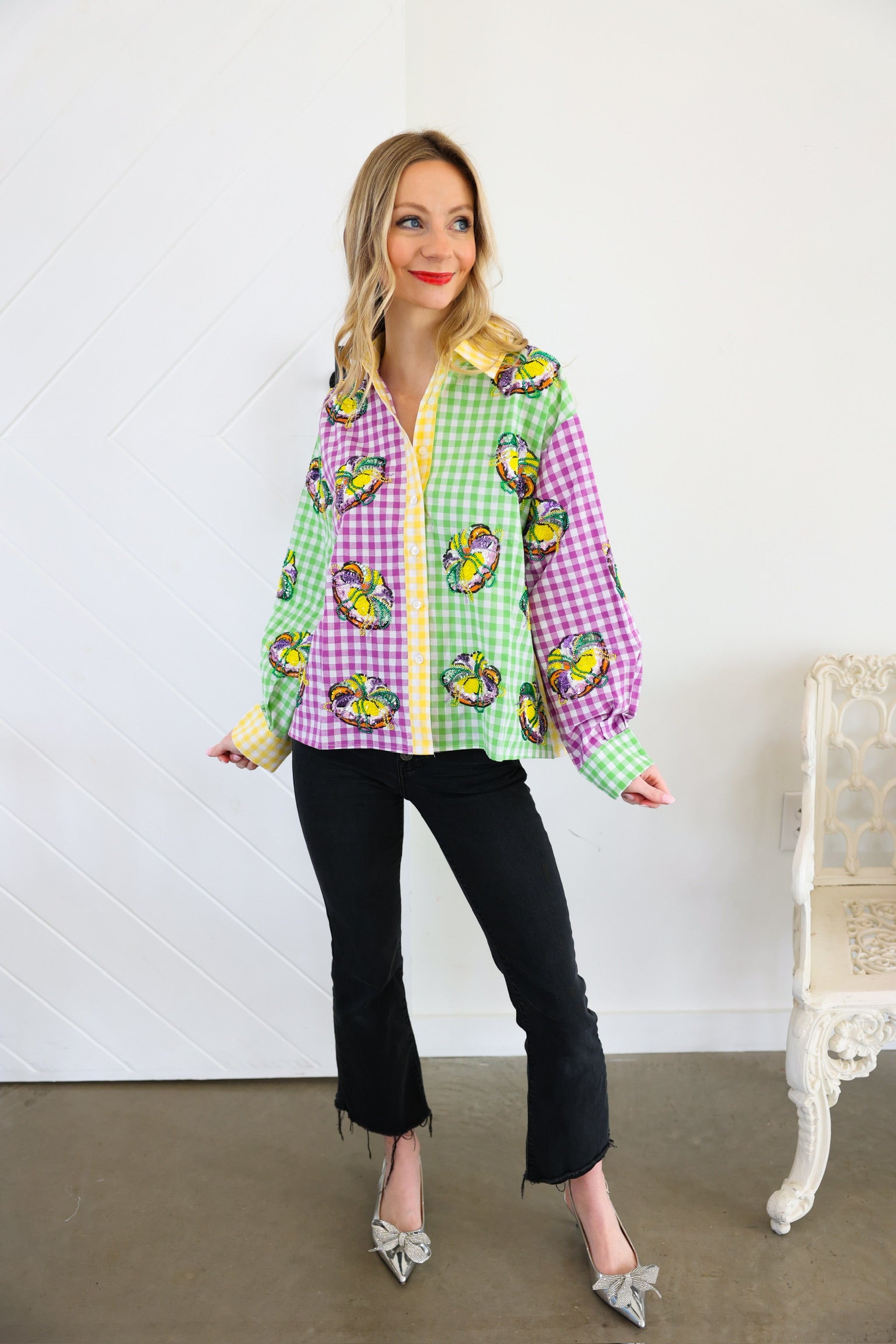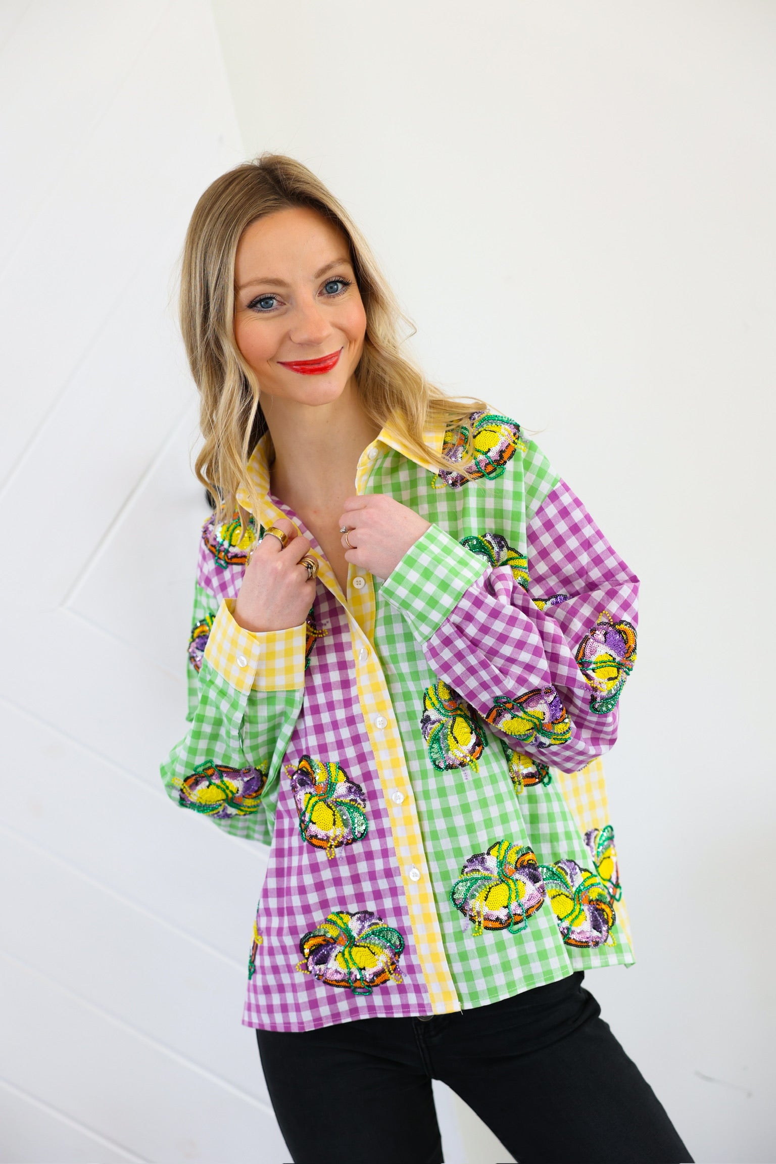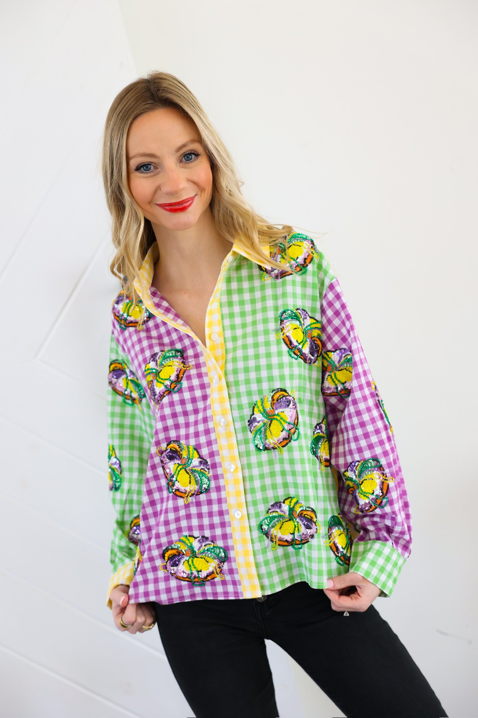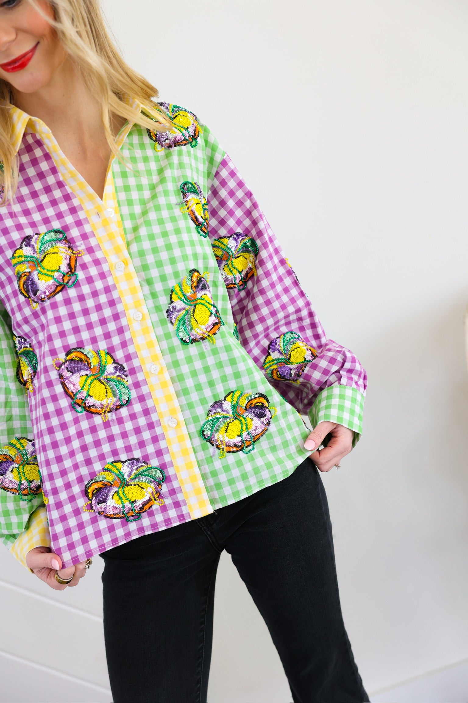 Colorblock Mardi Gras Gingham King Cake Button Up Top Queen of Sparkles