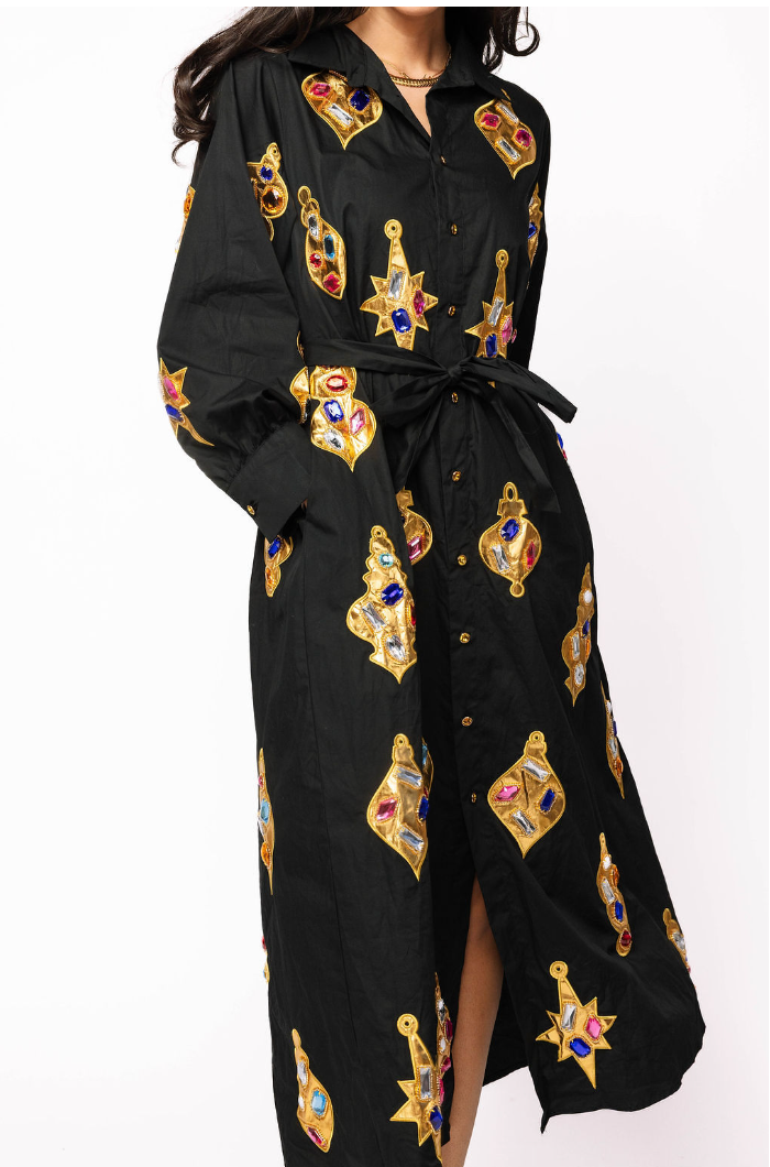 Make a stunning statement this holiday season with the Black & Gold Jeweled Ornament Cotton Tie Midi Dress, designed for the Queen of Sparkles. Crafted from breathable cotton, this elegant midi dress features shimmering gold ornament details and a flattering tie waist for a perfect fit. Whether at a festive party or a special evening out, it effortlessly combines comfort and glamour to ensure you shine with confidence!