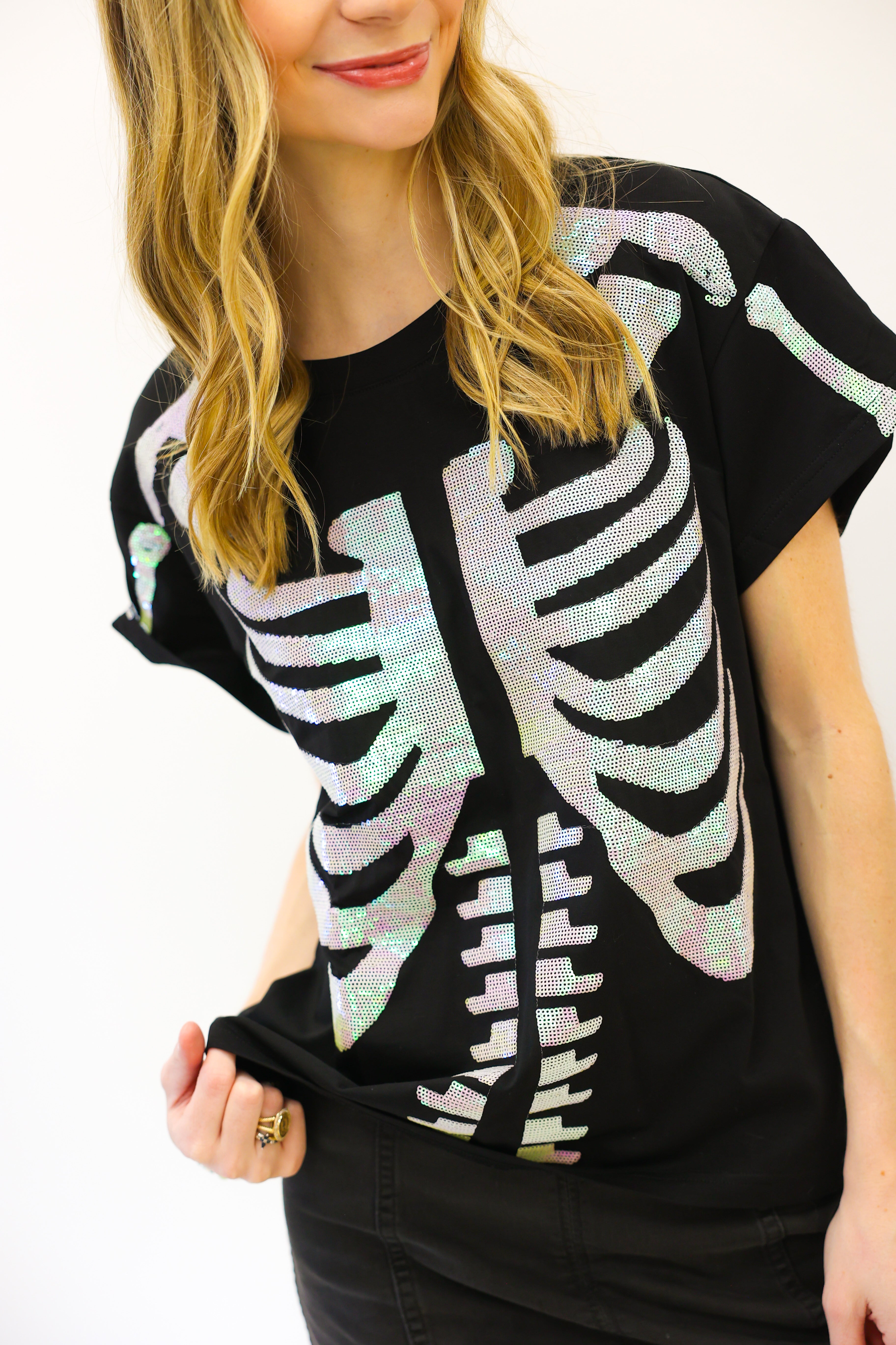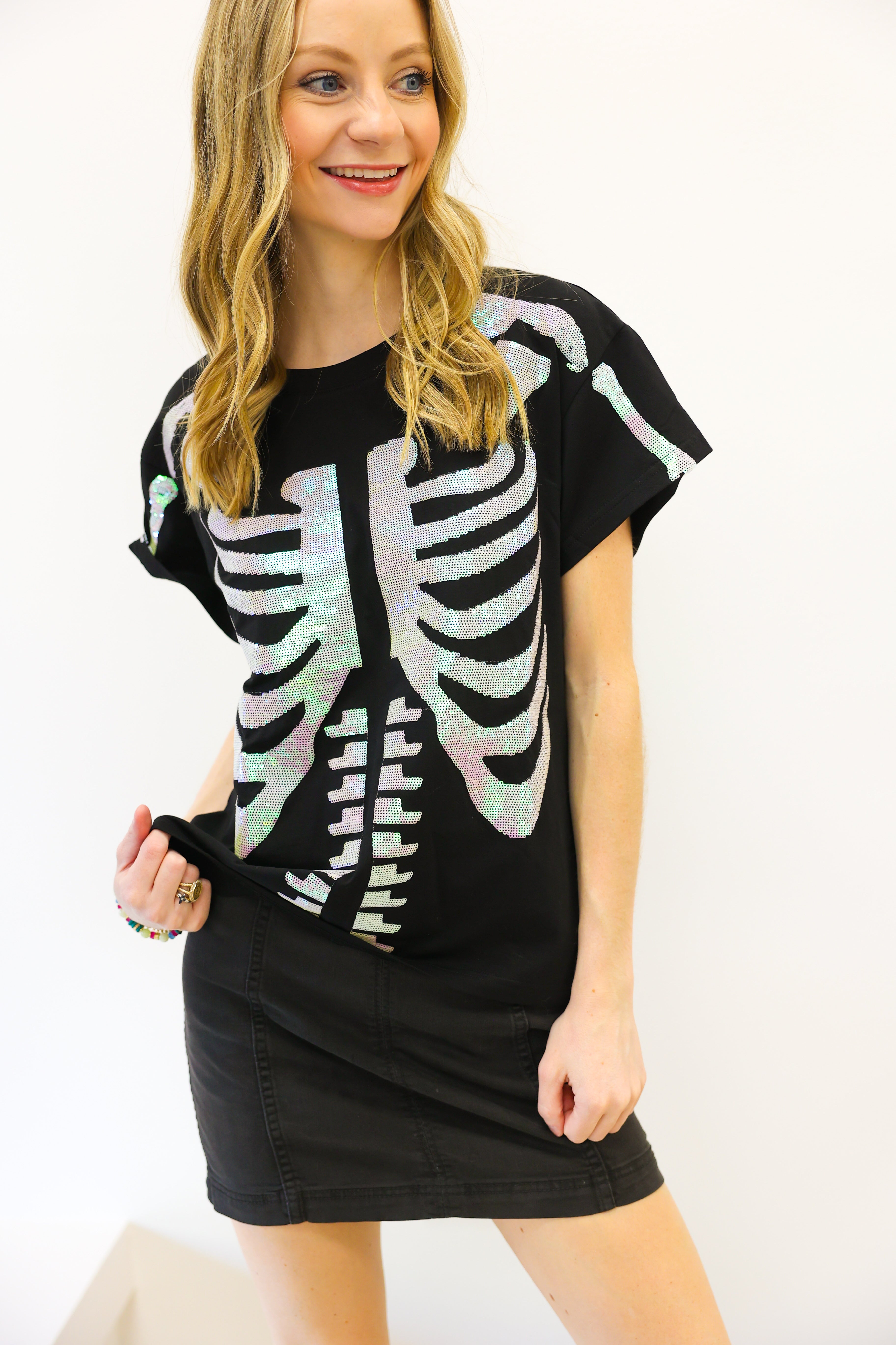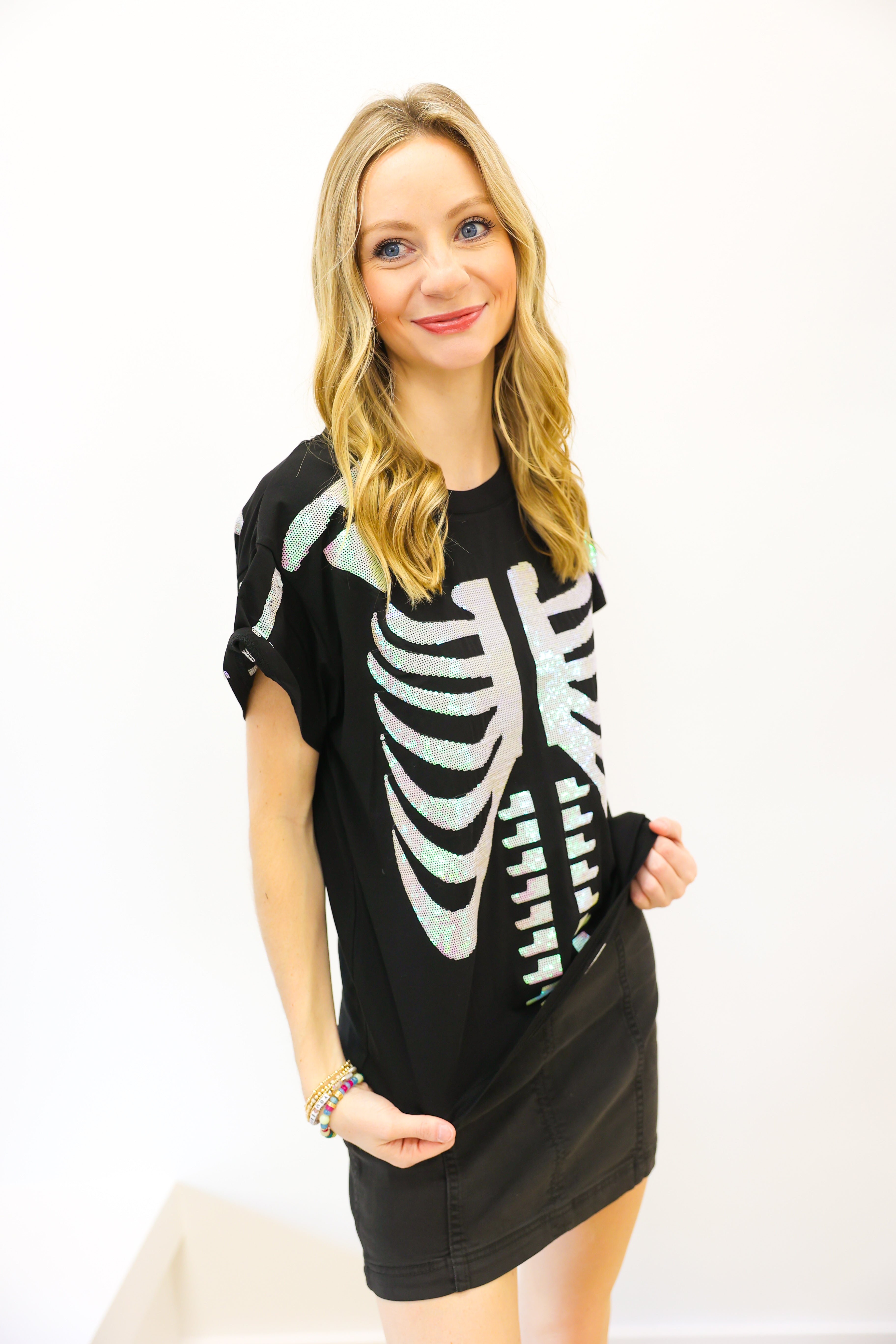 Celebrate Halloween with the Black & White Skeleton Tee Queen of Sparkles. This eye-catching tee combines spooky skeleton graphics with a touch of sparkle, perfect for standing out at any Halloween event. Comfortable and stylish, it’s an ideal choice to show off your festive spirit with flair. Embrace the season while staying on-trend and cozy!