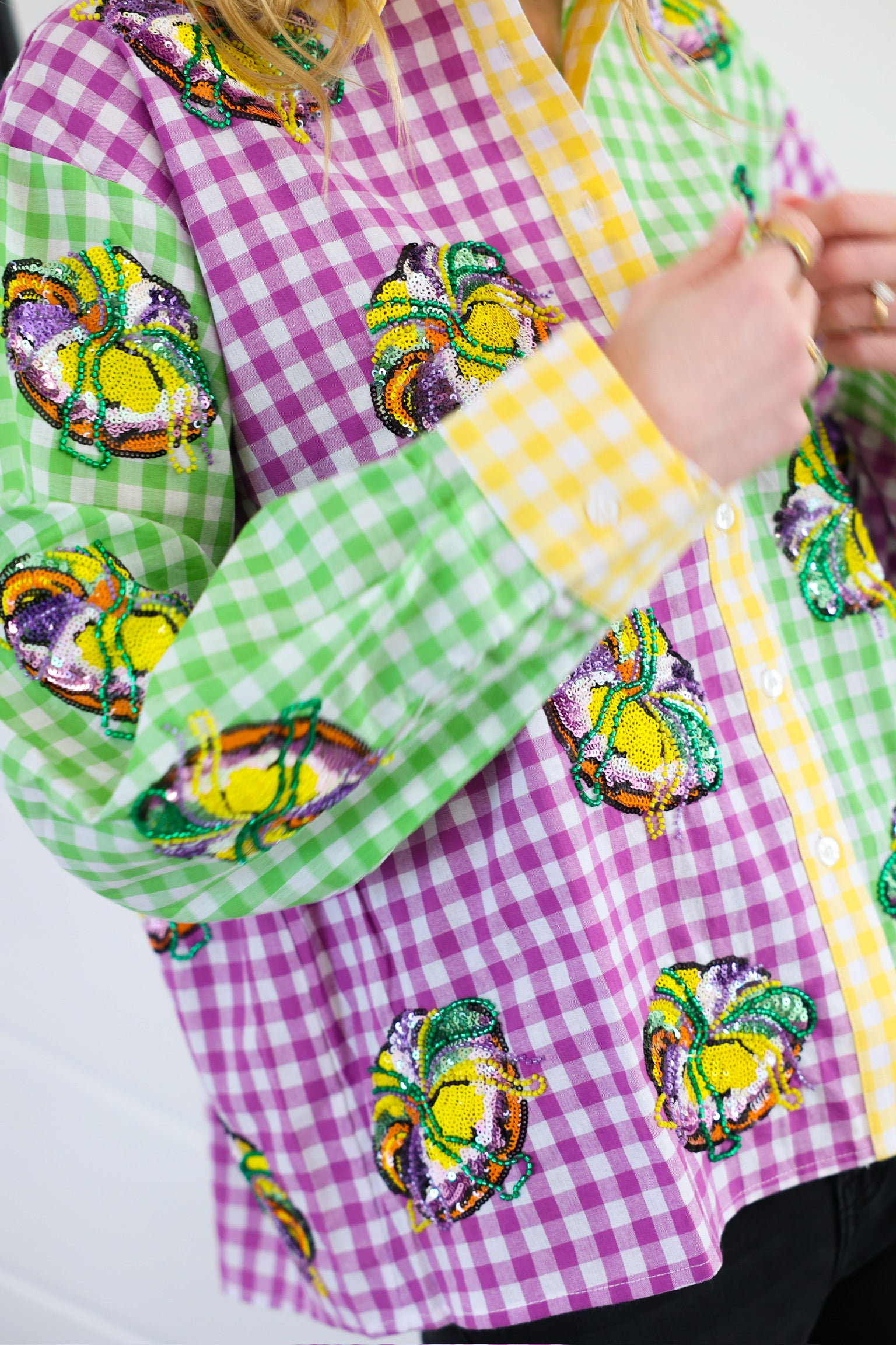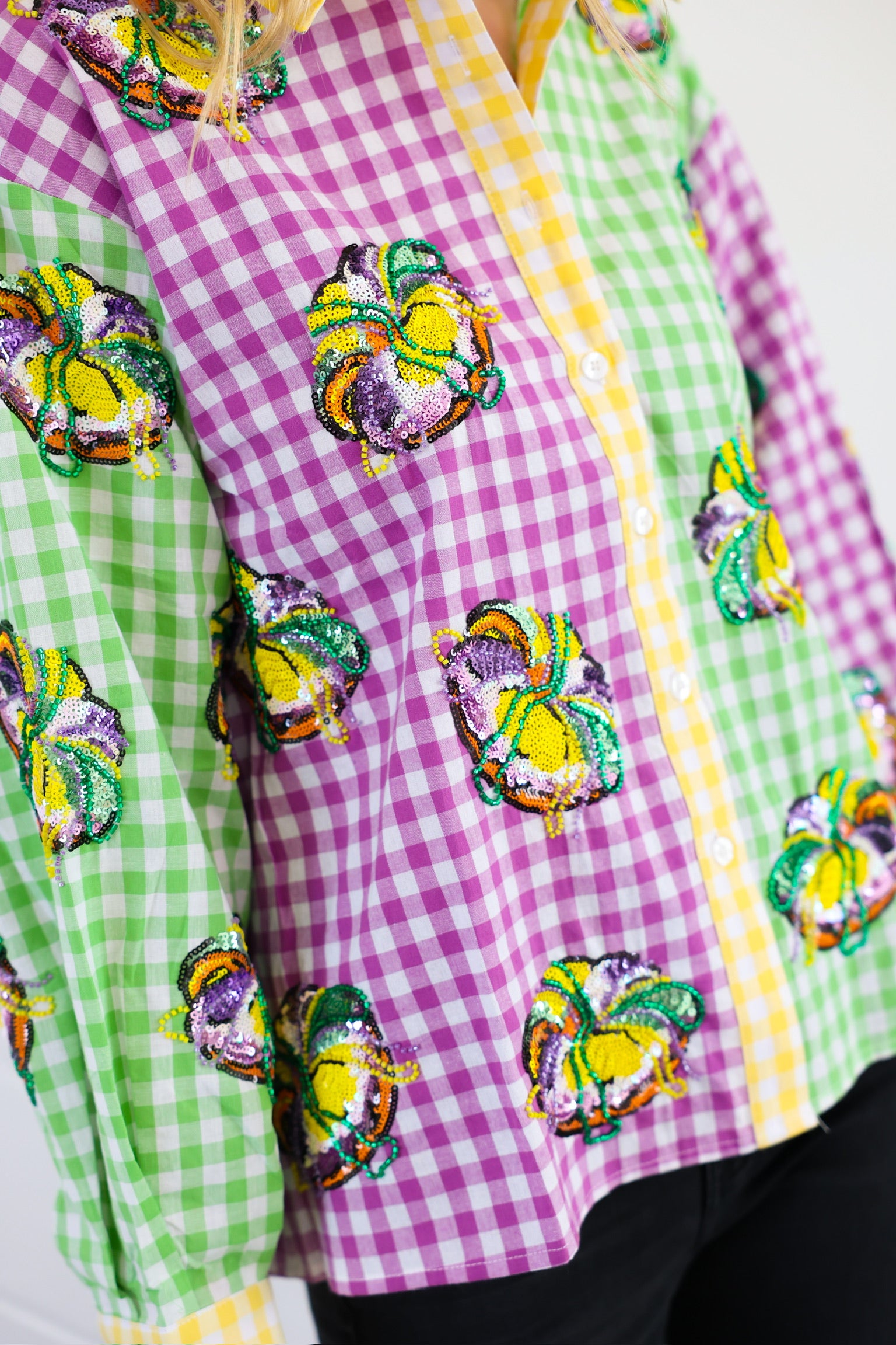 Colorblock Mardi Gras Gingham King Cake Button Up Top Queen of Sparkles