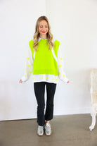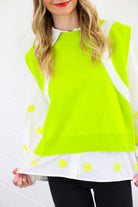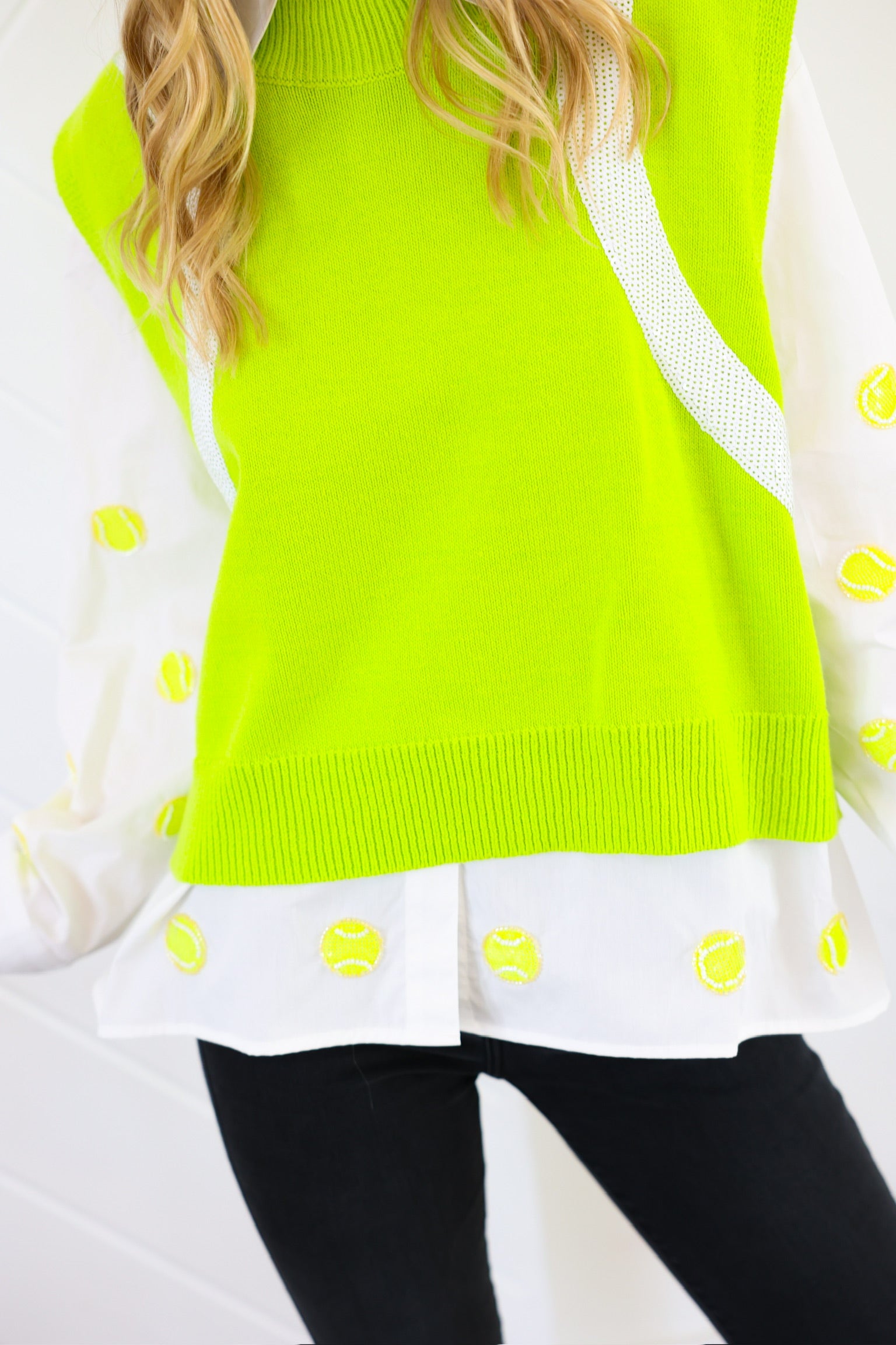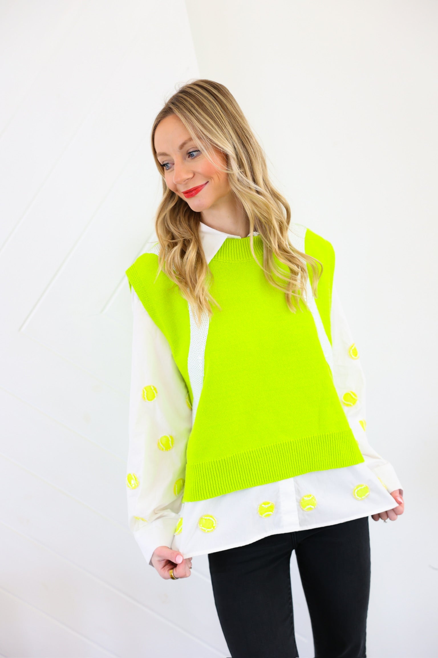 Serve up major style points with this playful yet elevated sweater vest from Queen of Sparkles 💚✨ Inspired by classic tennis aesthetics with a bold, fashion-forward twist, this fluorescent yellow sweater vest features sporty contrast paneling that gives a subtle nod to tennis ball detailing—without being over the top.