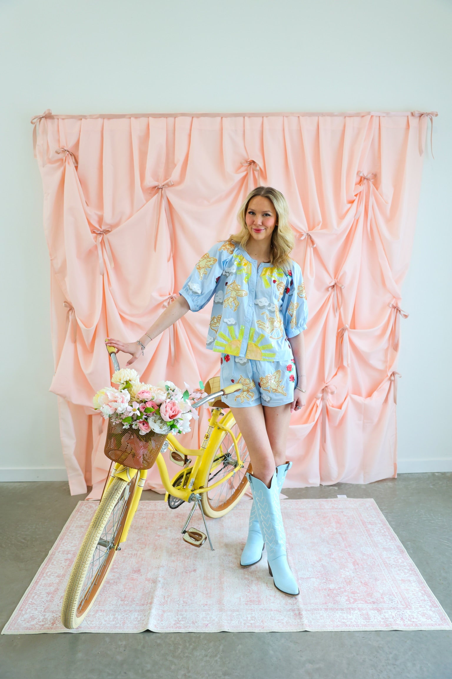 Fall head over heels for this whimsical, romantic statement top from Queen of Sparkles 💙✨ The Light Blue Cupid in the Sky Cotton Button Up Top features playful embroidered cupids, clouds, hearts, and golden sunburst details that bring dreamy charm and signature sparkle to life. Designed in a soft cotton base with a relaxed silhouette, this piece is equal parts artistic and wearable.
