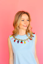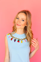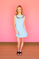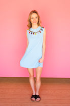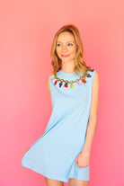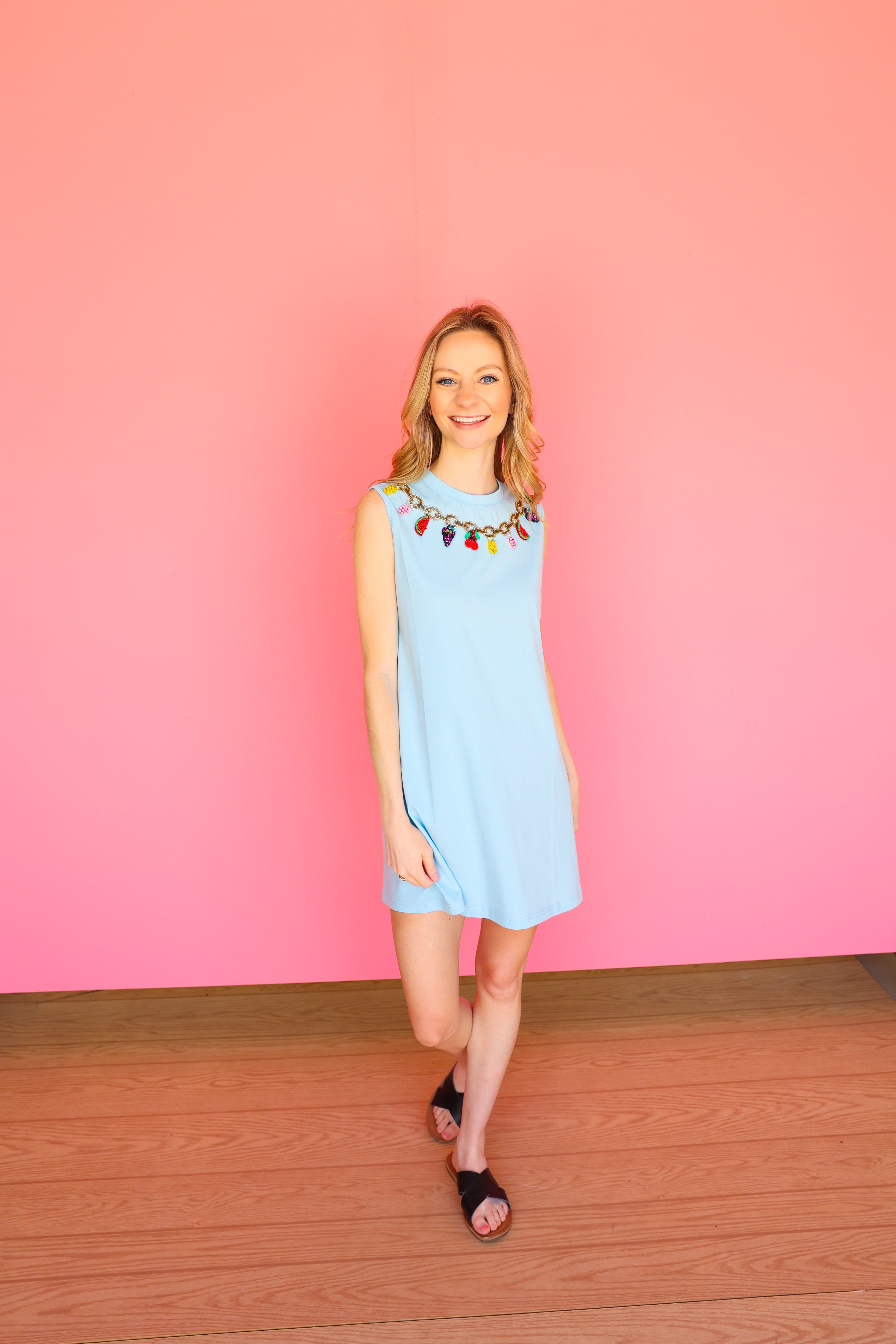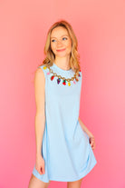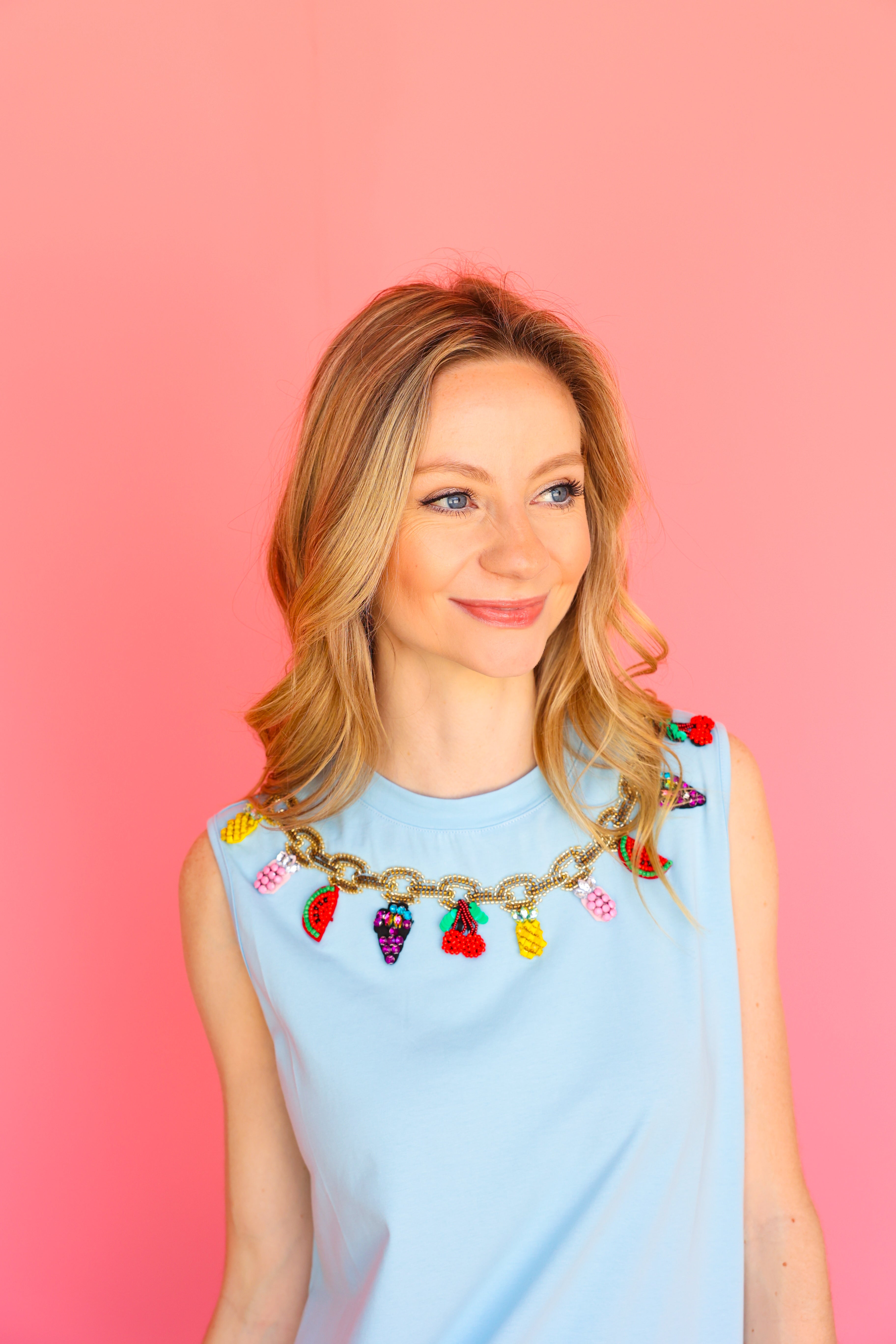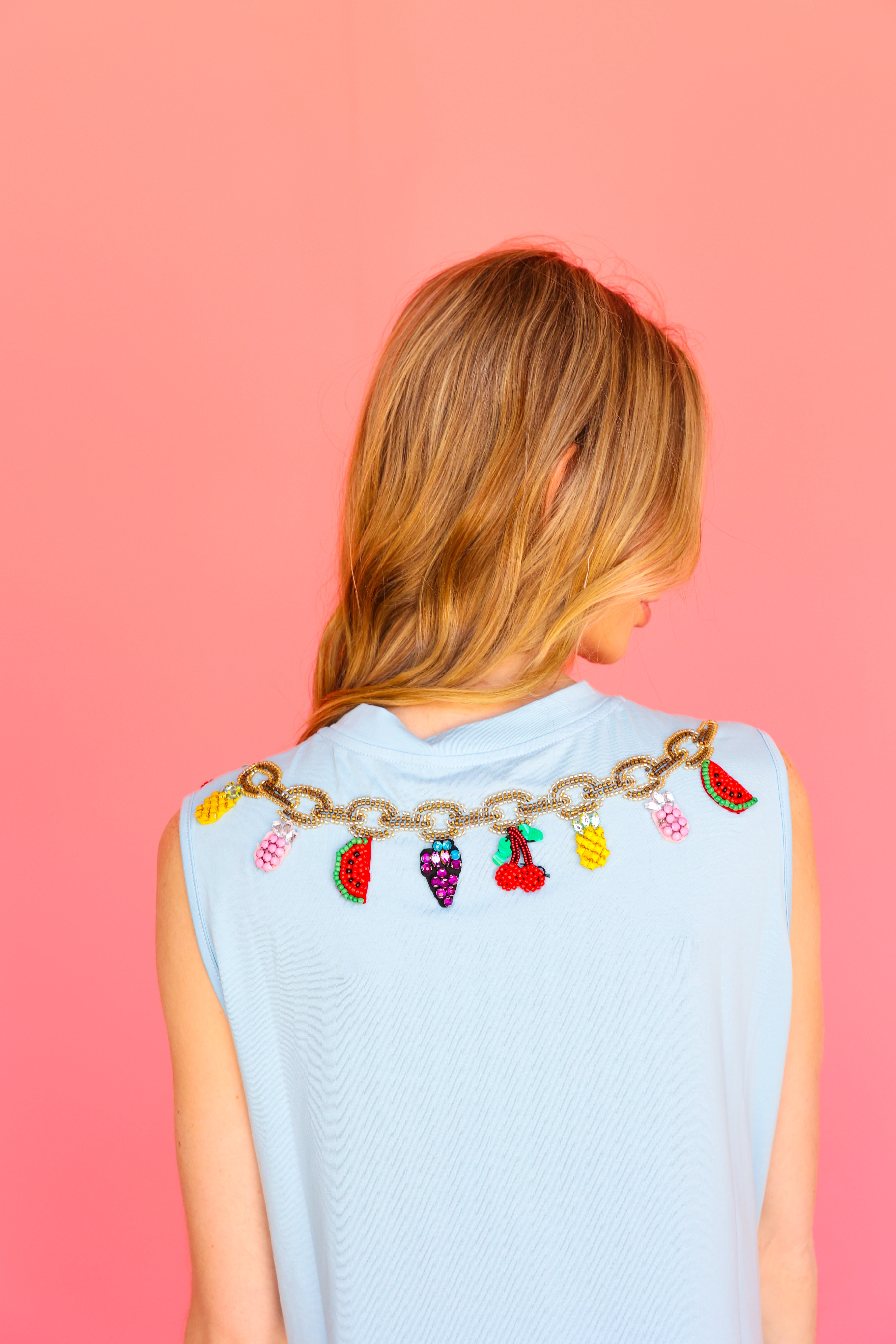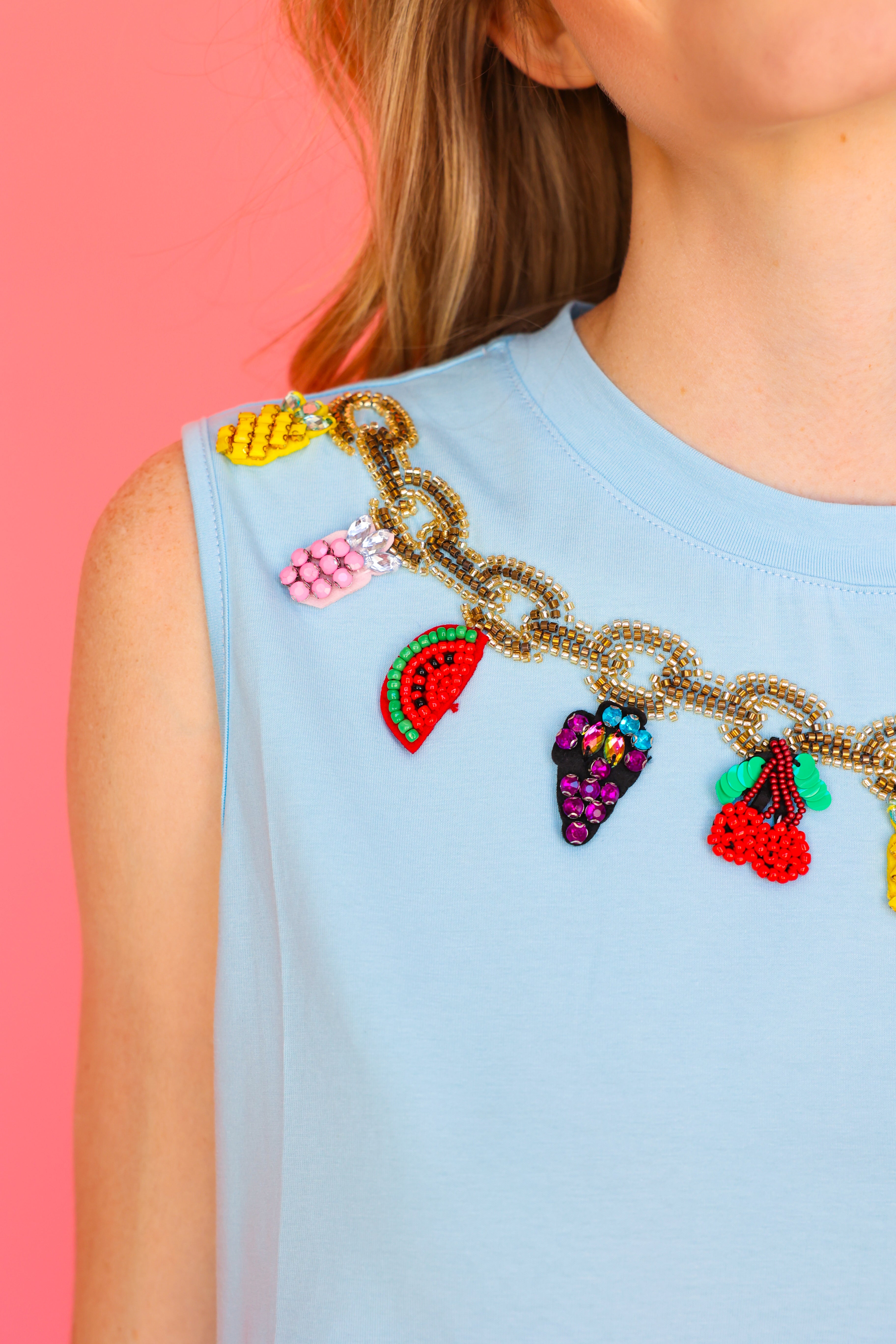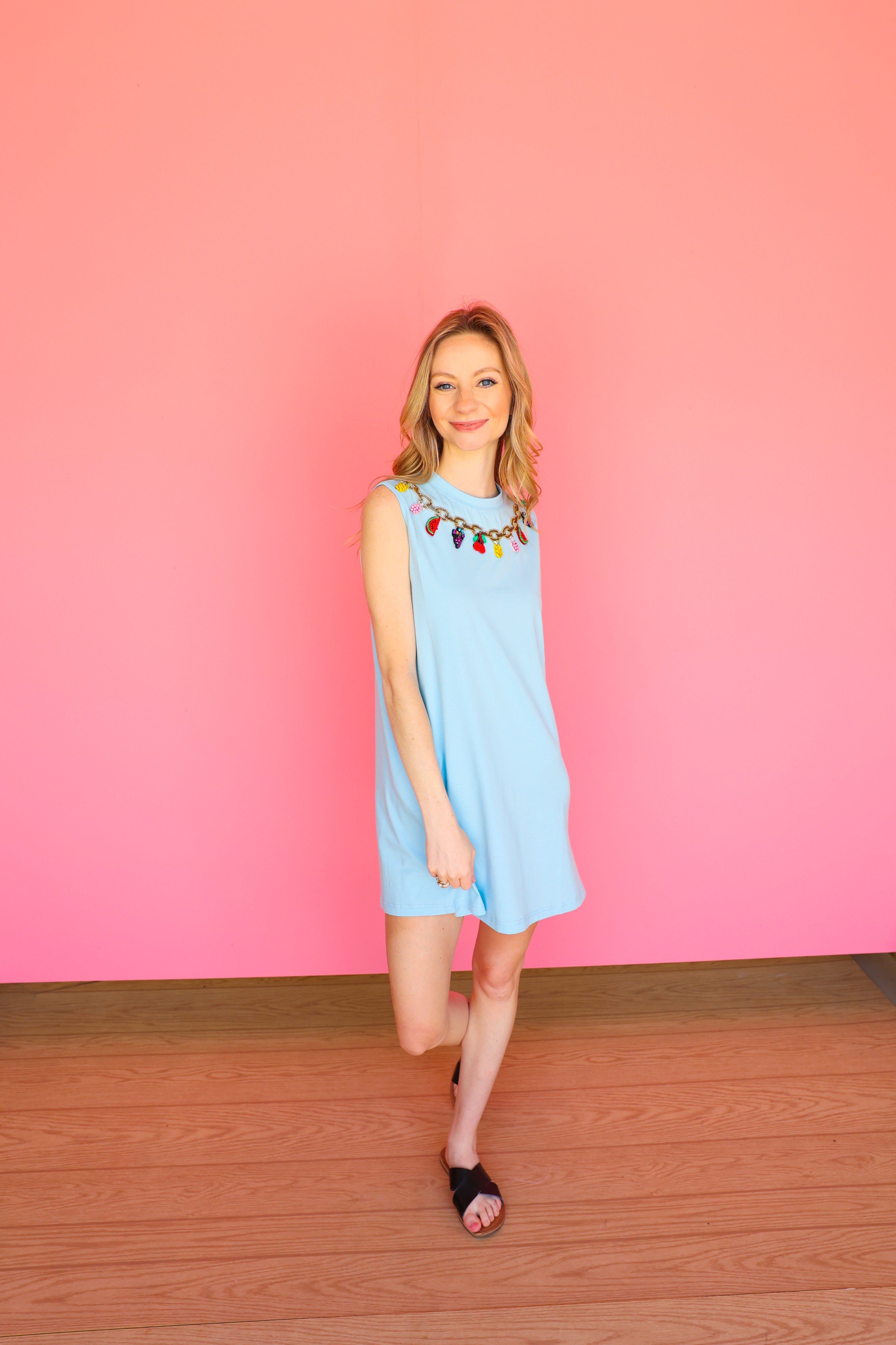 Experience the ultimate combination of fashion and fun with our Queen of Sparkles Light Blue Fruit Charm Necklace Tank Dress. Featuring jeweled fruit charms on a mock necklace, including grapes, oranges, strawberries, cherries, bananas and more, this dress is perfect for a spring day out shopping. Look stylish and unique with this one-of-a-kind piece!