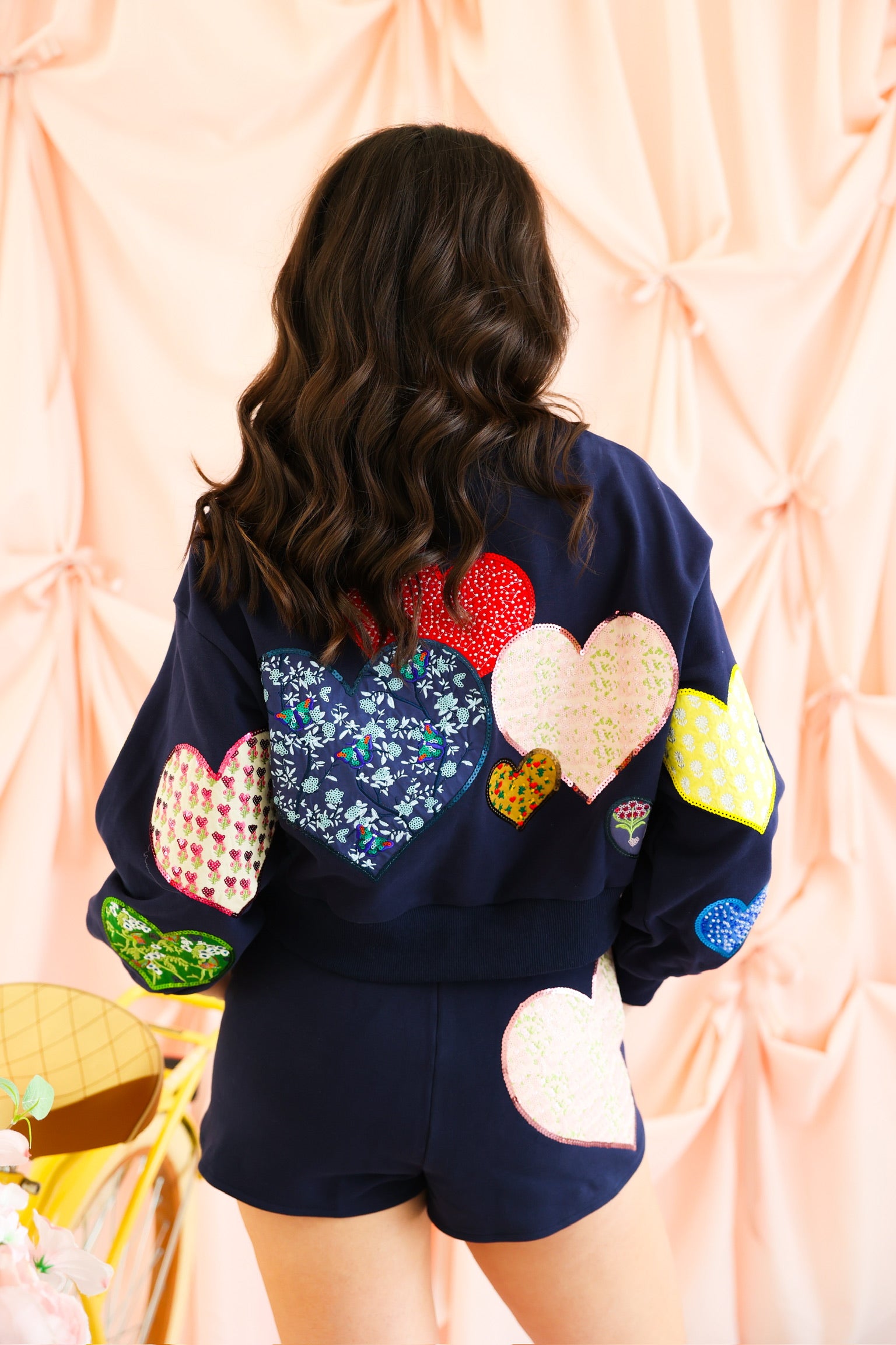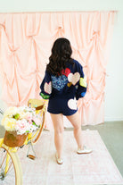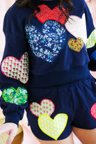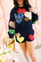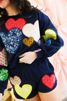 Double the love 💖 The Queen of Sparkles Navy Multi Embroidered Hearts Shorts are the perfect finishing touch to your sparkle-filled set. Designed in a rich navy base, these standout shorts feature oversized embroidered hearts in a mix of colors, patterns, and textures—each one adding its own dose of charm. Comfy, eye-catching, and undeniably fun, they’re made for lounging, layering, or making a bold Valentine-ready statement.