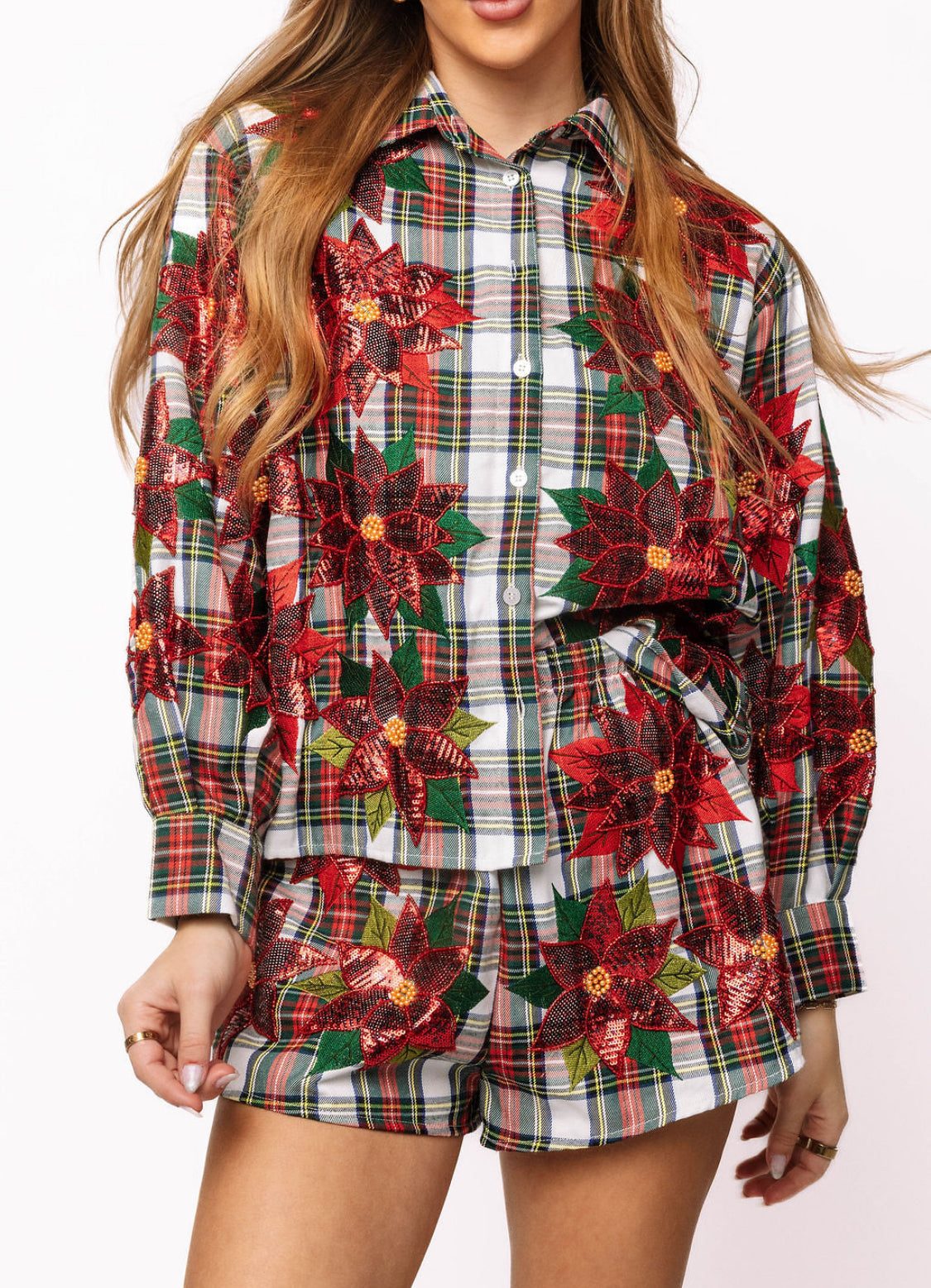 Red, Green & White Plaid Poinsettia Cotton Button Up Top Queen of Sparkles