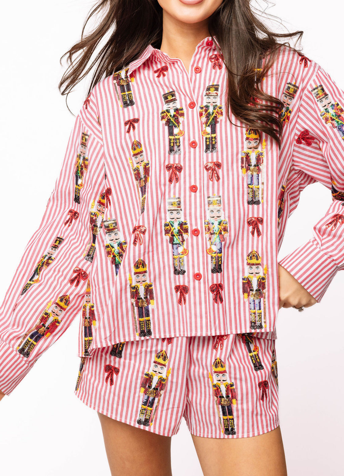 Red Stripe Scattered Nutcracker & Bow Cotton Button Up Top Queen of Sparkles