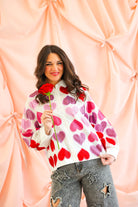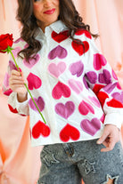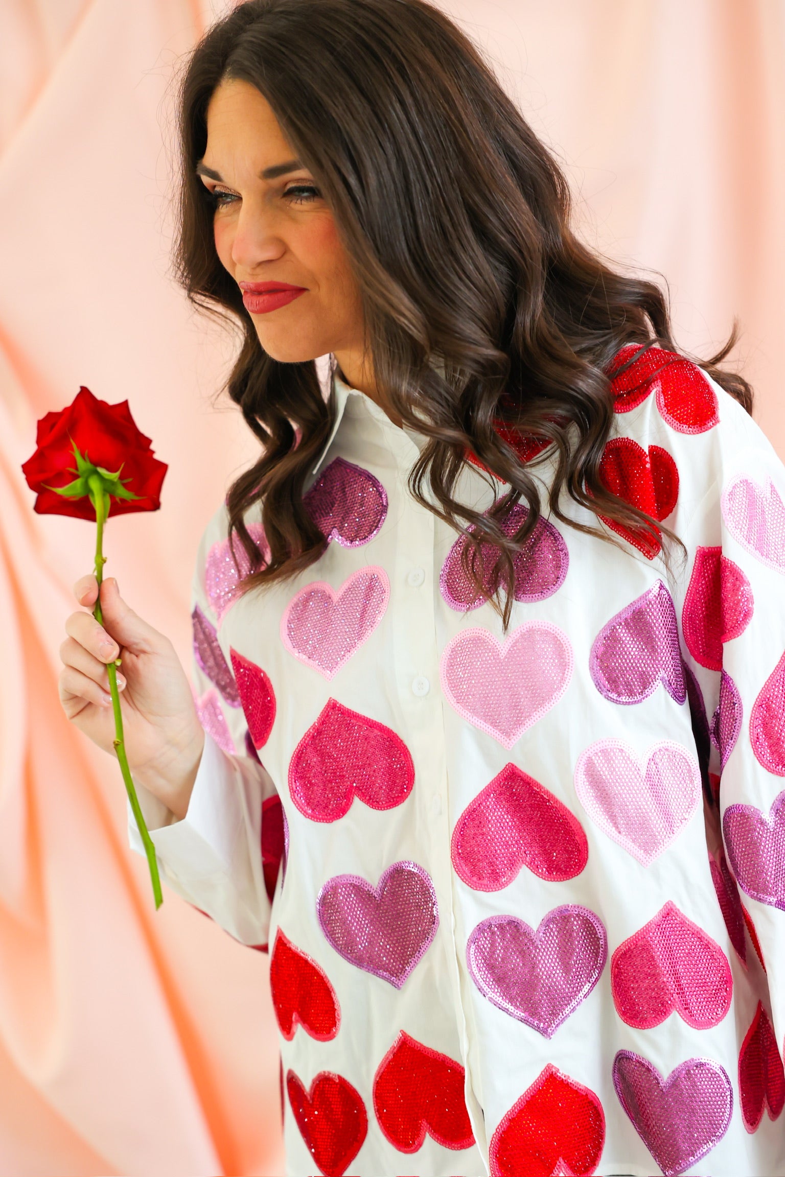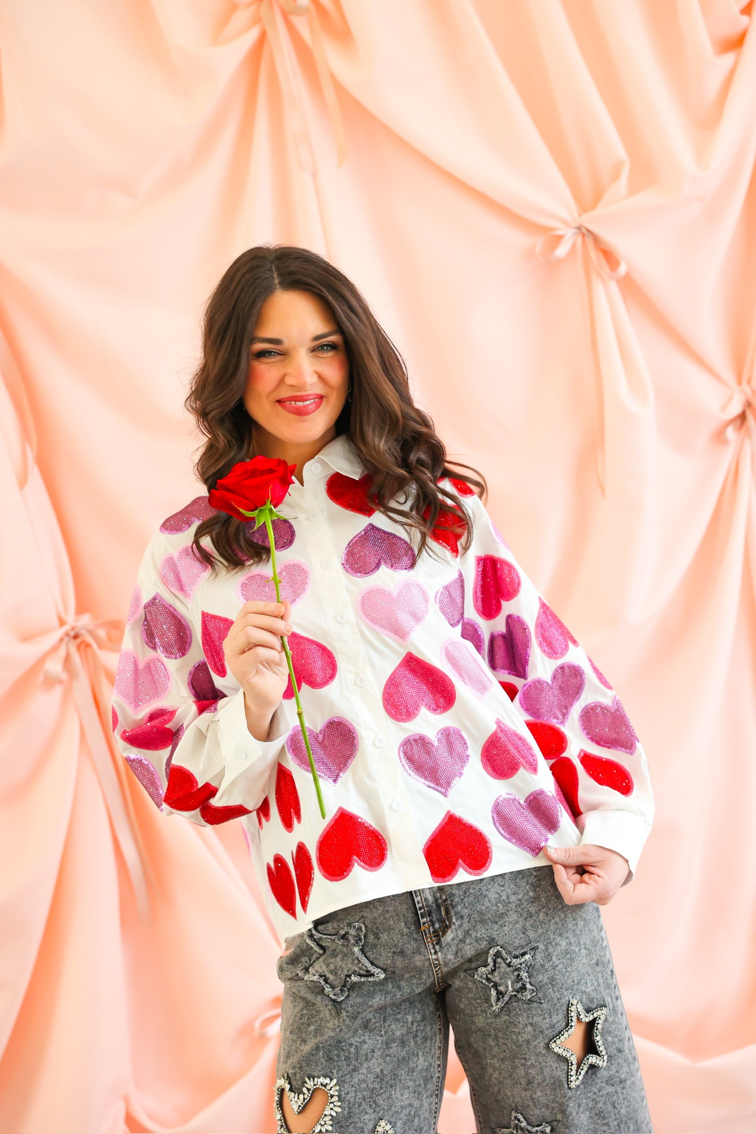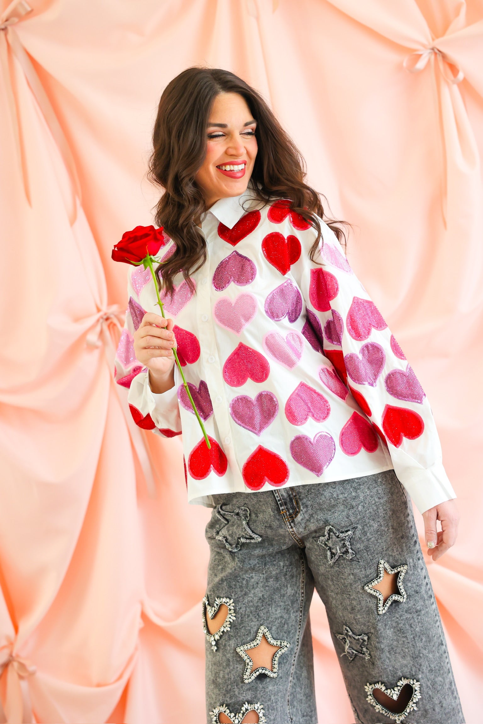 Fall head over heels for this statement-making button up from Queen of Sparkles. This crisp white cotton top is covered in oversized rhinestone heart embellishments in rich shades of red, pink, and purple, creating a bold, sparkling look that is equal parts playful and chic. The classic collared silhouette balances the glamour, making it easy to dress up or down.