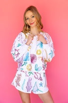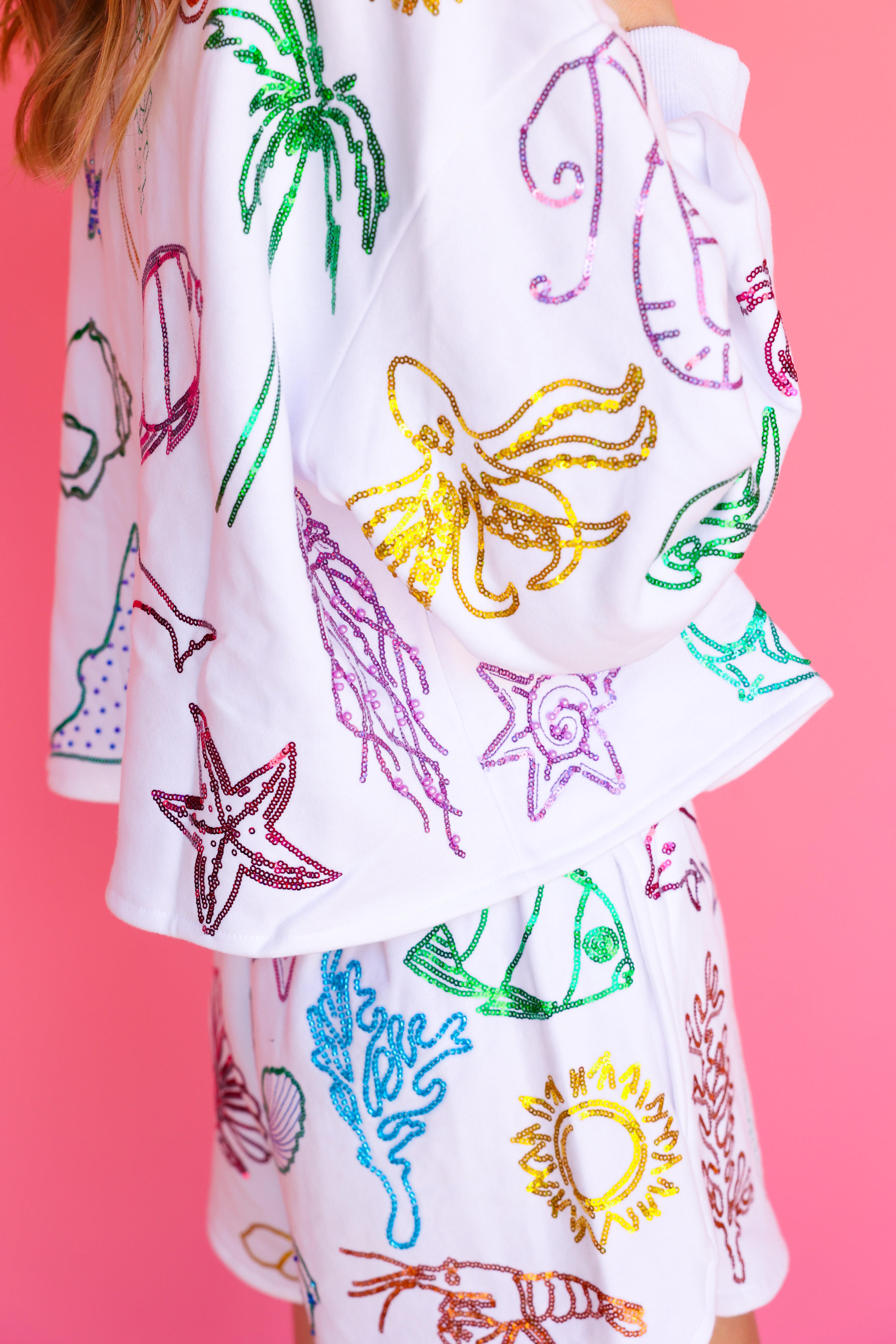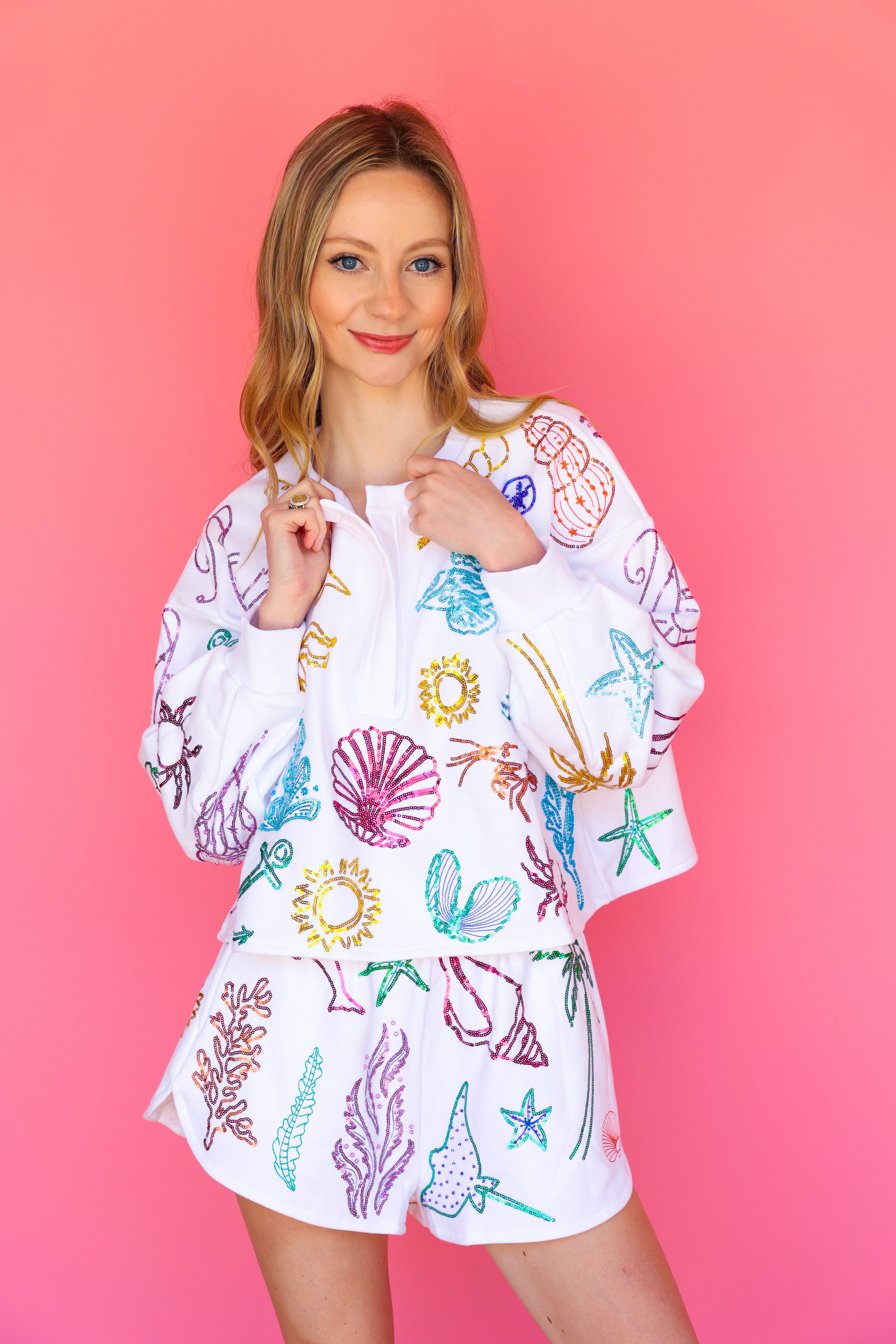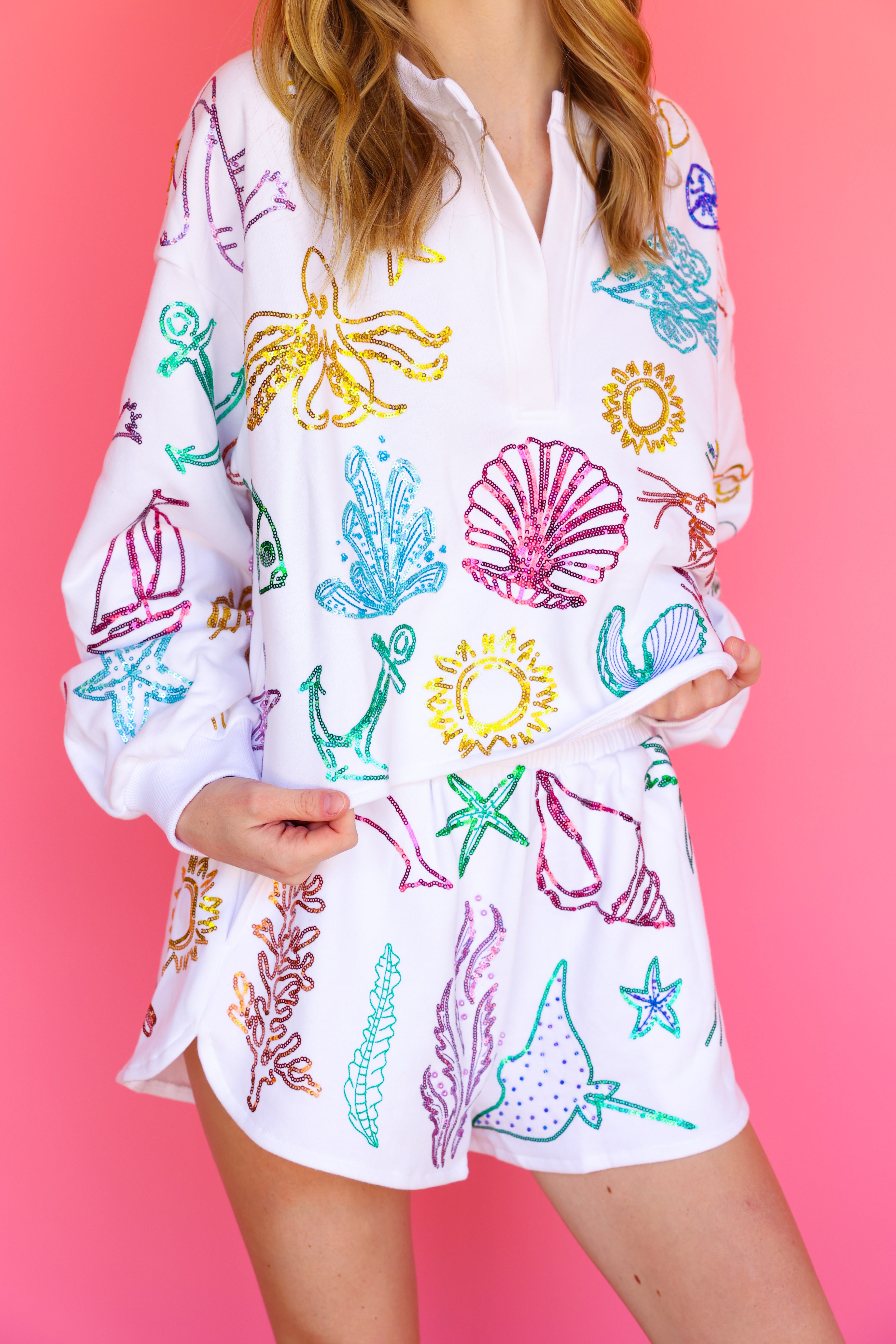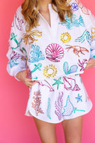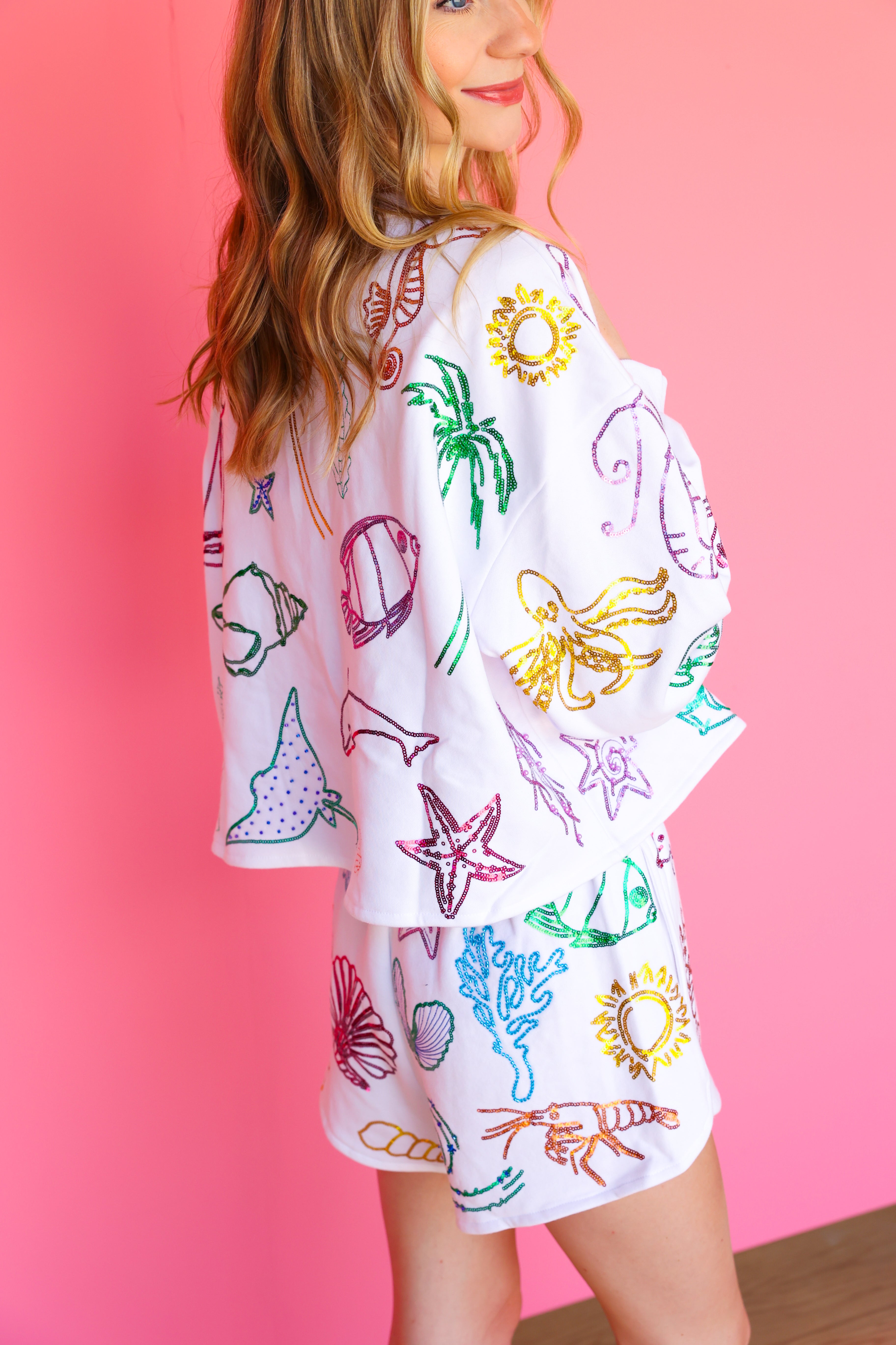 Dazzle and shine like the Queen of Sparkles in these white cotton shorts with colorful sequined sea icons. The perfect choice for a beach getaway, these shorts will add a touch of magic to your travel wardrobe. Get ready to make a splash and turn heads in this stunning outfit!