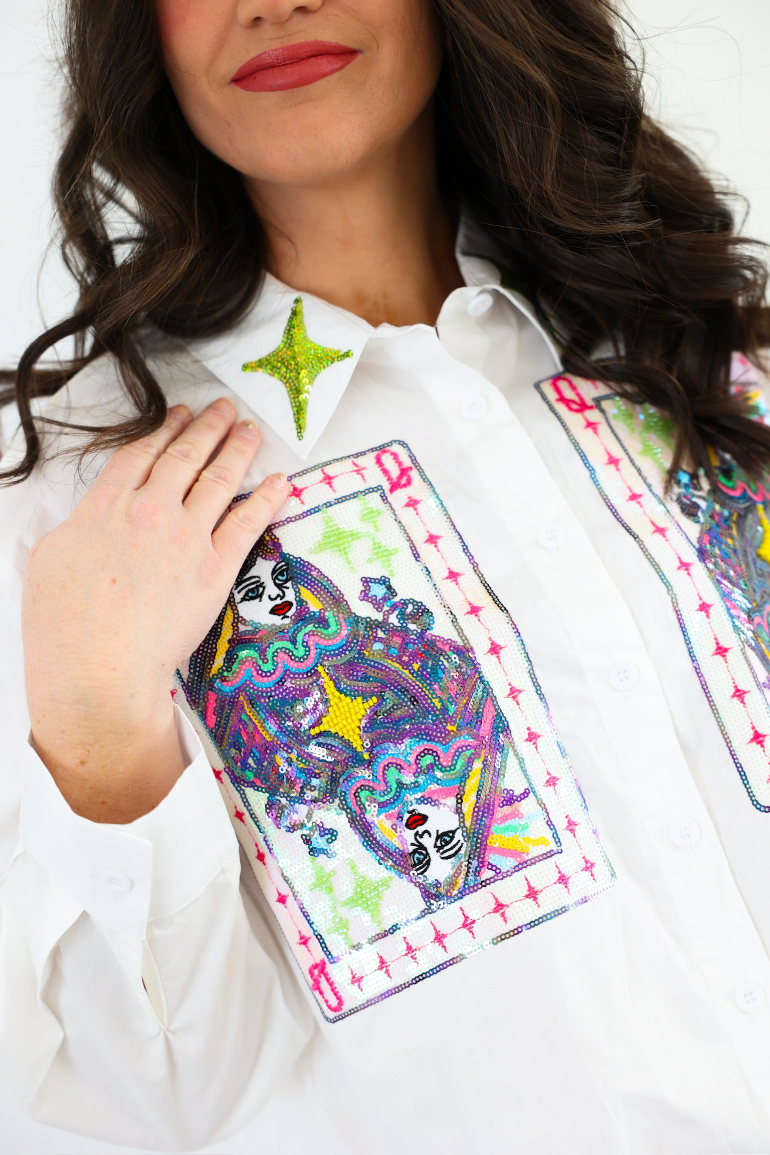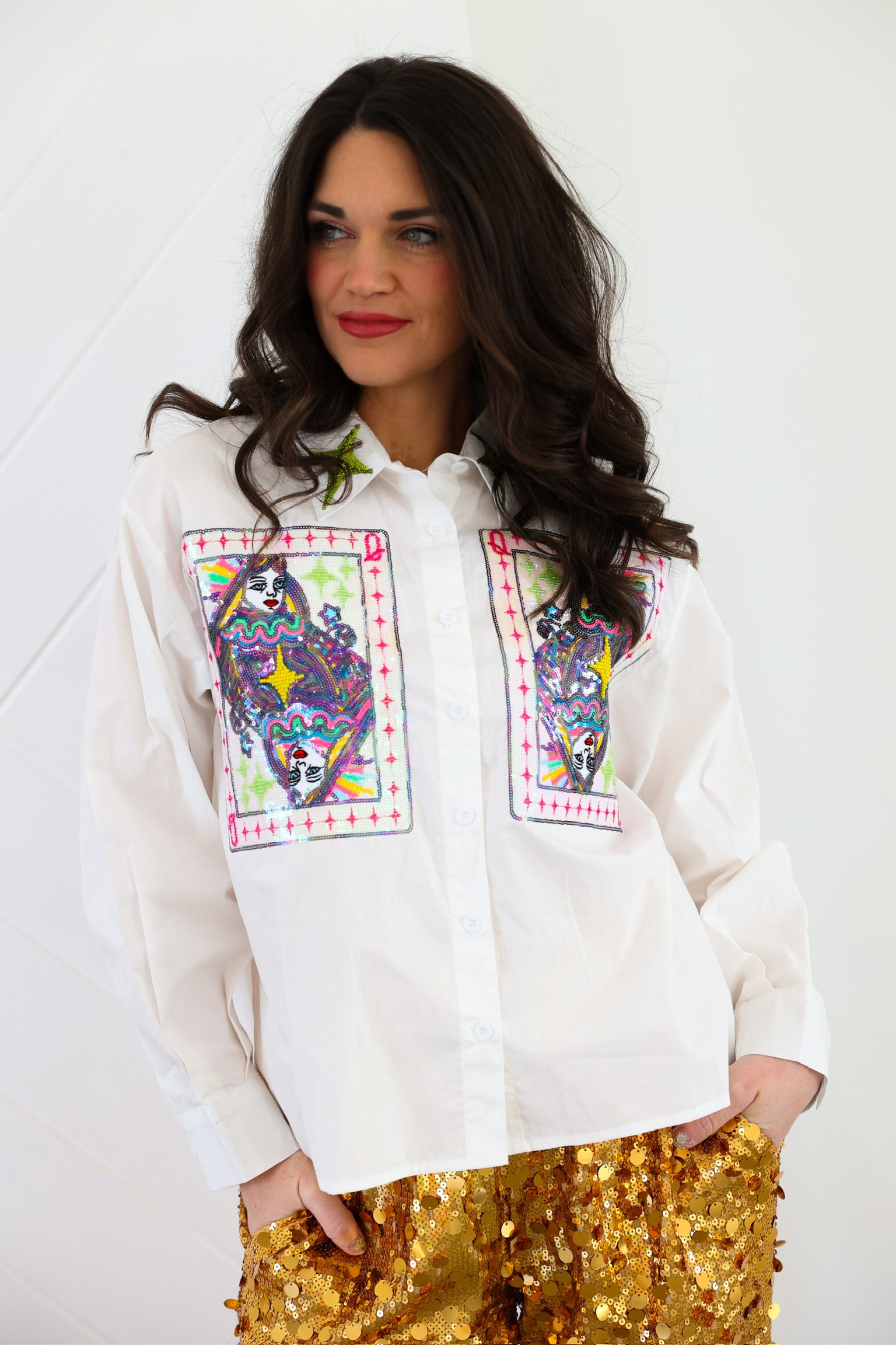 Queen of Sparkles White Queen Card & Sparkle Collar Button Up Cotton Top