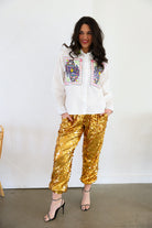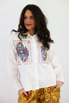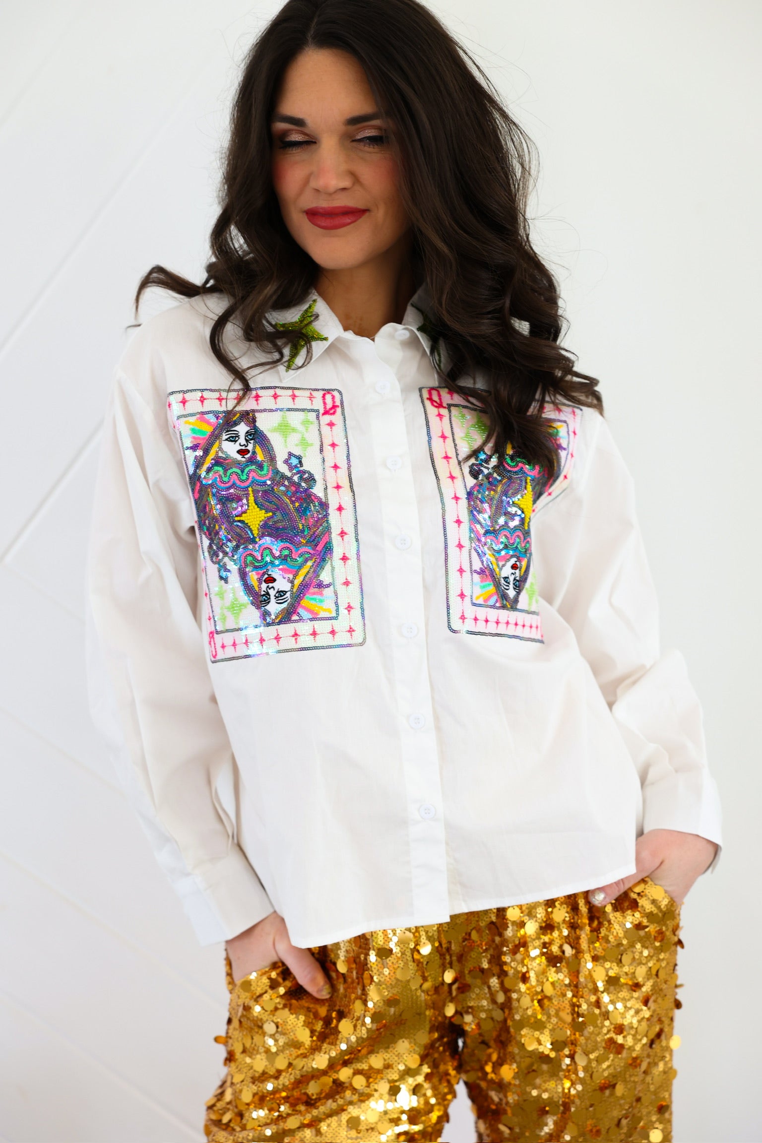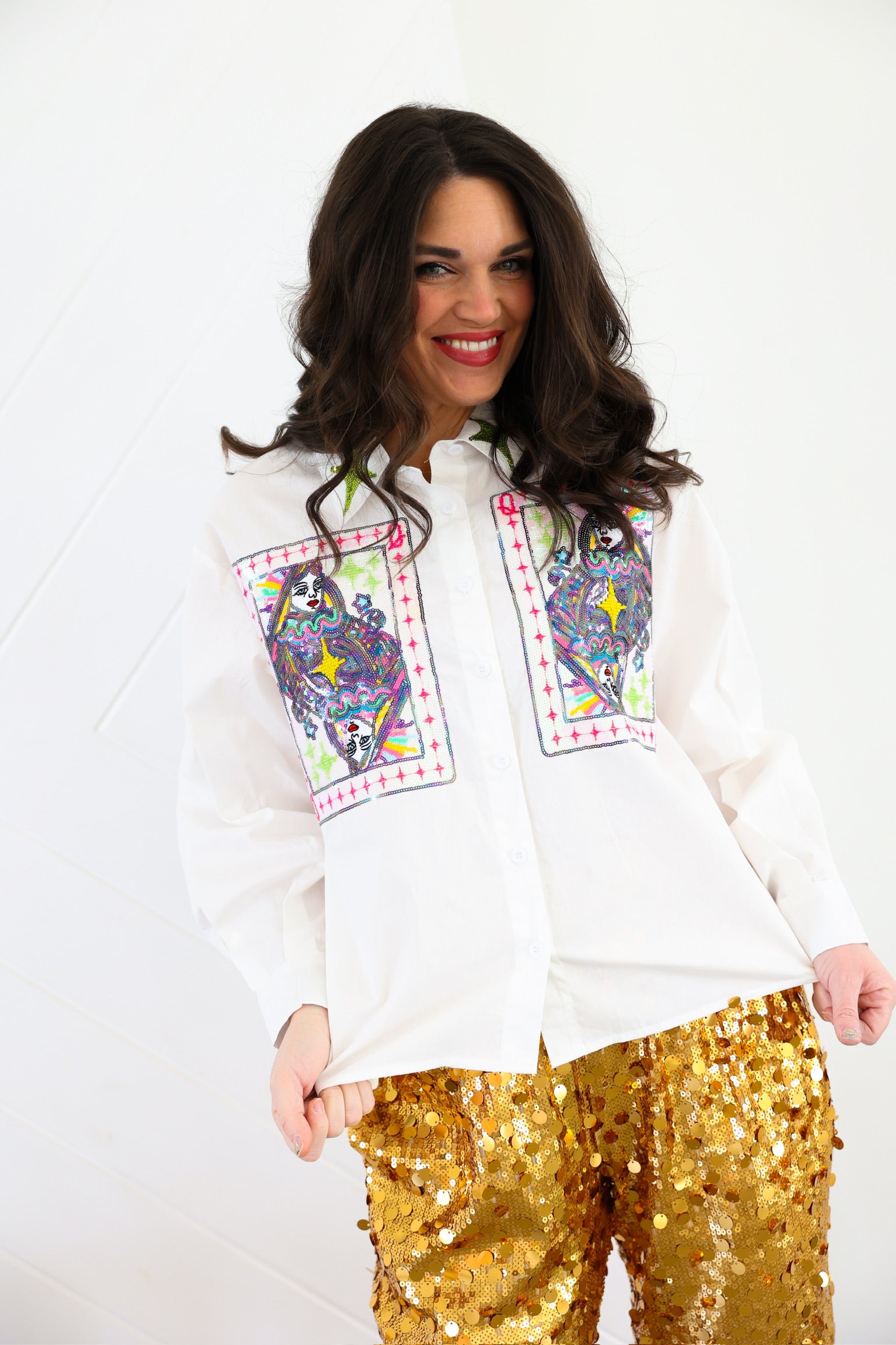 Bold, playful, and unmistakably Queen of Sparkles, this White Queen Card & Sparkle Collar Button Up Top brings statement style with a touch of whimsy. Crafted from crisp white cotton, this classic button-up silhouette is transformed with dazzling sequin Queen card artwork across the front and shimmering star embellishments on the collar for an extra sparkle moment.