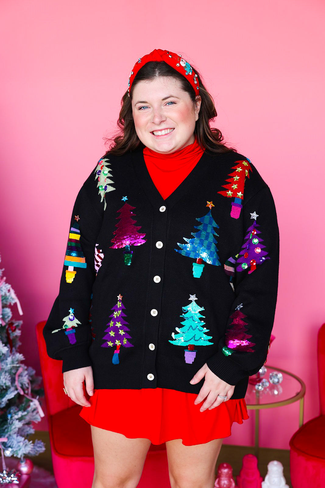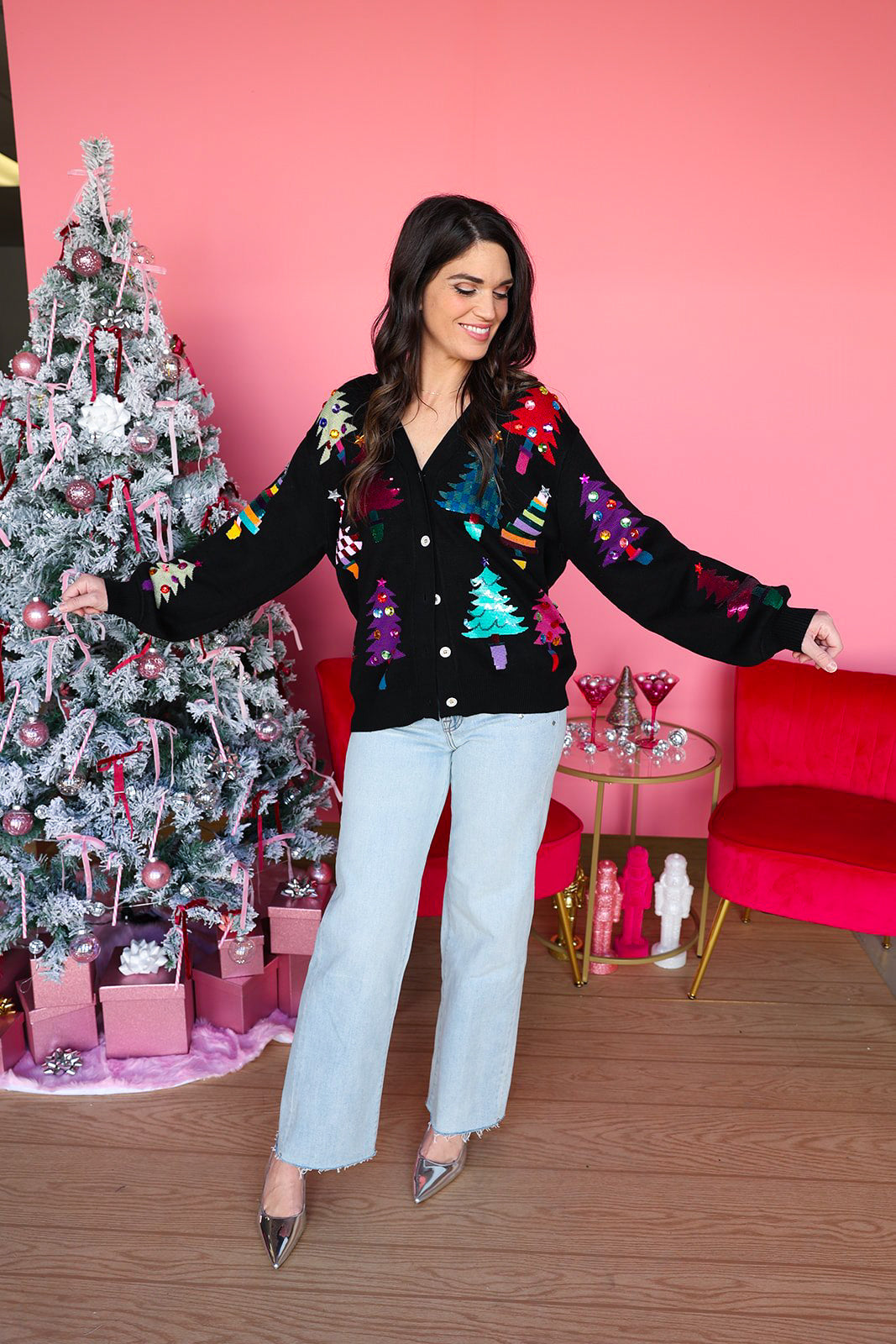 'Tis the season to sparkle with our Black Colorblock Trees Cardigan! This cozy black cardigan features colorful sequin Christmas tree designs, making it the perfect addition to your holiday wardrobe. With a comfy fit, you'll want to wear this all season long!