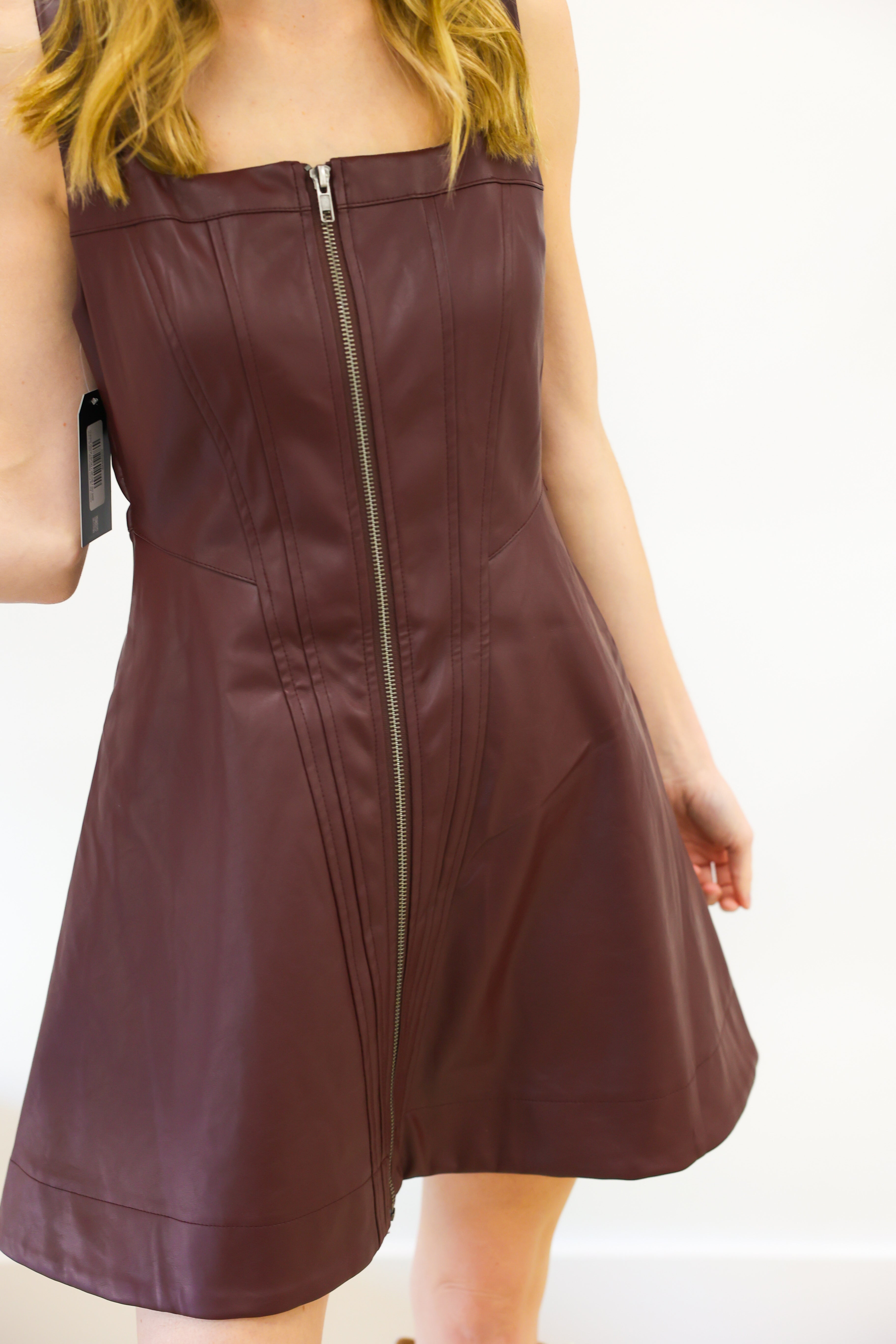 Elevate your style with the Merlot Zip Up Front Sleeveless Leather Dress. Crafted from supple leather, this dress offers a sleek silhouette and a flattering zip-up front for easy wear. Its sleeveless design keeps you cool while adding edge to any look. Perfect for making a bold statement at evening events or upscale outings, it blends modern sophistication with confident attitude.