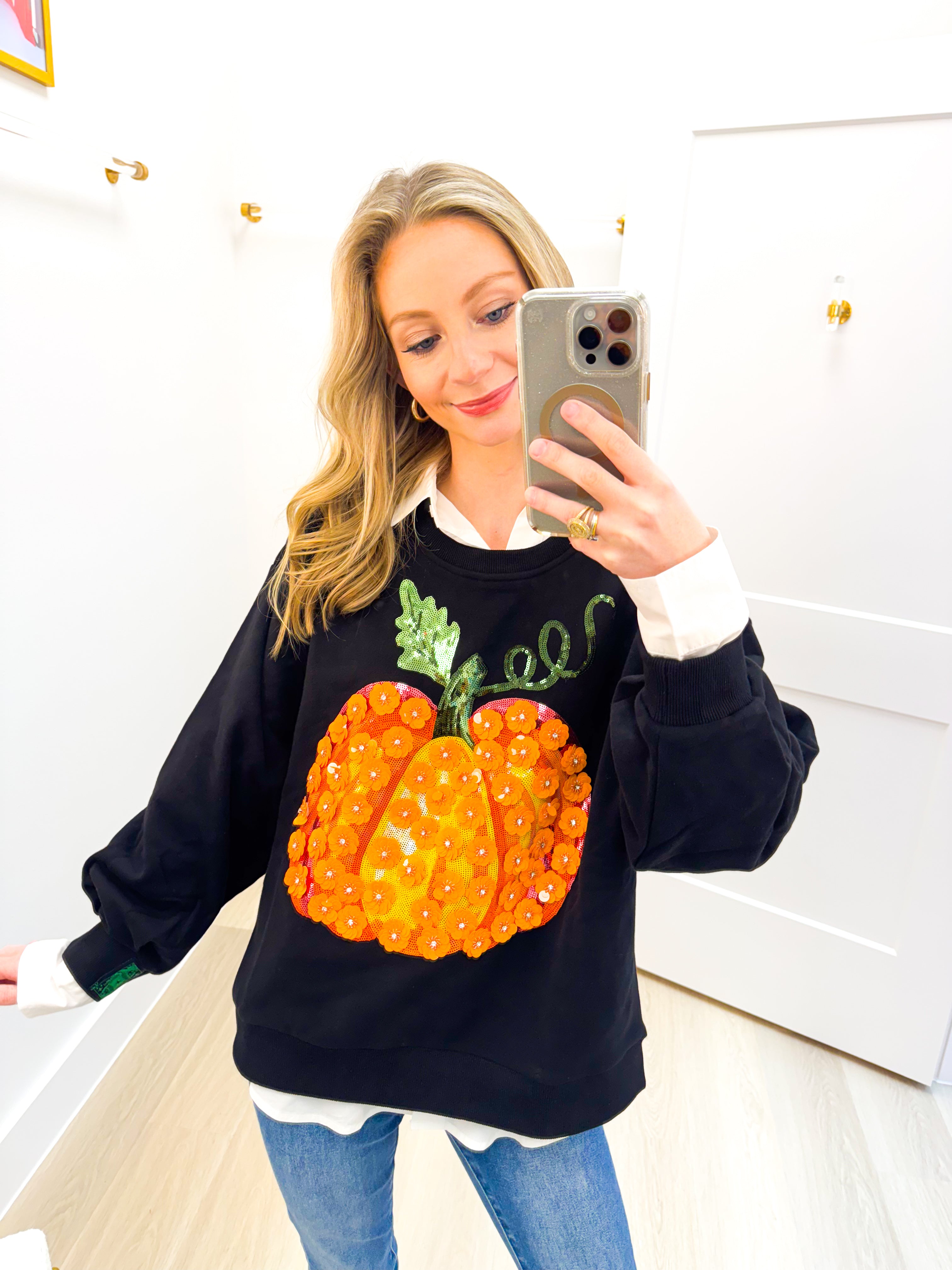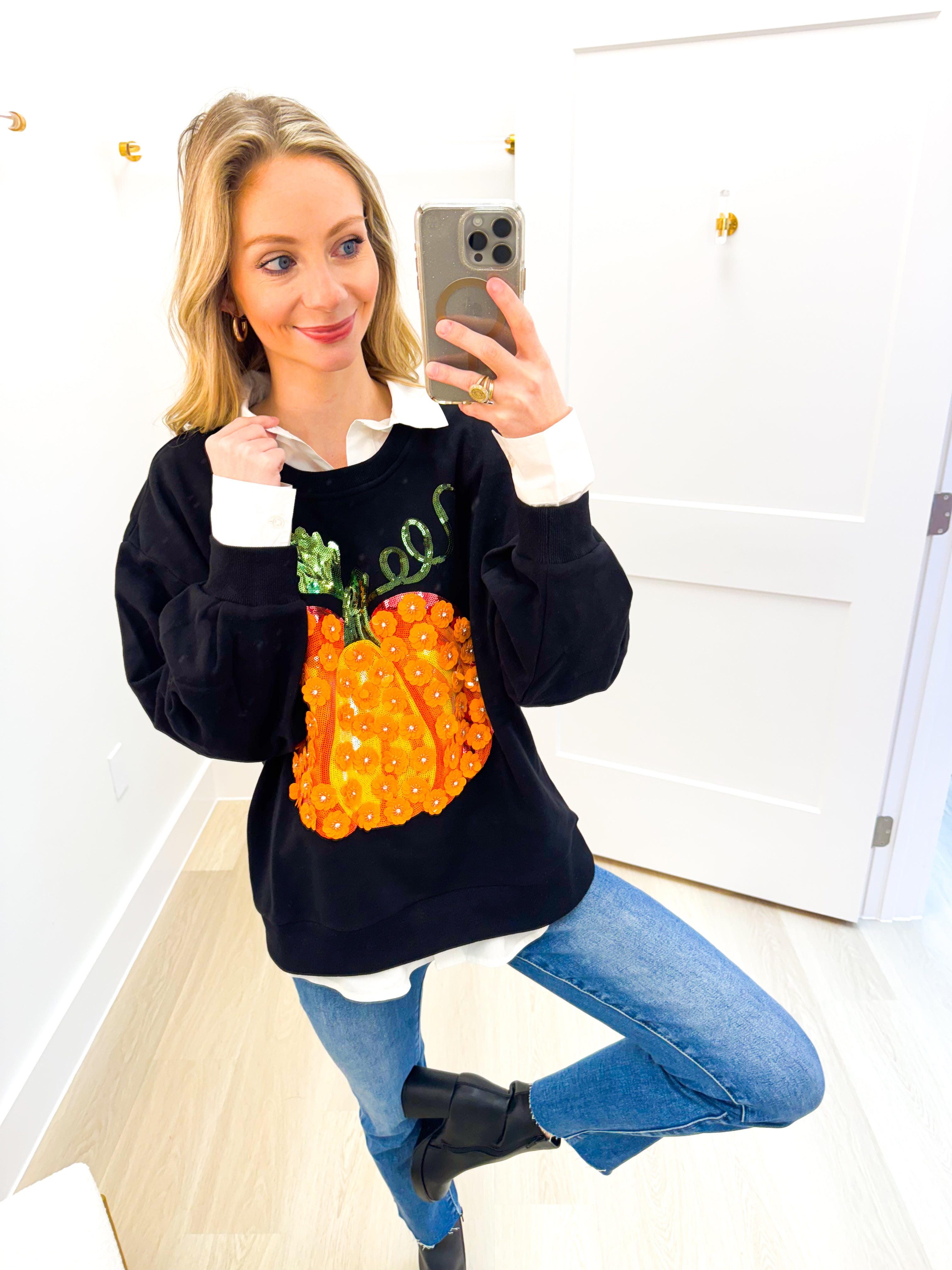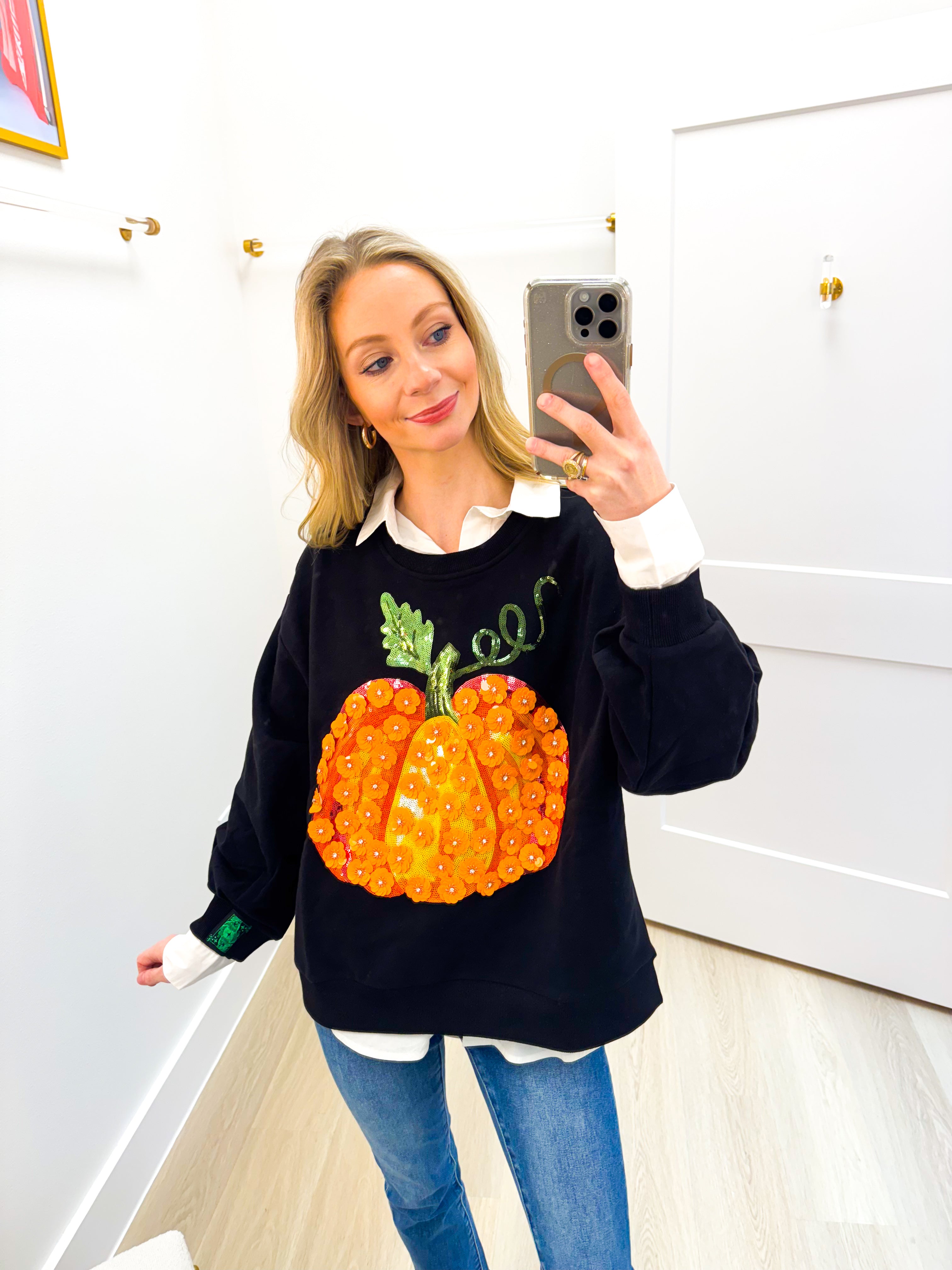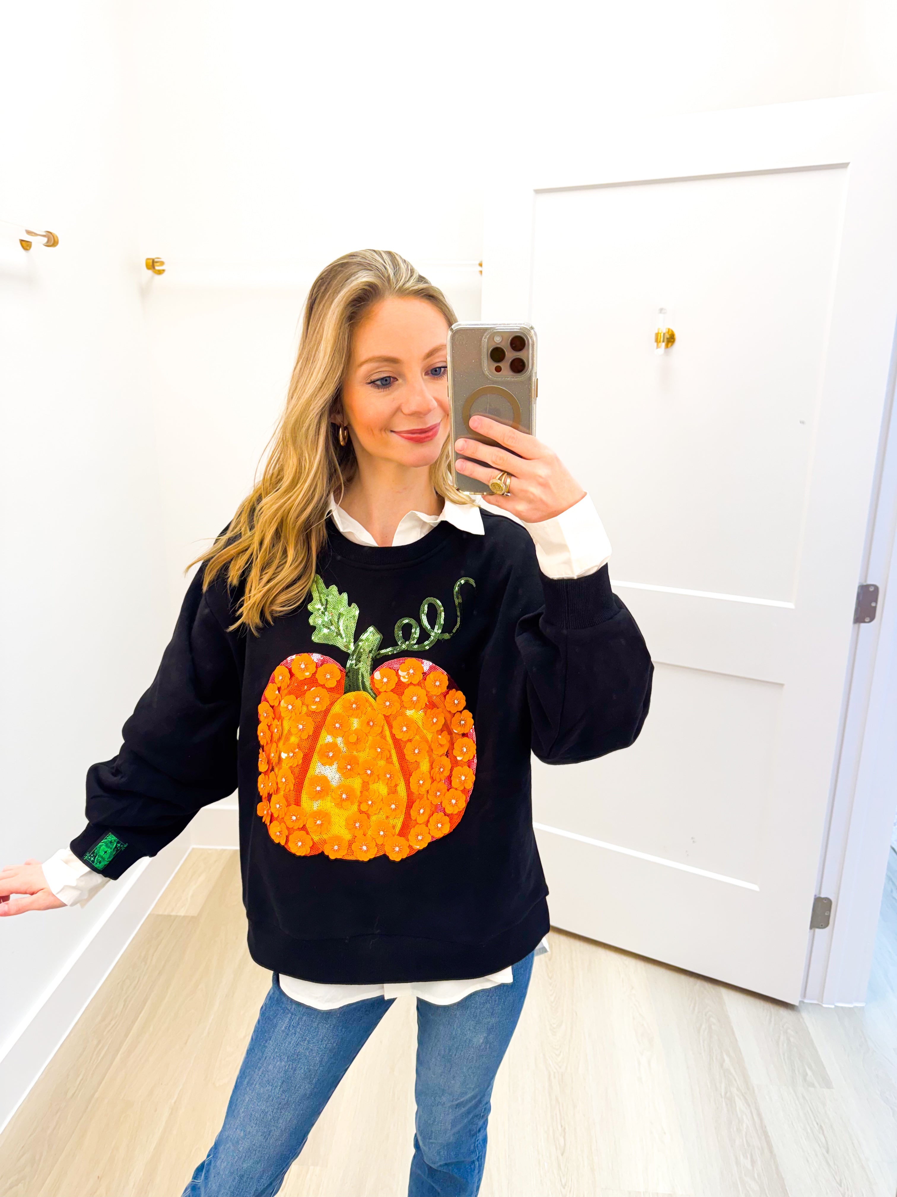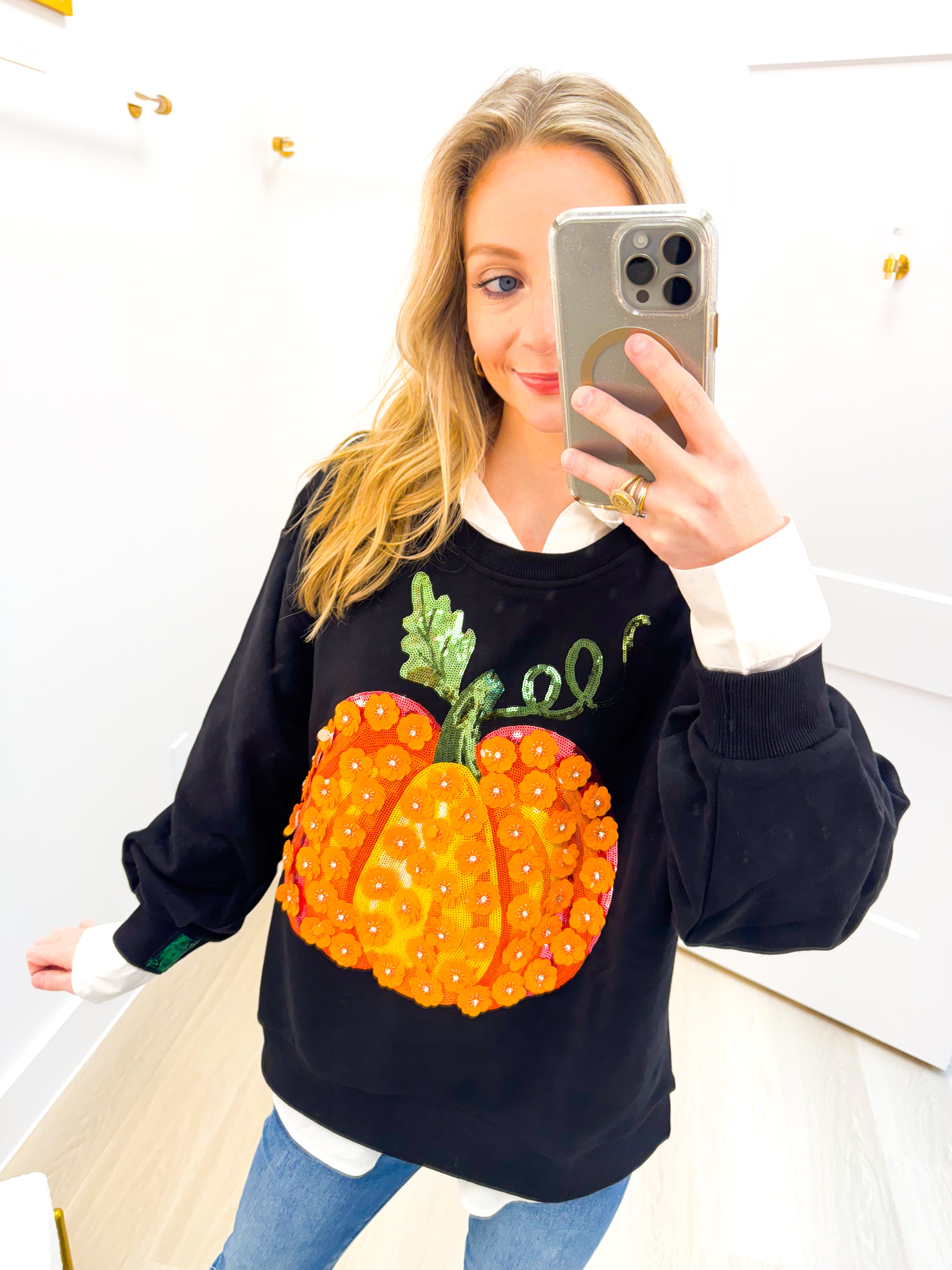 Black & Orange Flower Sequin Pumpkin Sweatshirt Queen of Sparkles