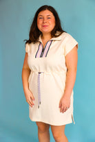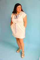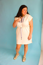 Get ready to turn heads in our Essential Ecru Half Zip Dress! This solid dress is accented with a multicolor band and features a front half-zip closure for a unique touch. The adjustable drawstring at the waist allows for a perfect fit, while the pockets at the sides add both style and functionality! Pair with your fav sneakers!