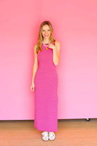 Elevate your summer wardrobe with the KARLIE Stripe Knit Tank Maxi Dress. Crafted from soft, breathable knit fabric, this dress offers all-day comfort while flattering your silhouette with its sleek tank design and flowing maxi length. The classic stripe pattern adds a timeless touch, making it perfect for casual outings or beachside strolls. Effortlessly stylish and versatile, this dress is your go-to choice for warm-weather elegance.