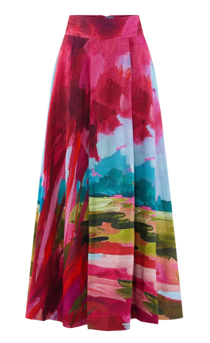A masterpiece in motion—the Milly Skirt in Bellamy Sunset brings the magic of the Lowcountry to life with every step. This high-waisted, empire silhouette is designed with a wide, supportive waistband and flows effortlessly into a full, graceful drape. An exposed back zip closure with our signature gold pull adds a refined finish, while the true star is the hand-painted sunset design by low country artist, Bellamy. Rich brushstrokes of bold color capture the beauty of a Southern horizon, transforming the skirt into wearable art. Pair with the matching Poppy Pullover to become a walking masterpiece!