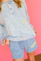 - Vintage washed blue high rise sweatshorts with pockets and adjustable drawstrings at the waist