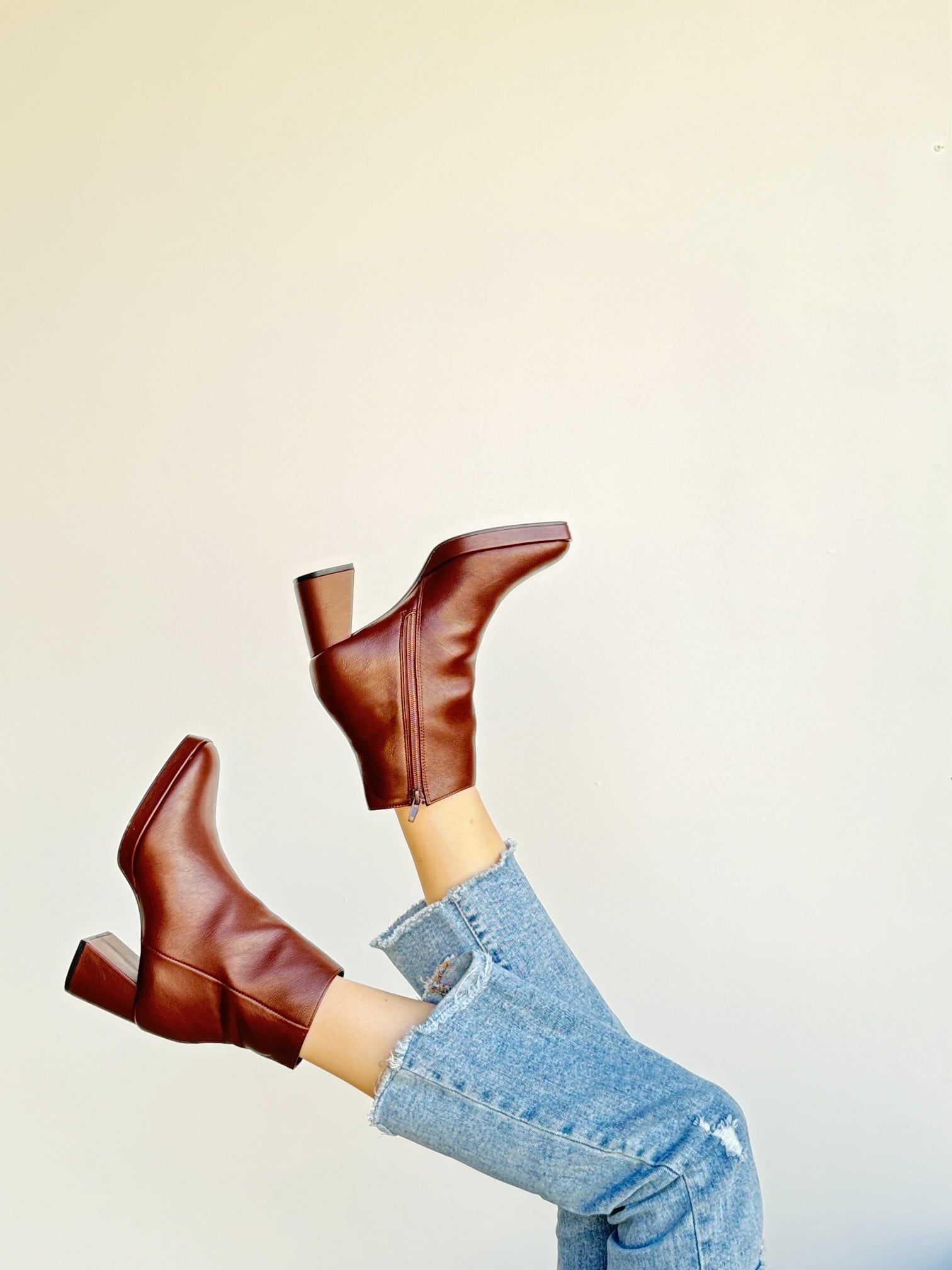 Add some height to your night with our Shine On Me Brown Booties. These heeled booties not only elevate your style, but also feature a convenient zipper detail. Perfect for a night out! Pair with your fav dresses, denim, maxi skirts and more!