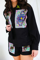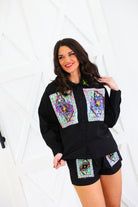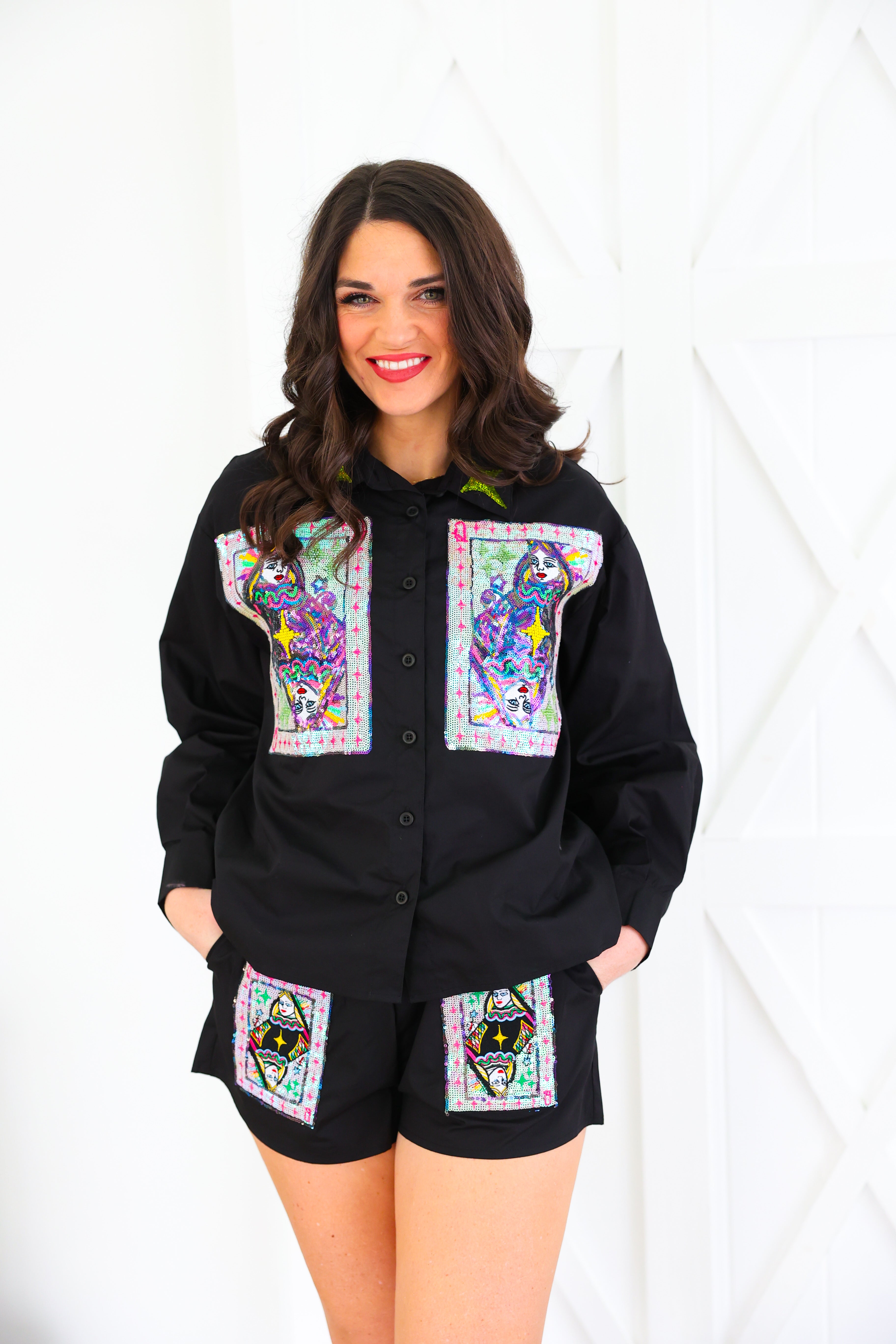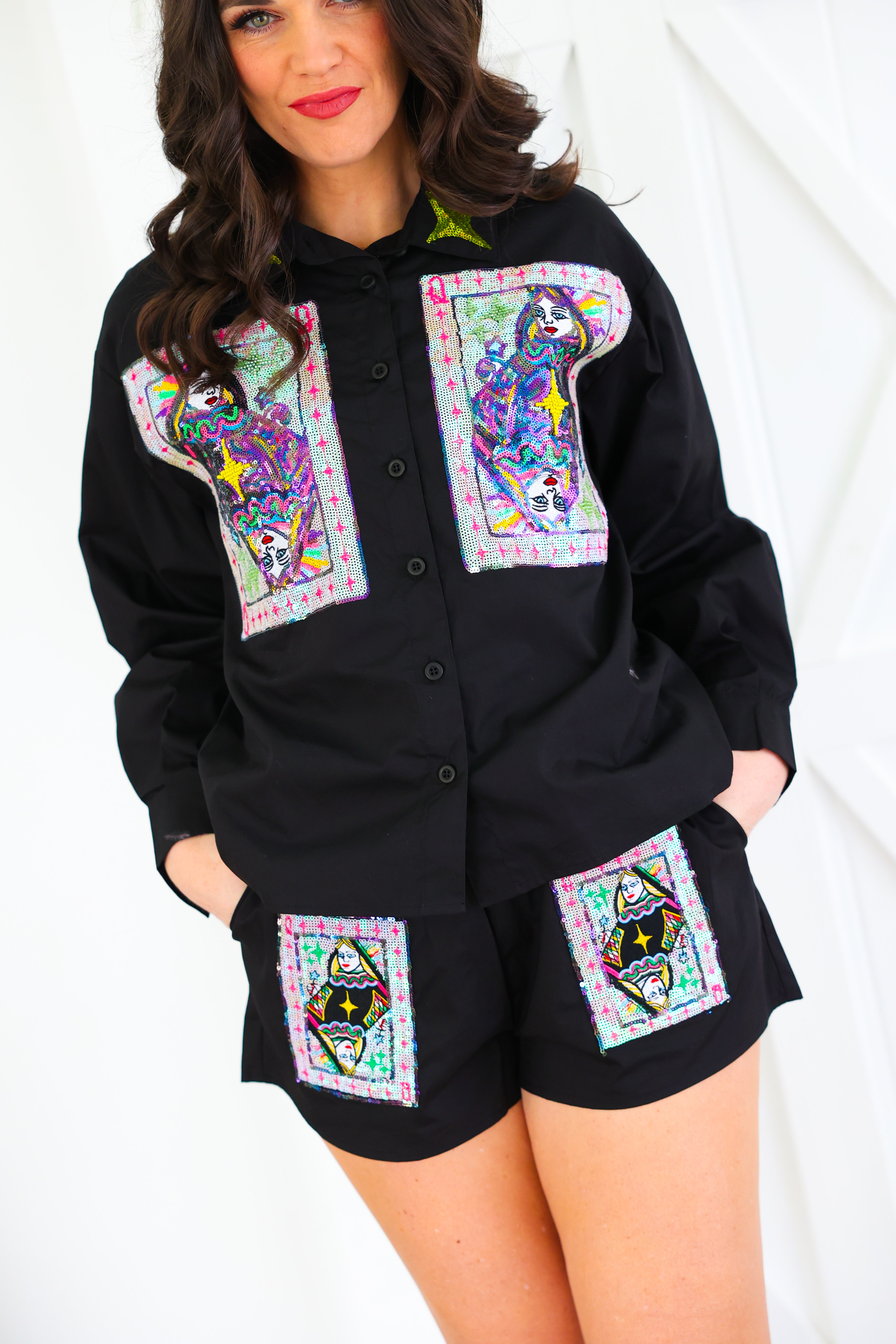 Black Queen Card & Sparkle Collar Button Up Cotton Shorts Queen of Sparkles
