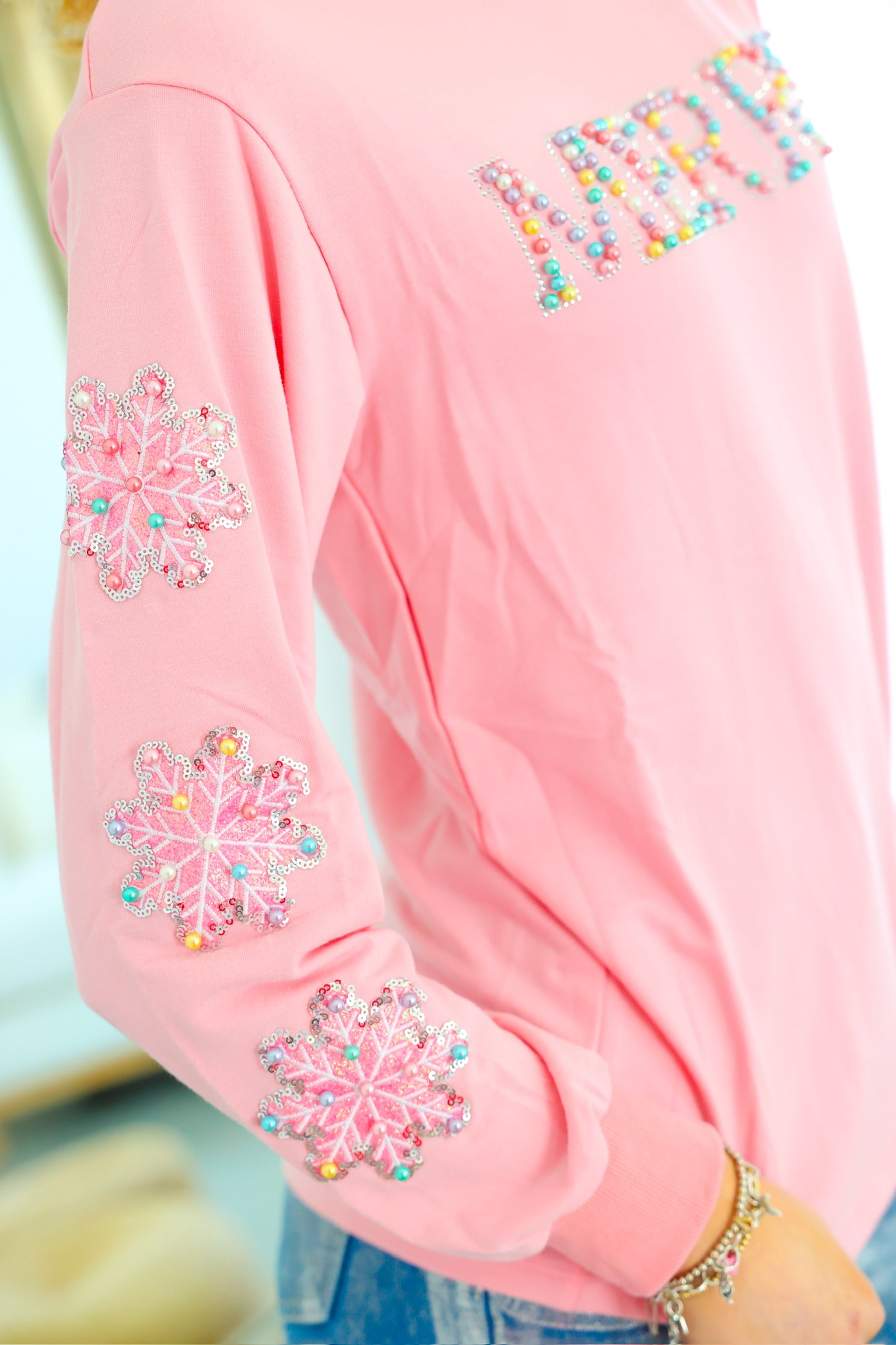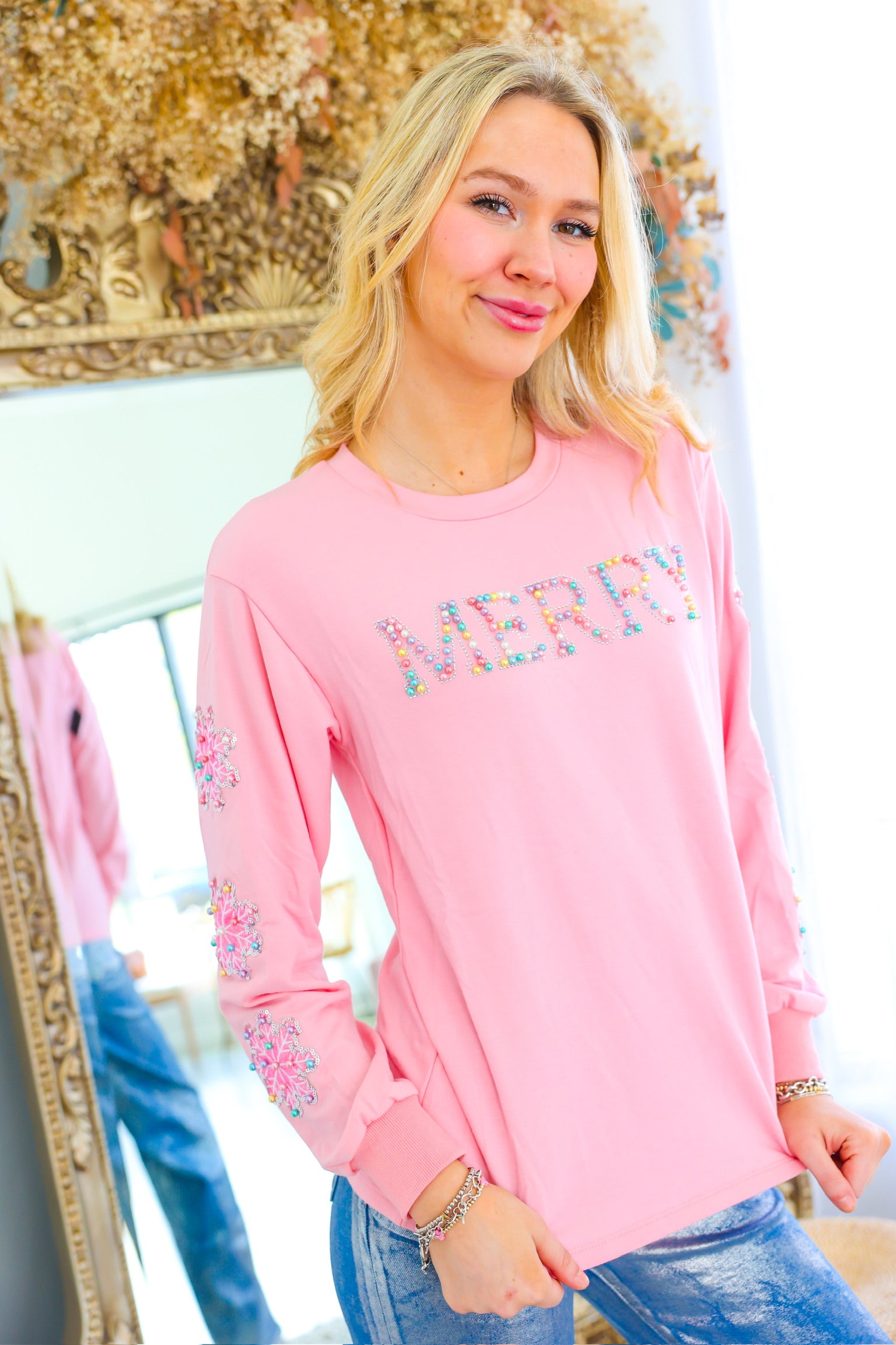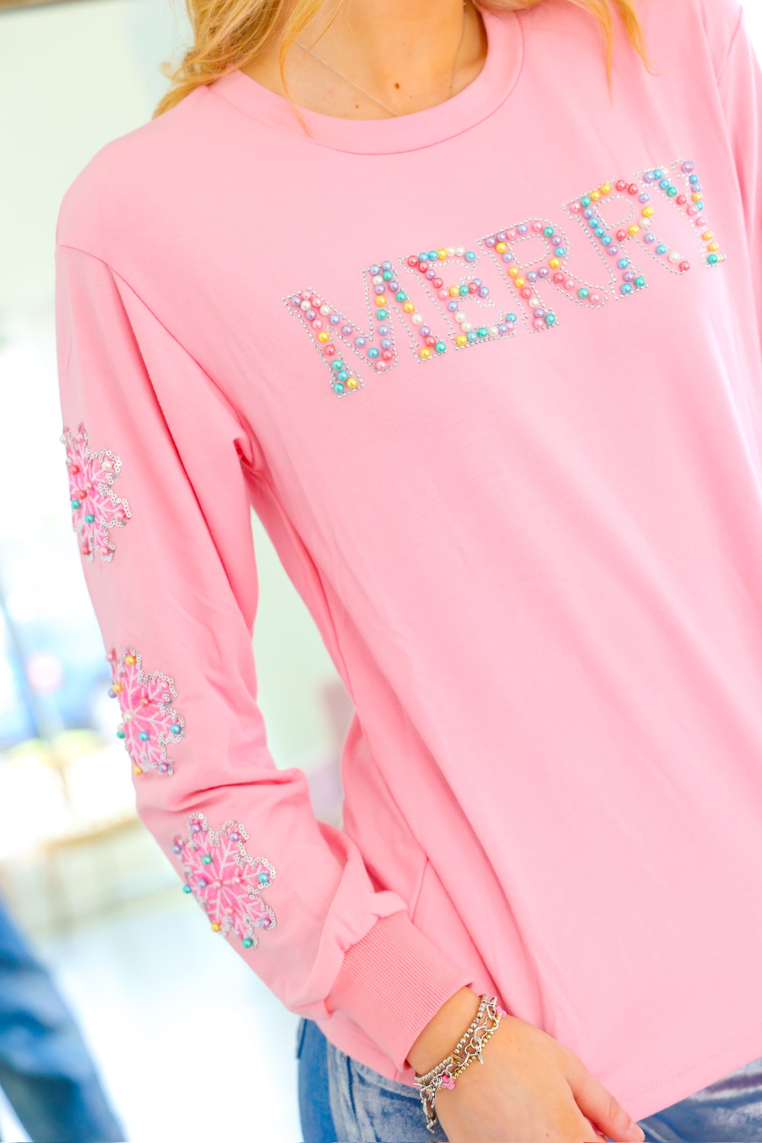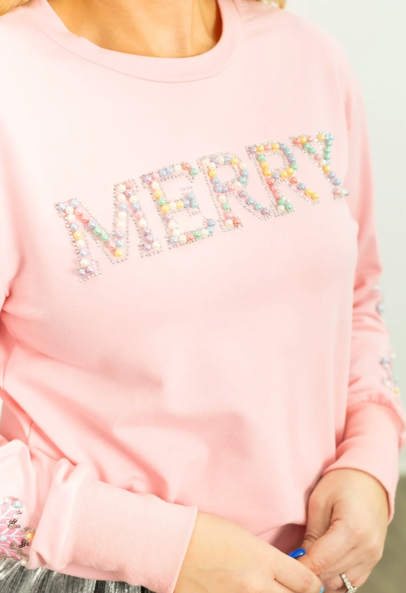 Pink Pearled "Merry" Sweatshirt with Snowflake Sleeves