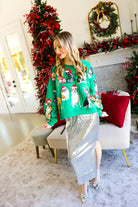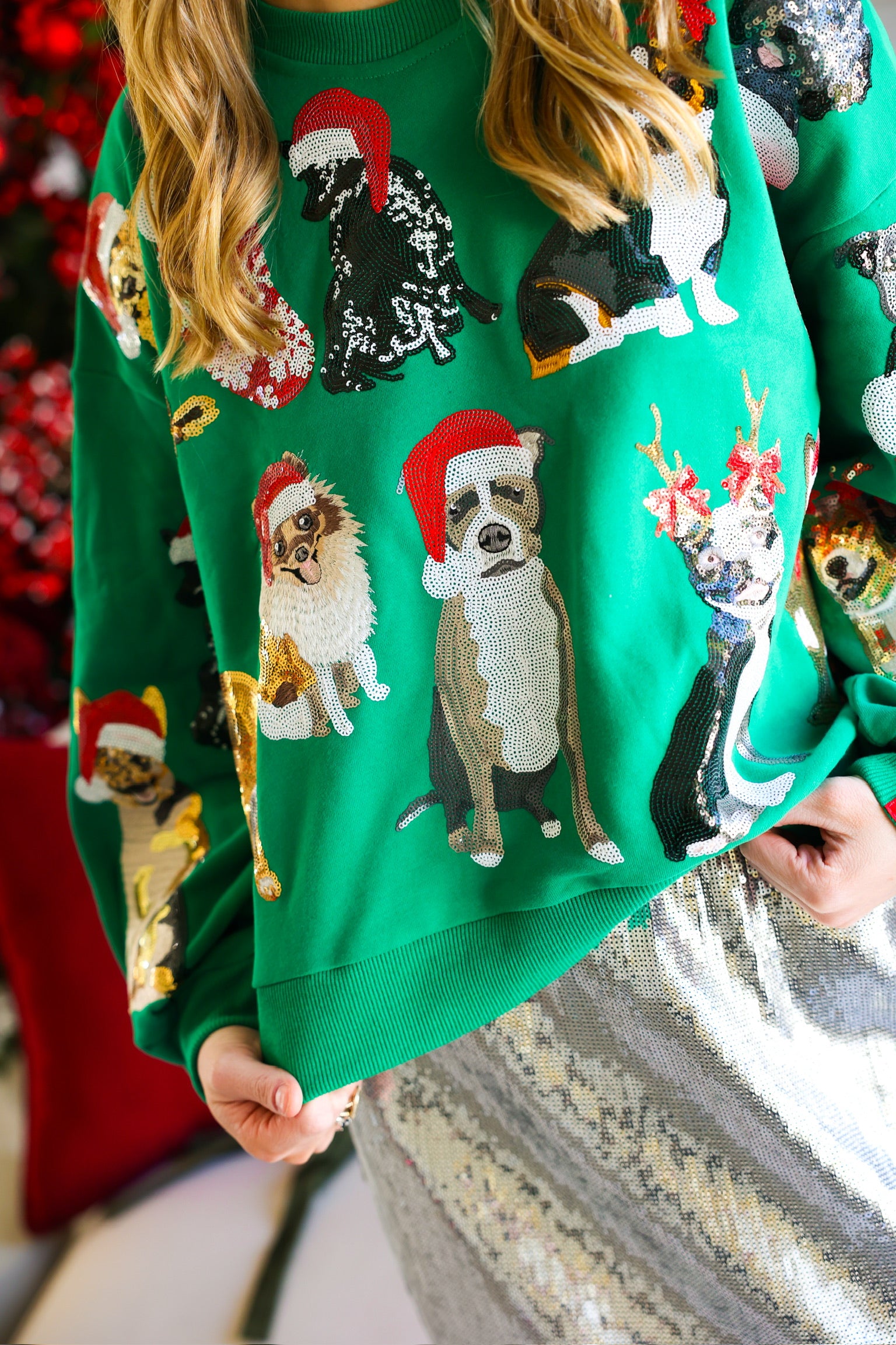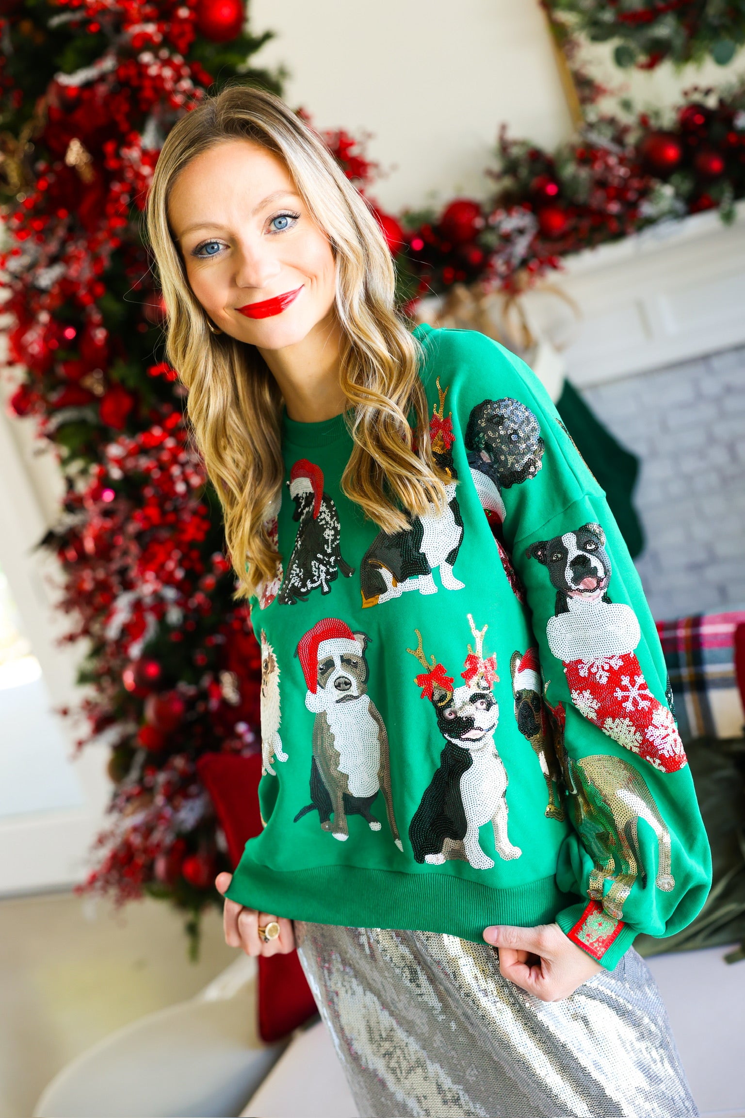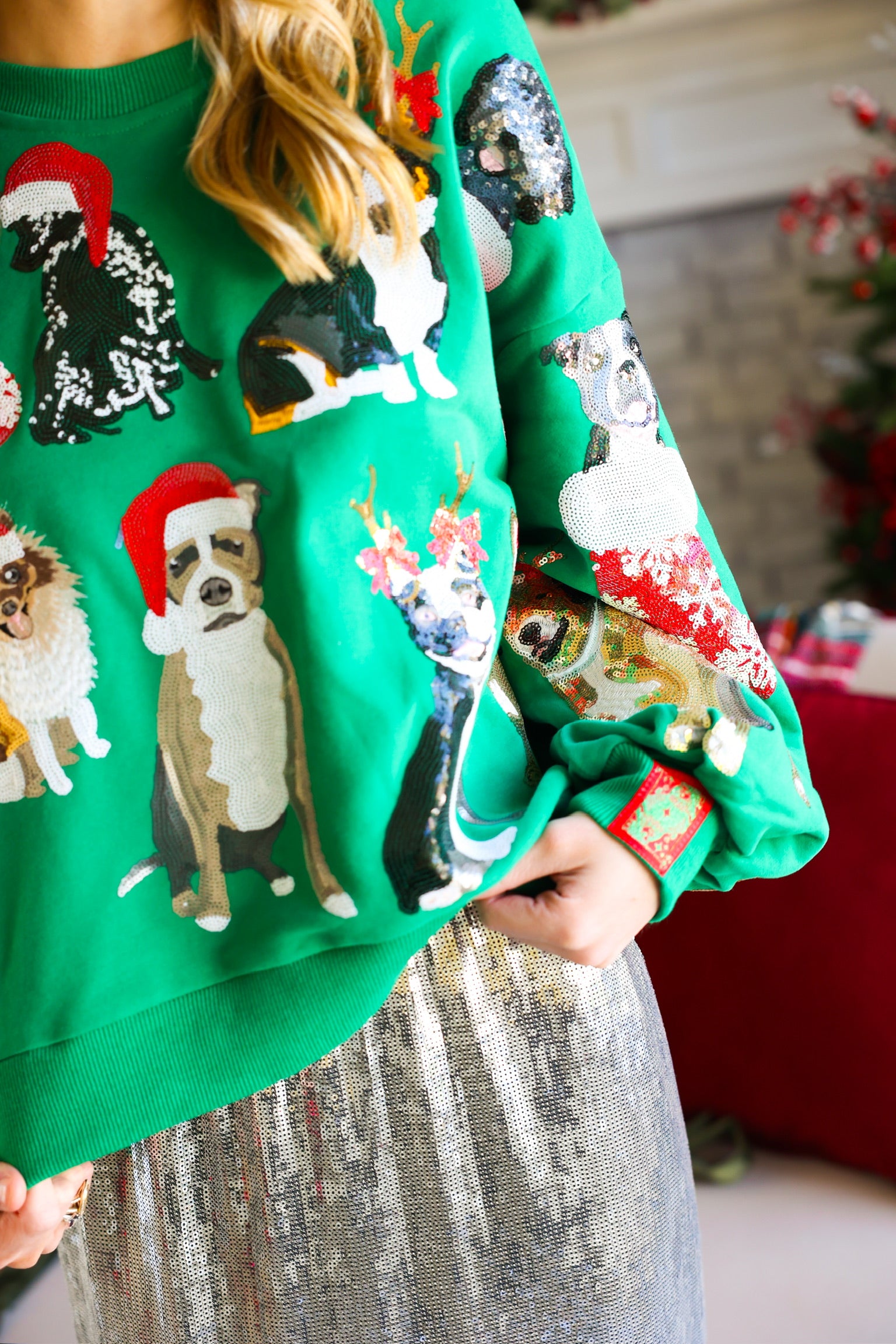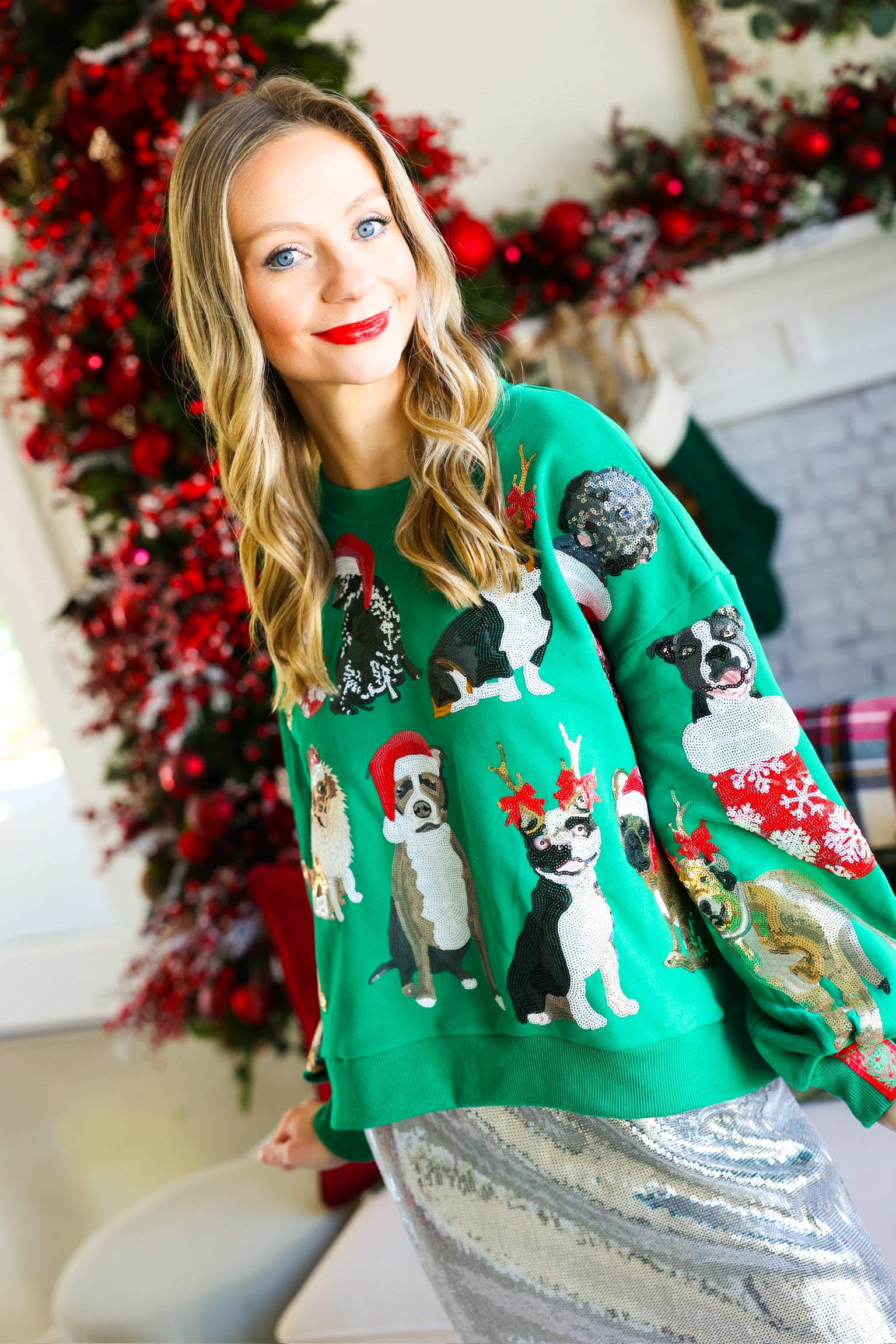 Add some holiday sparkle to your wardrobe with our Green Christmas Puppies Sweatshirt! The comfortable fit and sequin puppies design make it perfect for festive gatherings. This top is too cute to pass up! Pair with your favorite leggings, sweats, or denim! Wear this cutie to your upcoming holiday events!