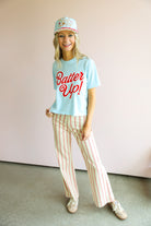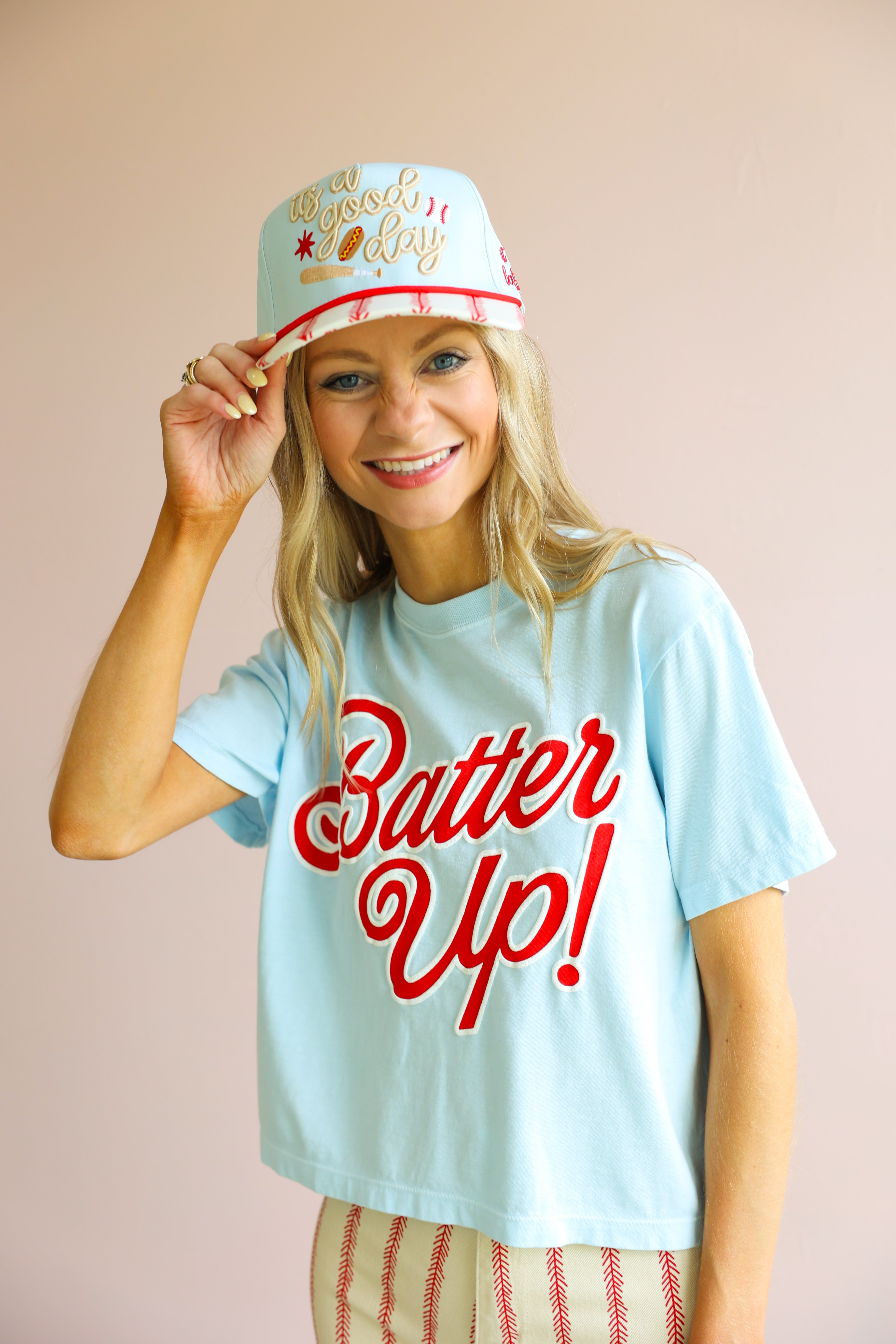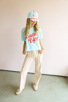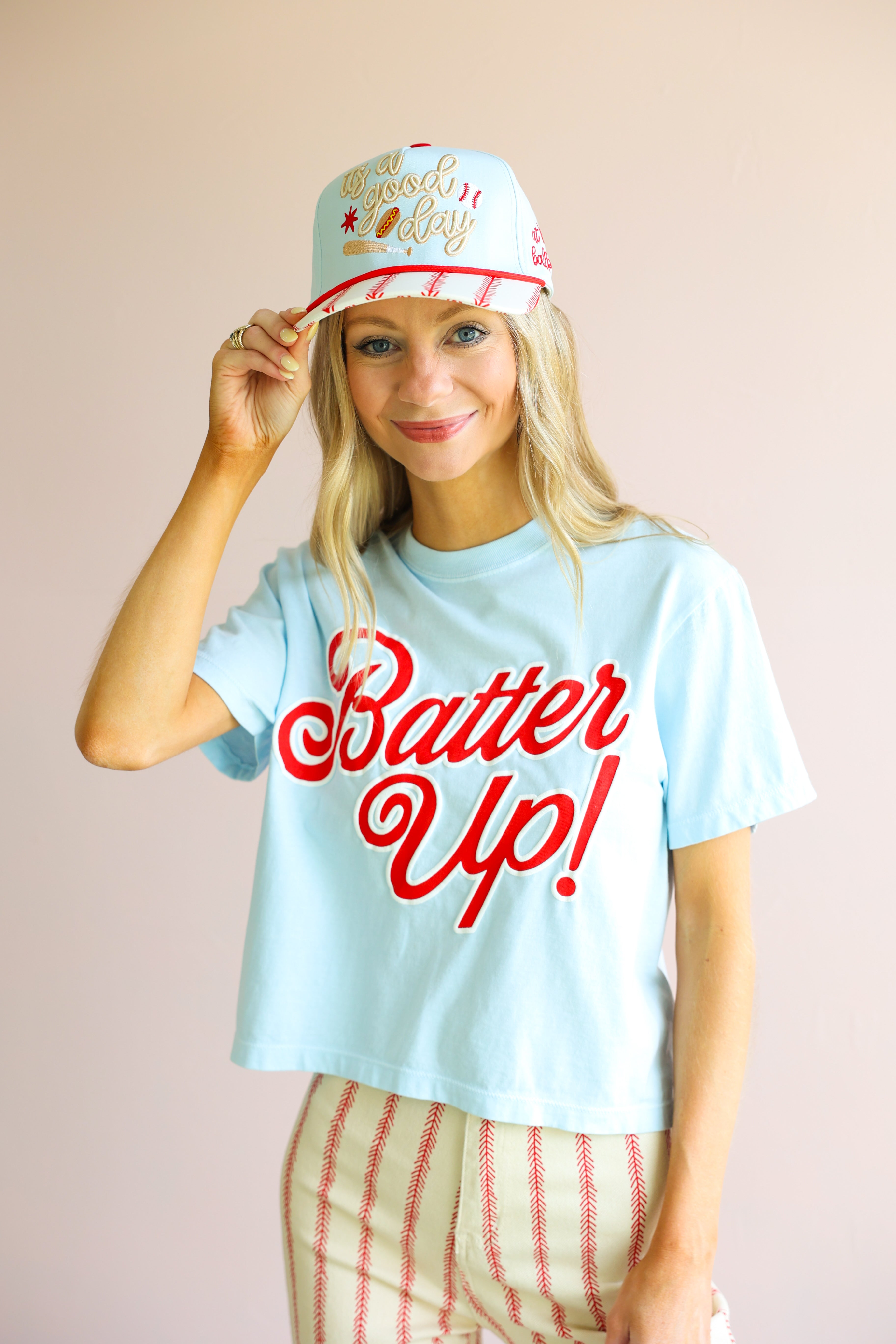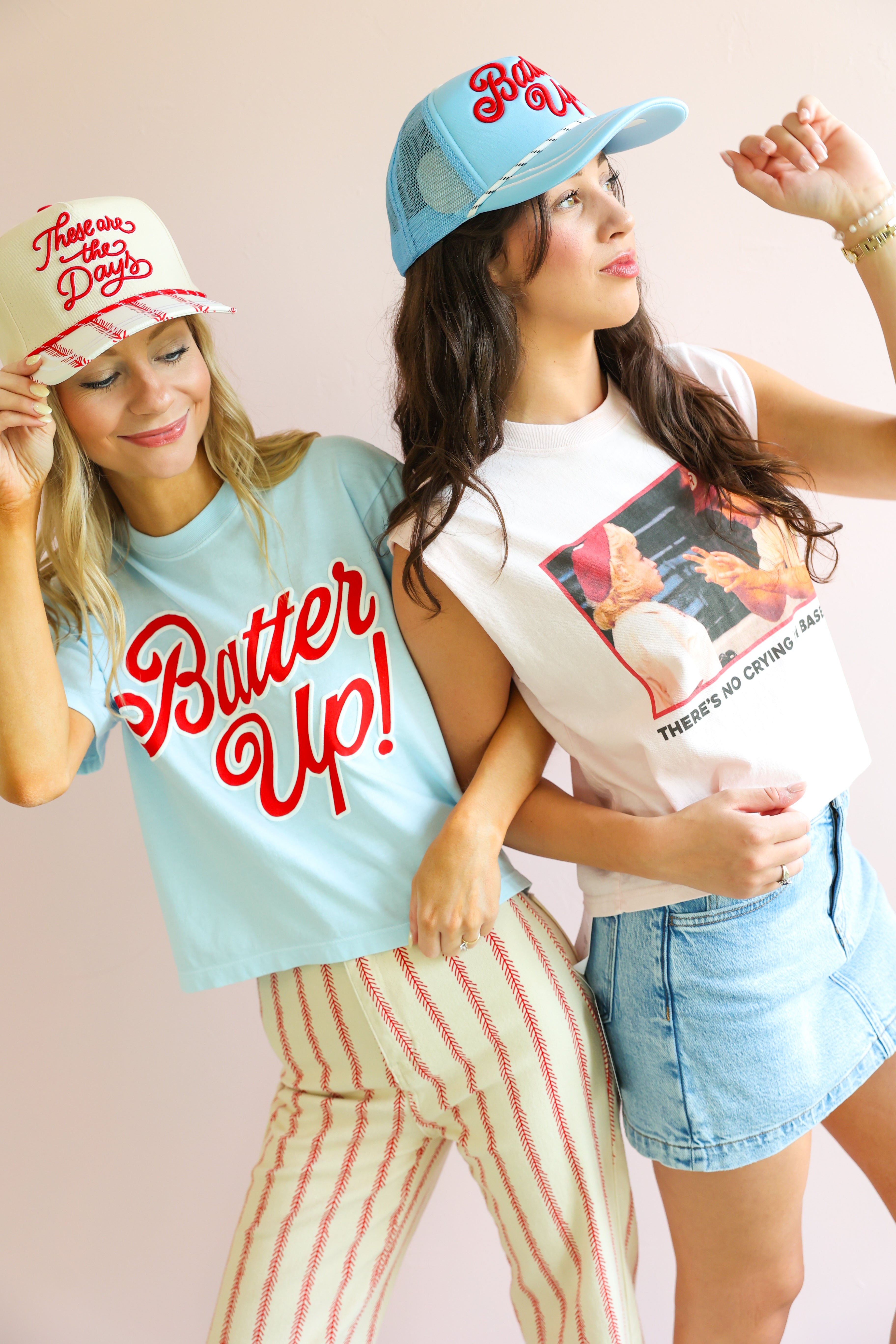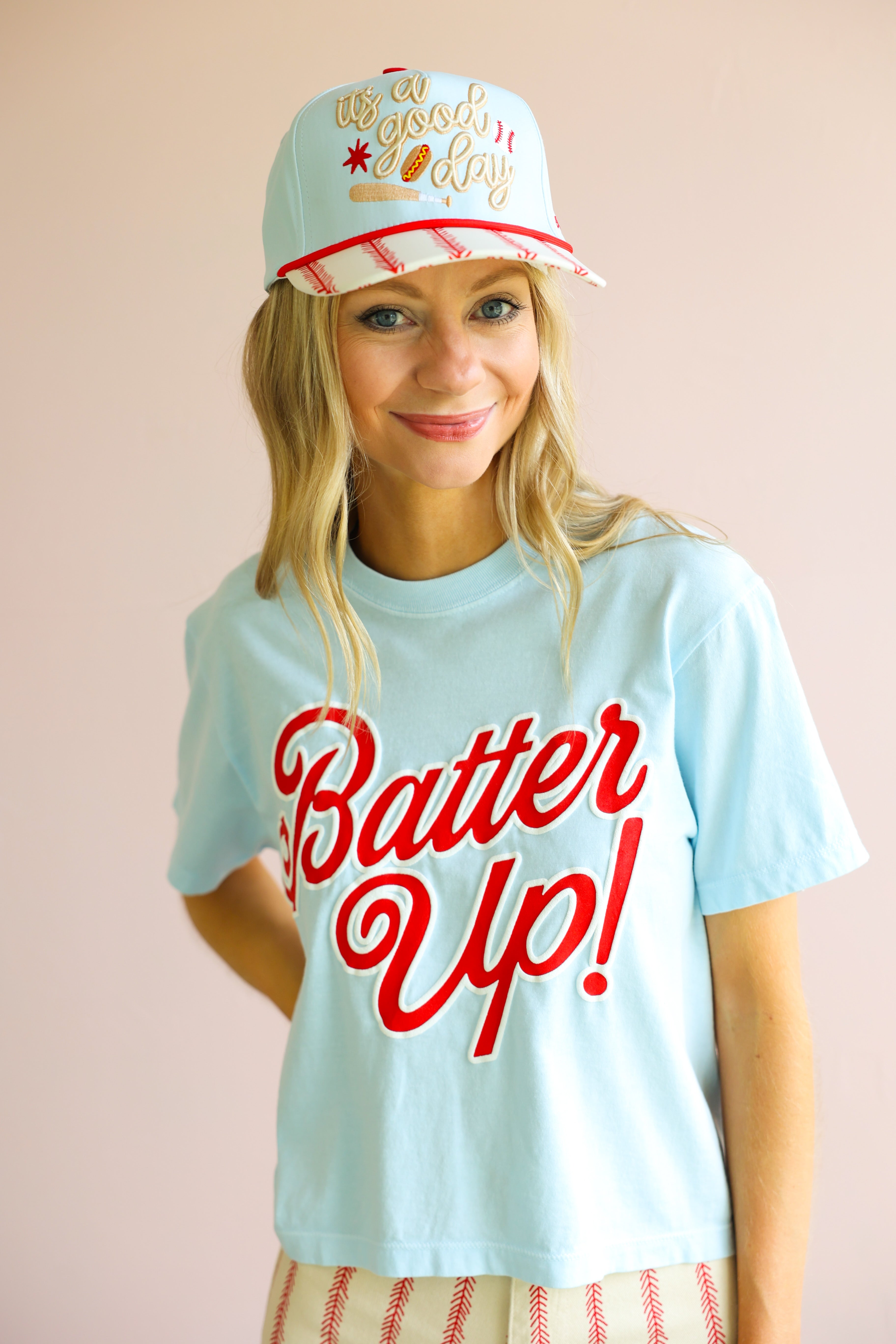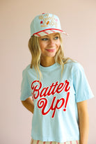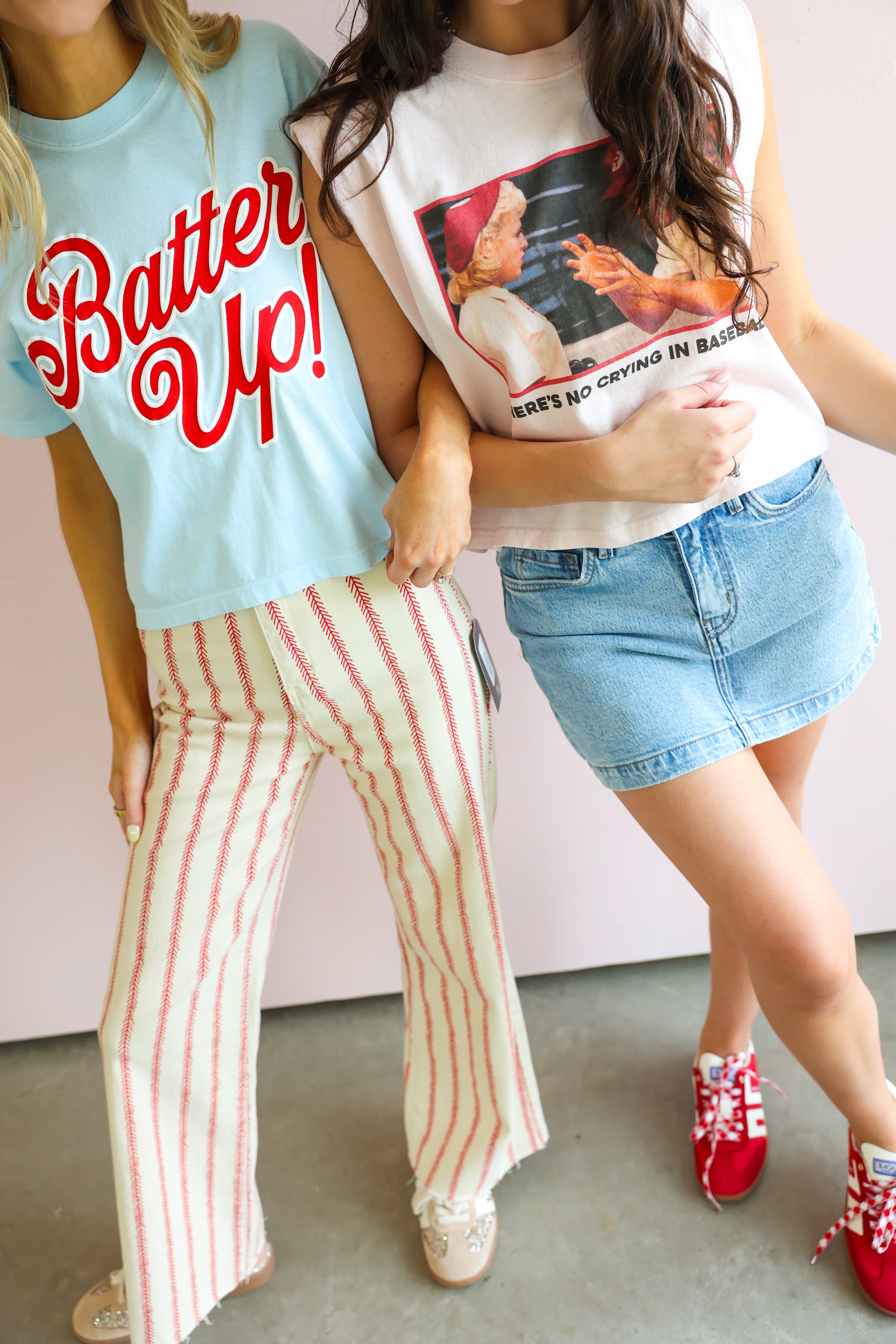 This tee is the perfect mix of sporty charm and playful style. Featuring a bold “Batter Up!” graphic, it brings a fun, game-day energy to your everyday look.