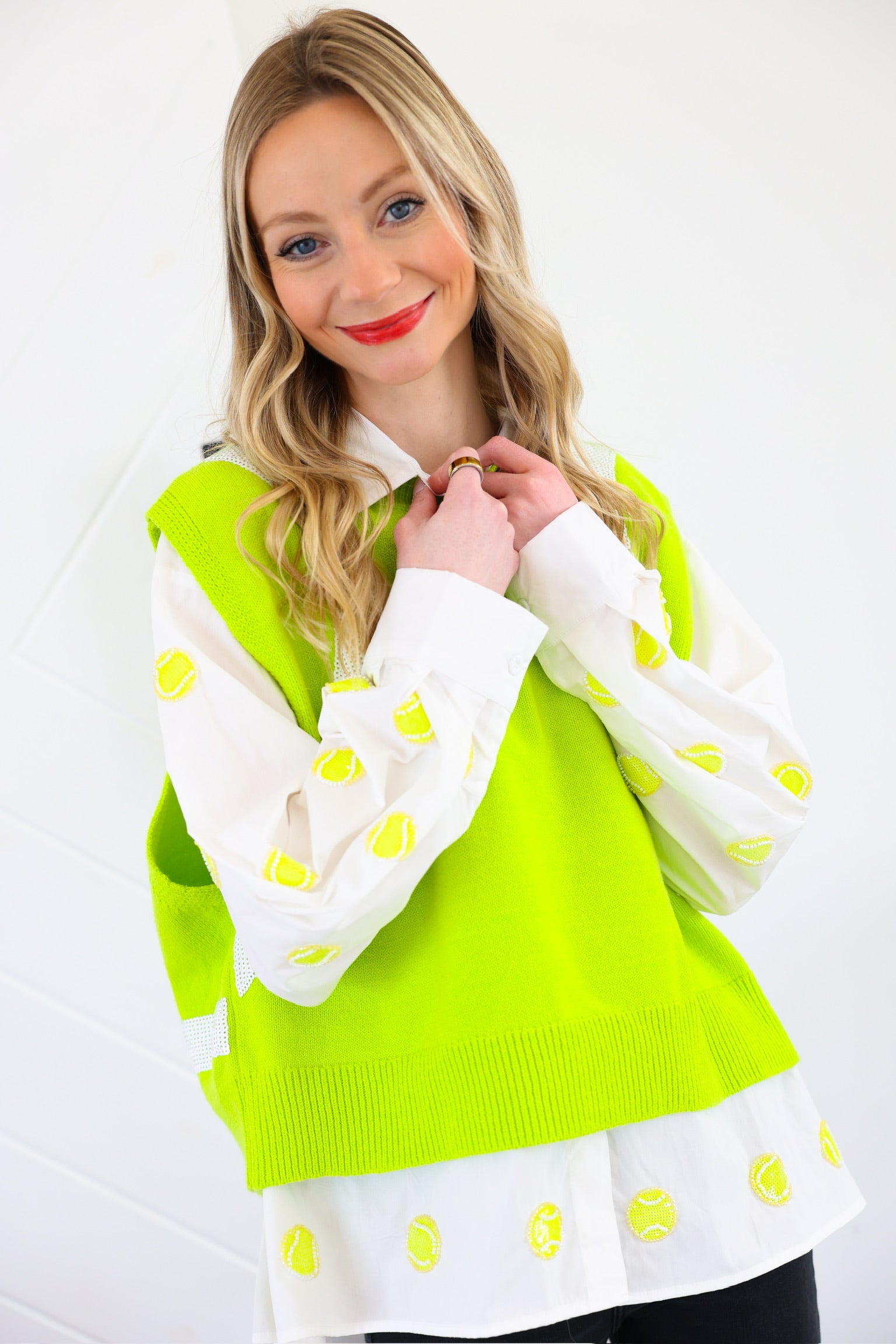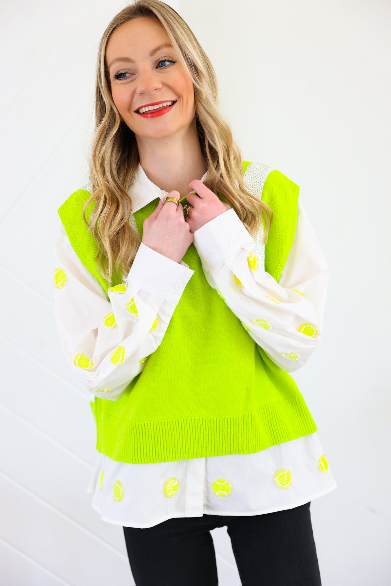 Serve up major style points with this playful yet elevated sweater vest from Queen of Sparkles 💚✨ Inspired by classic tennis aesthetics with a bold, fashion-forward twist, this fluorescent yellow sweater vest features sporty contrast paneling that gives a subtle nod to tennis ball detailing—without being over the top.