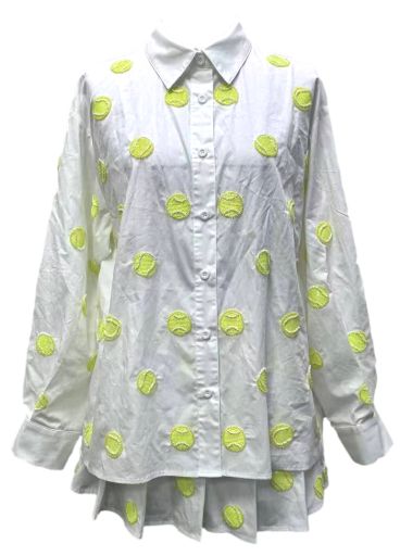 Serve up style with this stunning white button-up collar top from Queen of Sparkles, featuring scattered beaded tennis ball details that bring playful sophistication to your wardrobe. Perfect for tennis enthusiasts and fashion lovers alike, this piece combines sporty charm with glamorous embellishments that catch the light beautifully. The classic collar and button-up design offer versatile styling options—dress it up for a night out or keep it casual for weekend wear. Whether you're hitting the courts or making a statement at social events, this top delivers the perfect blend of athletic inspiration and sparkly elegance that makes you stand out from the crowd.