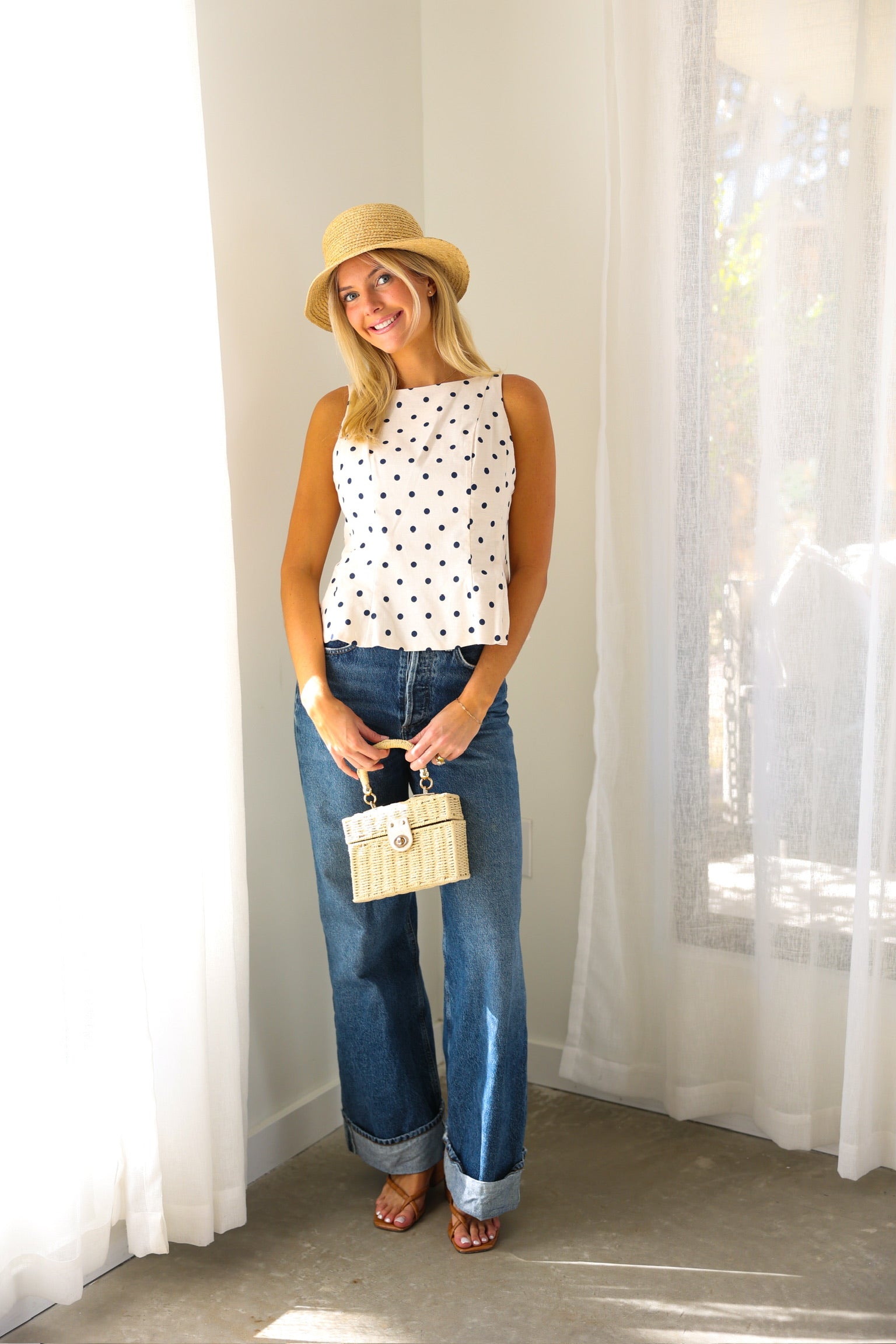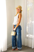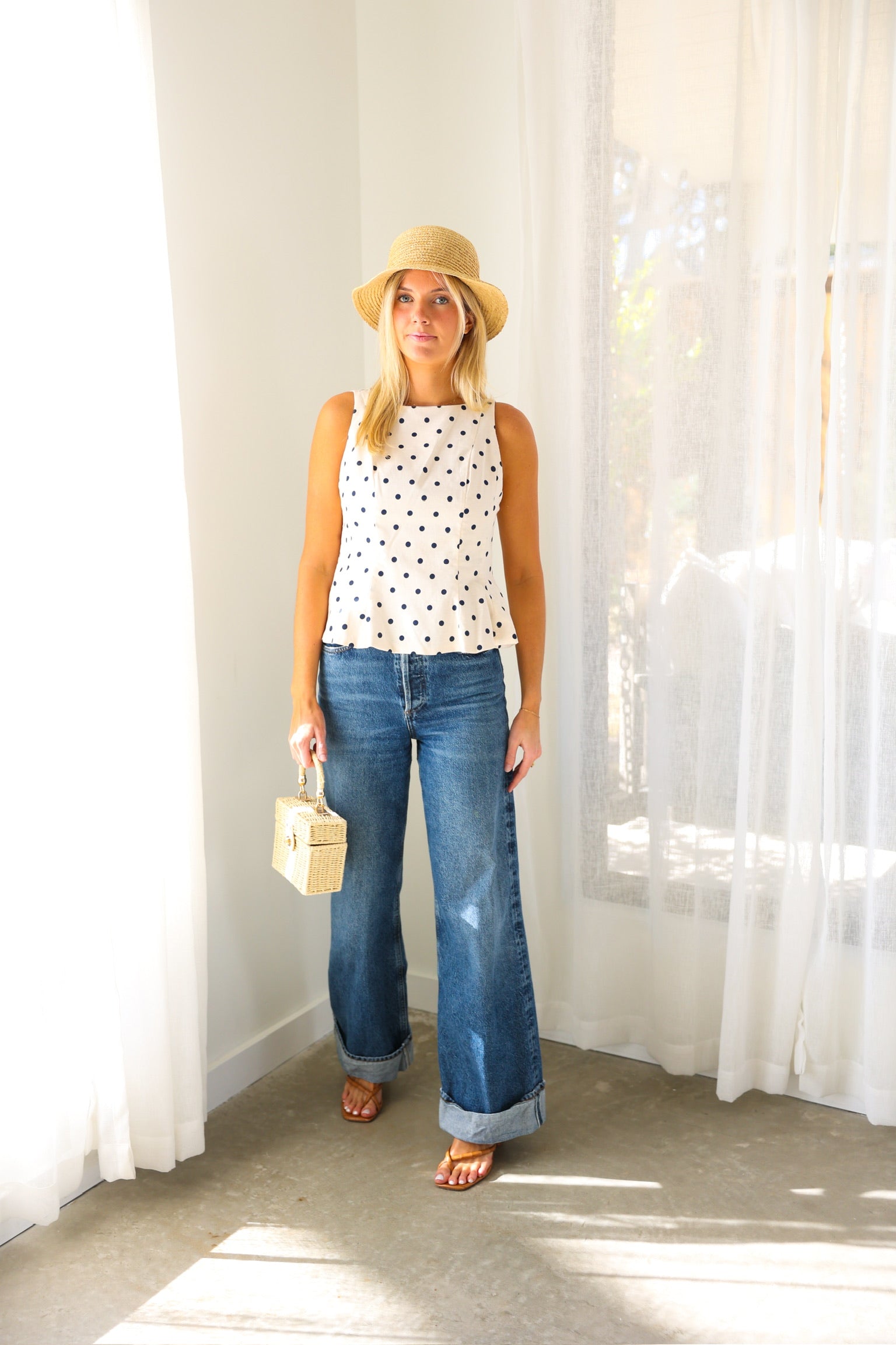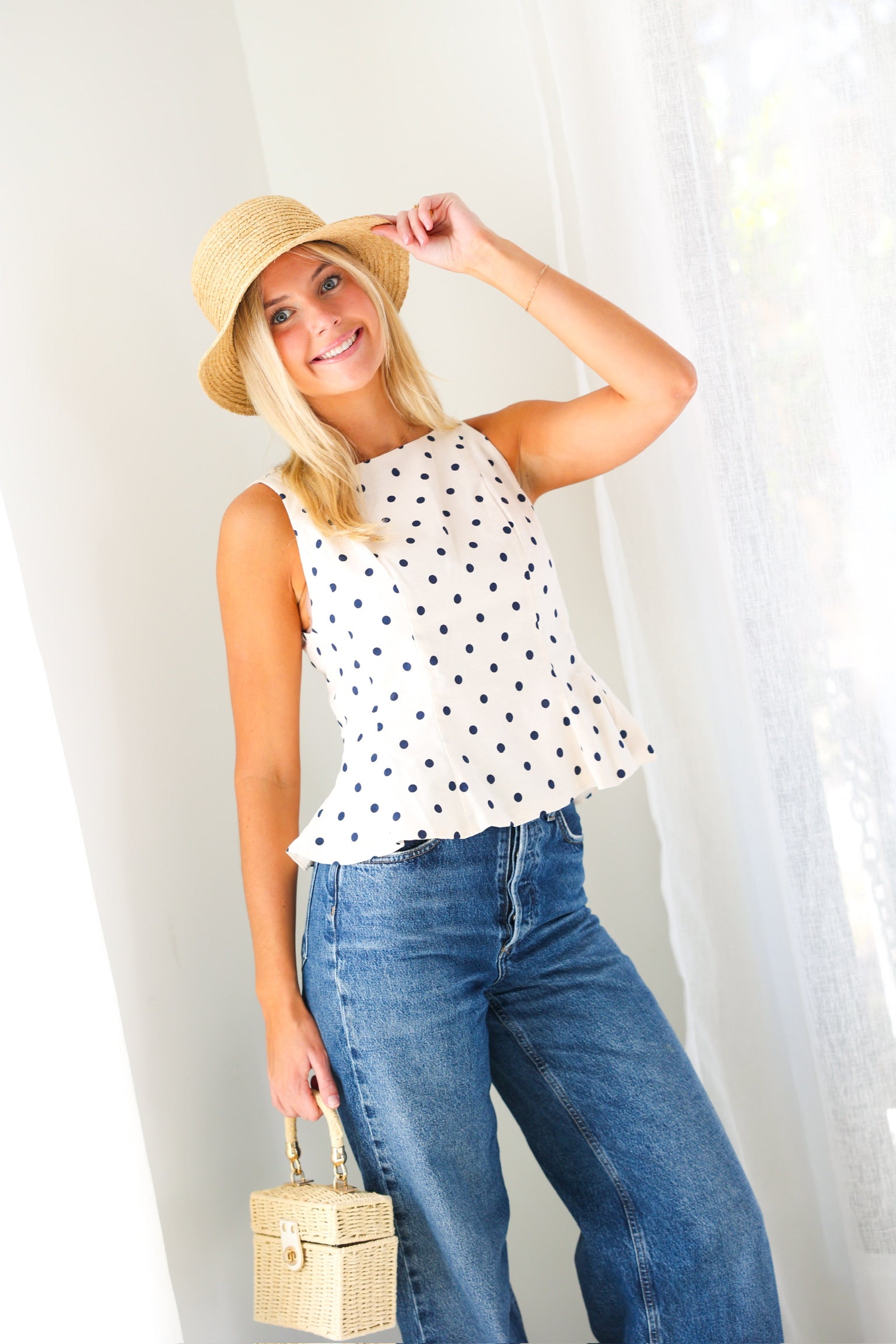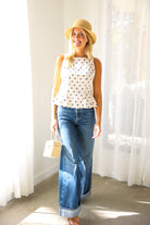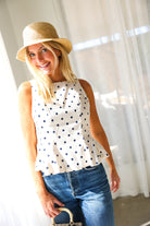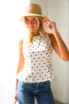 Classic meets charming in this effortlessly flattering peplum tank from THML. Featuring a timeless navy polka dot print on a soft cream base, this sleeveless top is designed with subtle tailoring through the bodice and a gentle peplum hem that adds shape without feeling fussy. The lightweight woven fabric makes it perfect for warm days, while the clean silhouette transitions beautifully from casual to dressed-up looks.