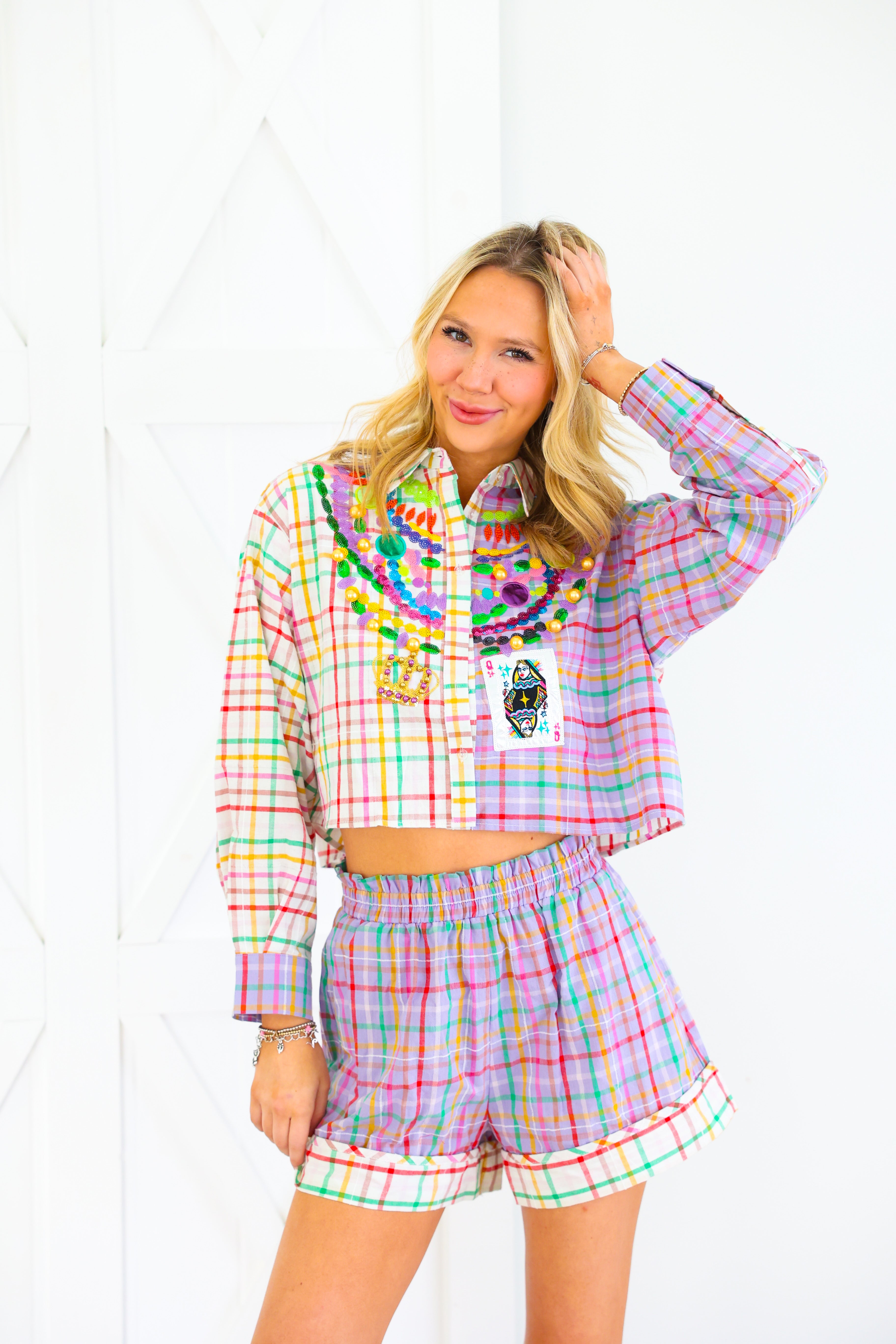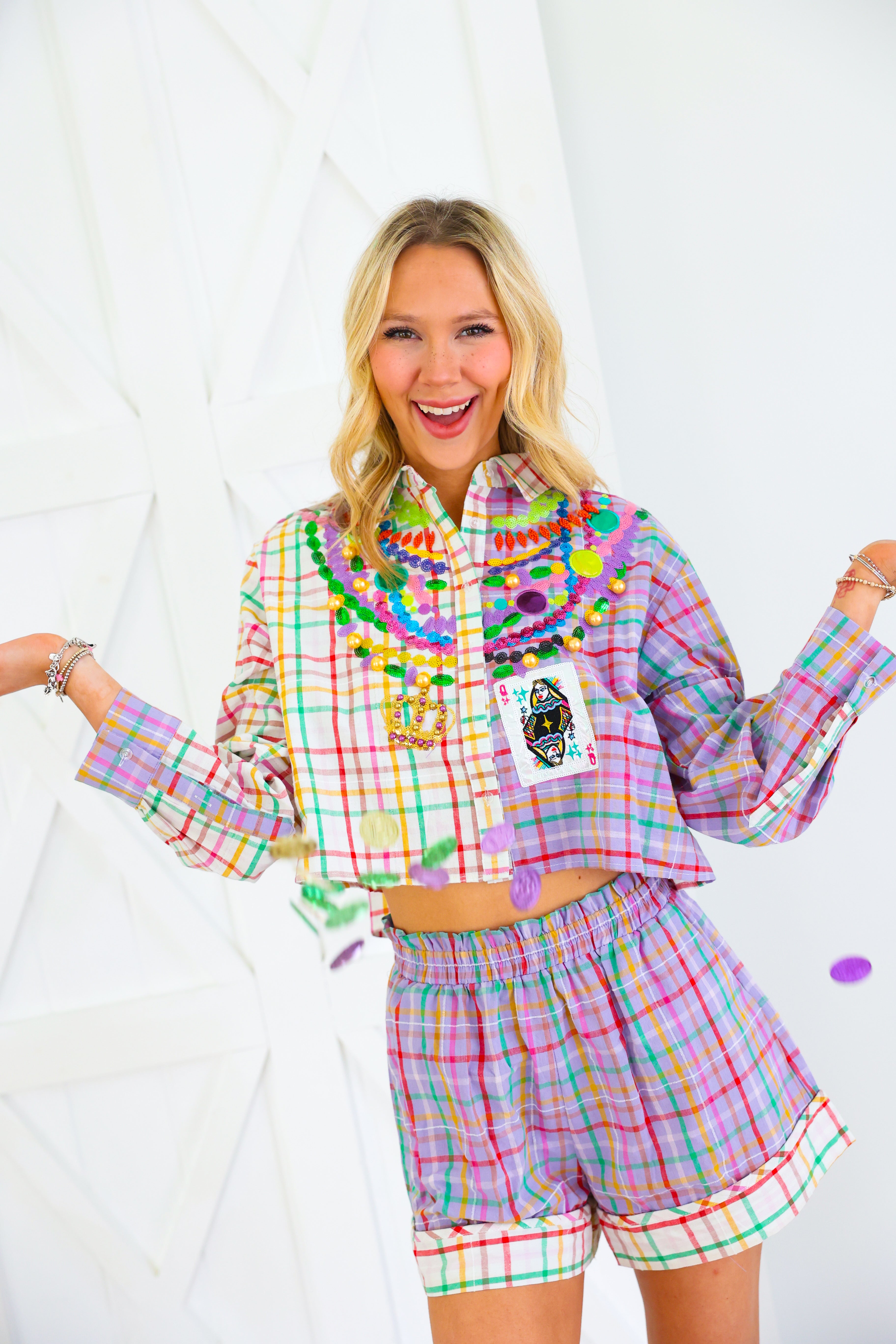 Queen of Sparkles Colorblock Plaid Mardi Gras Beads Button Up Top