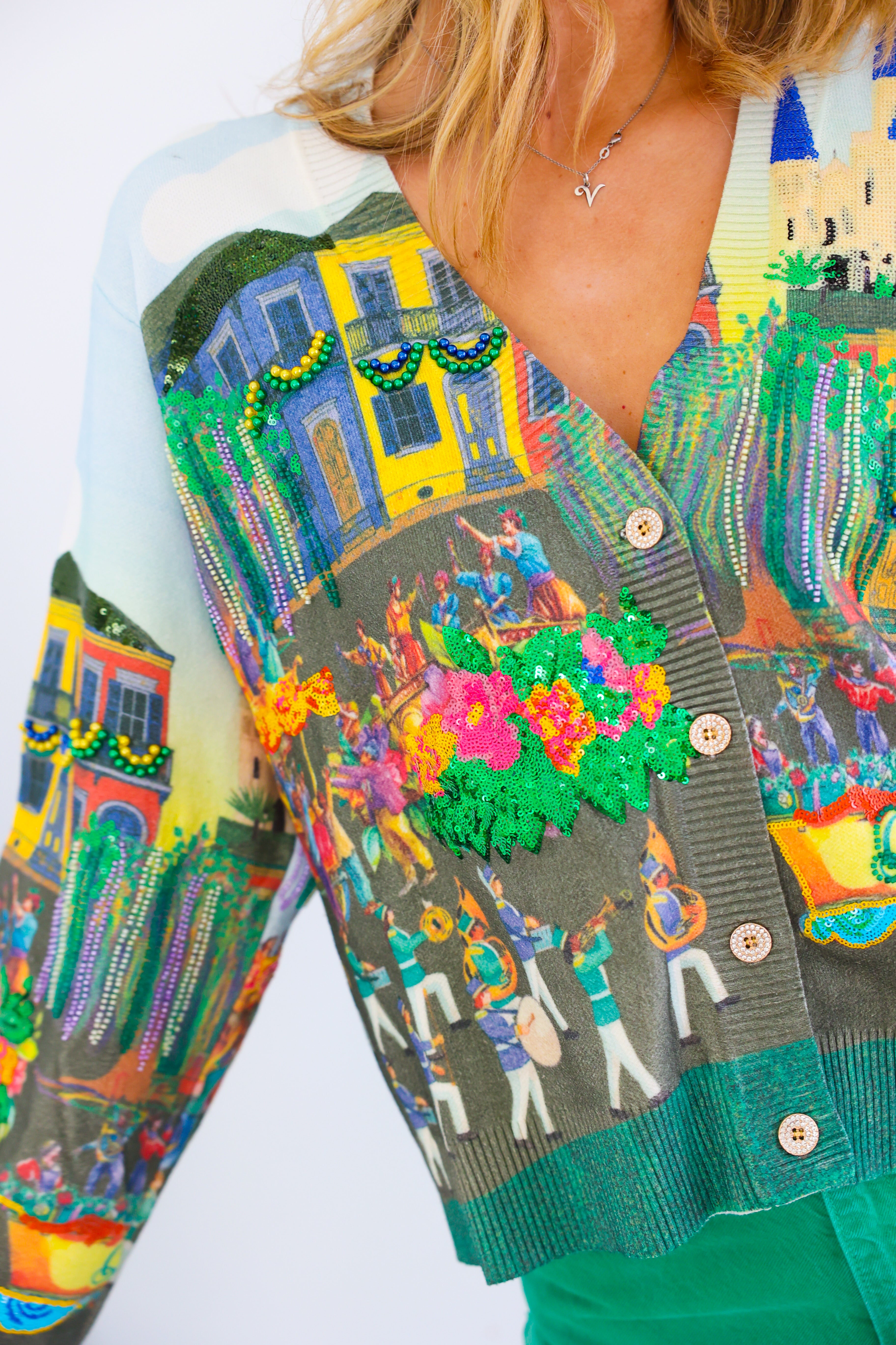 Mardi Gras Parade Scene Button Up Cardigan Queen of Sparkles