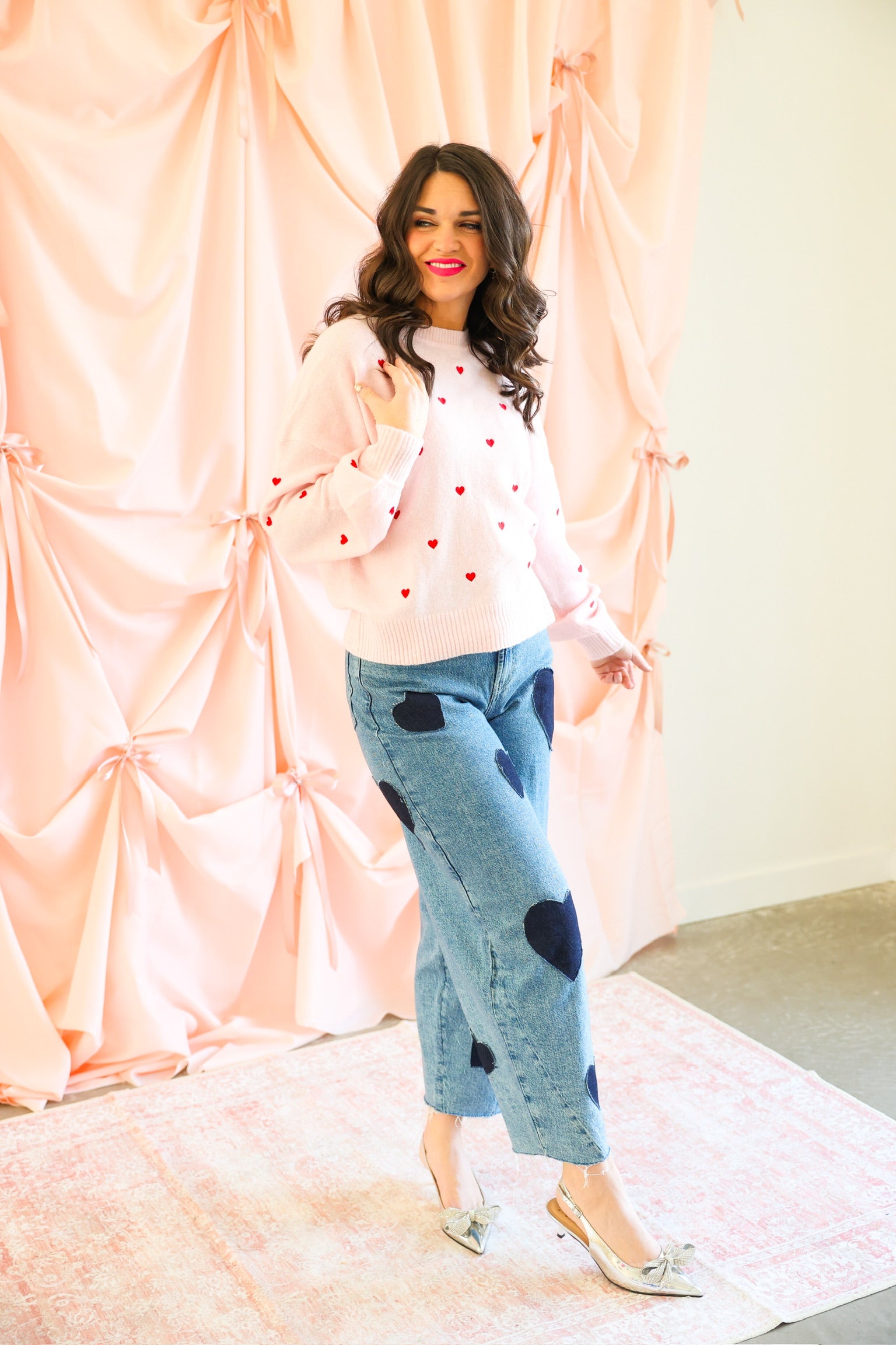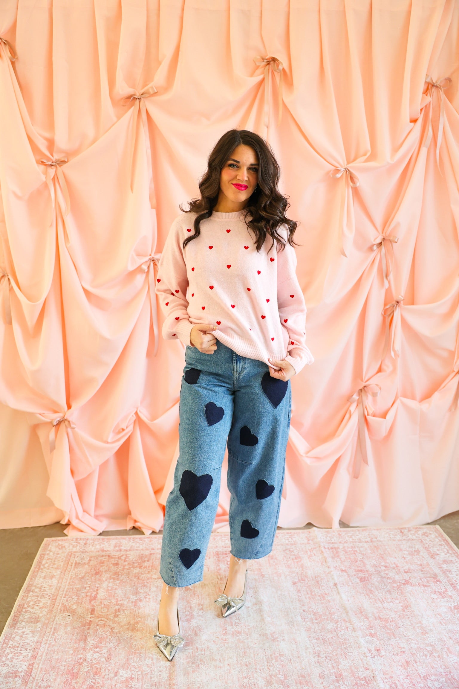 Soft blush knit with allover red embroidered heart details ❤️