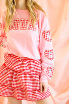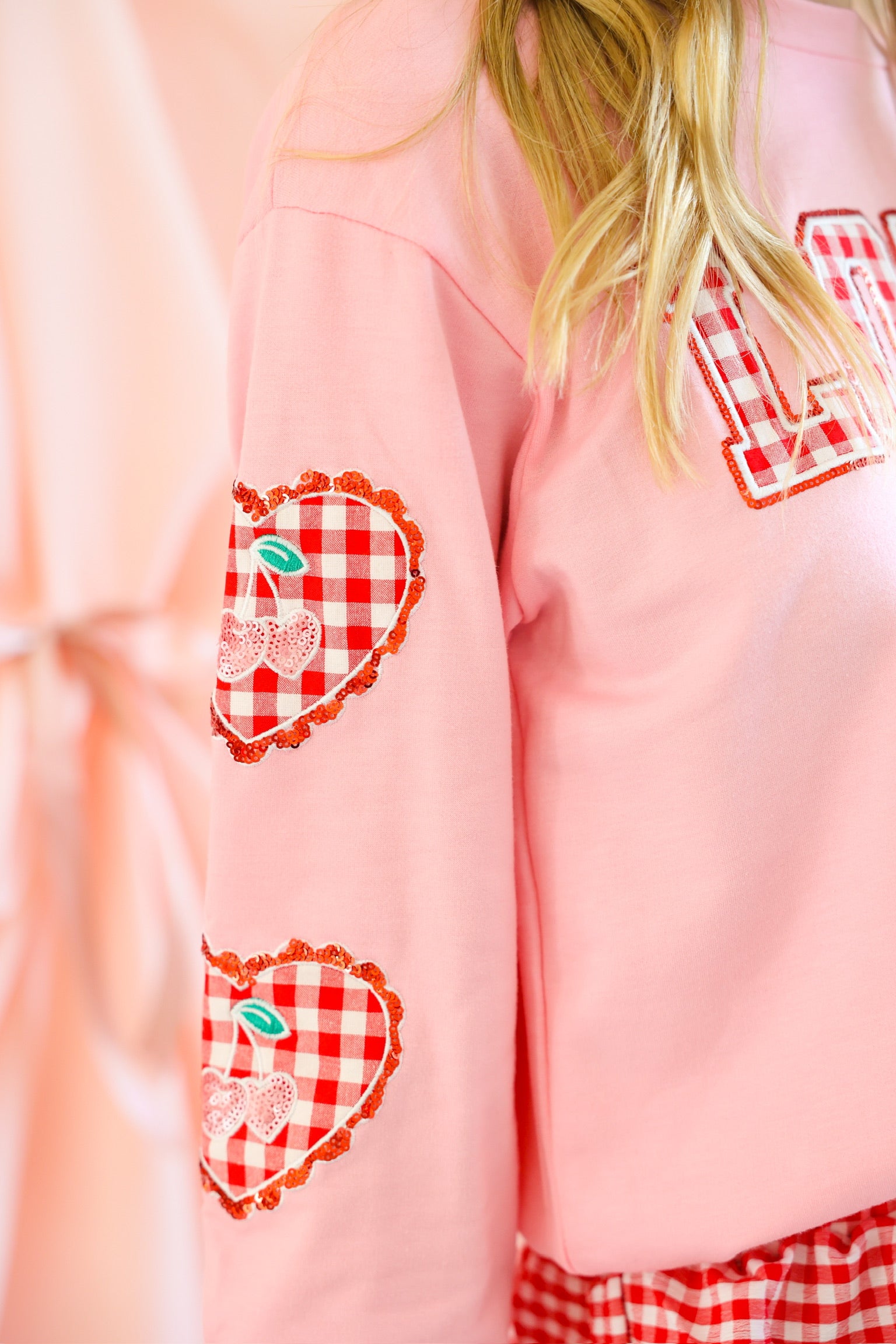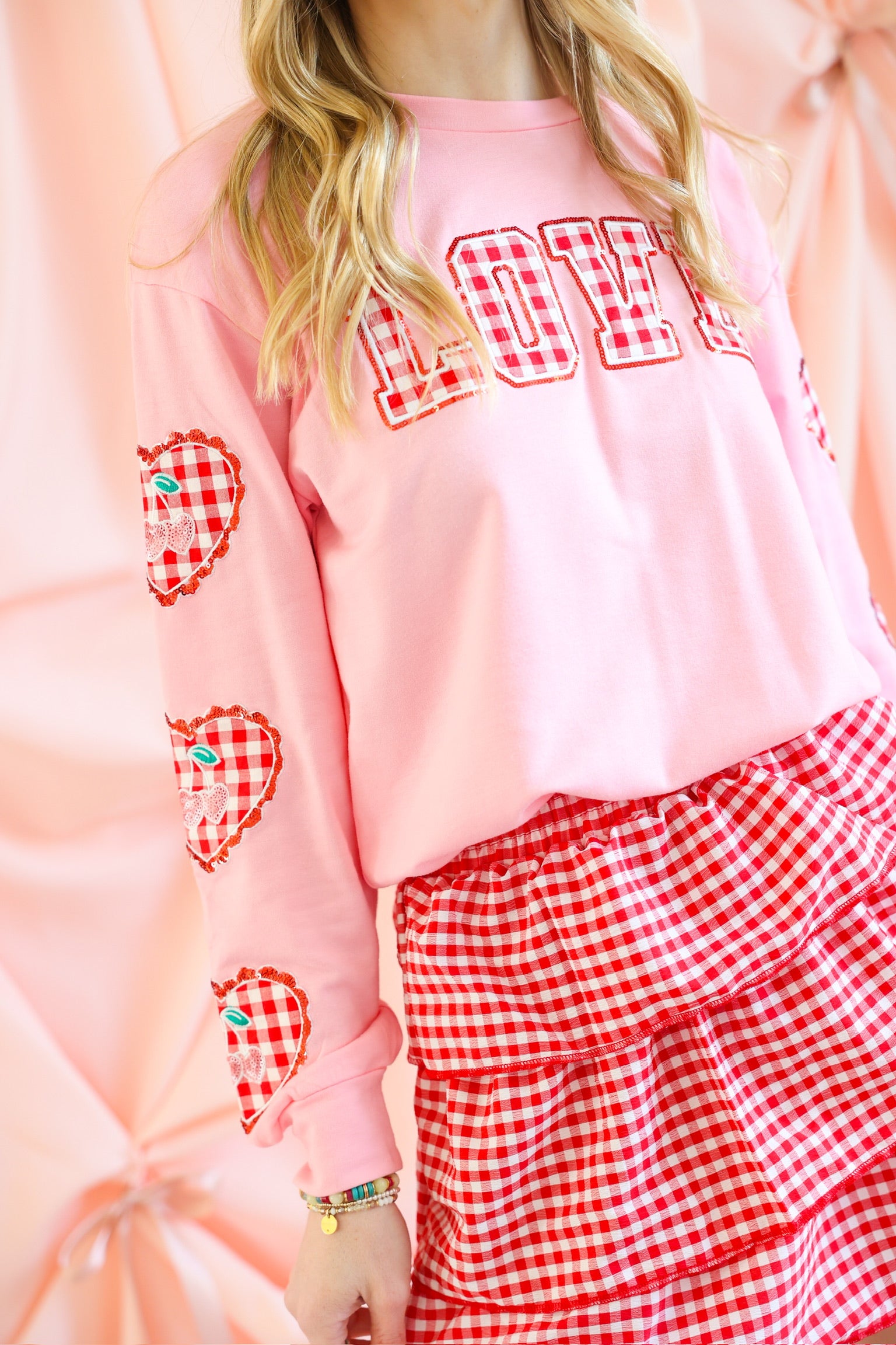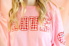Soft pink pullover with red gingham “LOVE” lettering