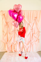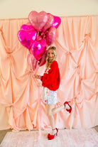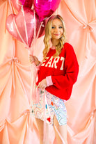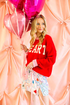 Fall head over heels for this cheerful heart sweater that brings all the love with a playful pop of color. Featuring bold cream “HEART” lettering across a vibrant red knit, this cozy pullover is finished with soft pink ribbed trim at the neckline, cuffs, and hem for a fun, feminine contrast. It’s the perfect blend of sweet and statement-making—ideal for Valentine’s season and beyond.