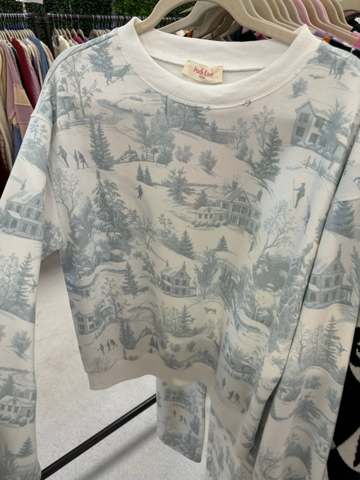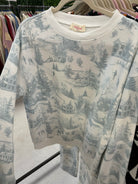 Discover effortless style with the Dusty Blue Toile Print Sweatshirt. Featuring an elegant toile pattern in a calming dusty blue shade, this sweatshirt combines artistic design with cozy comfort. Perfect for layering or lounging, it adds a touch of sophistication to your casual wardrobe.