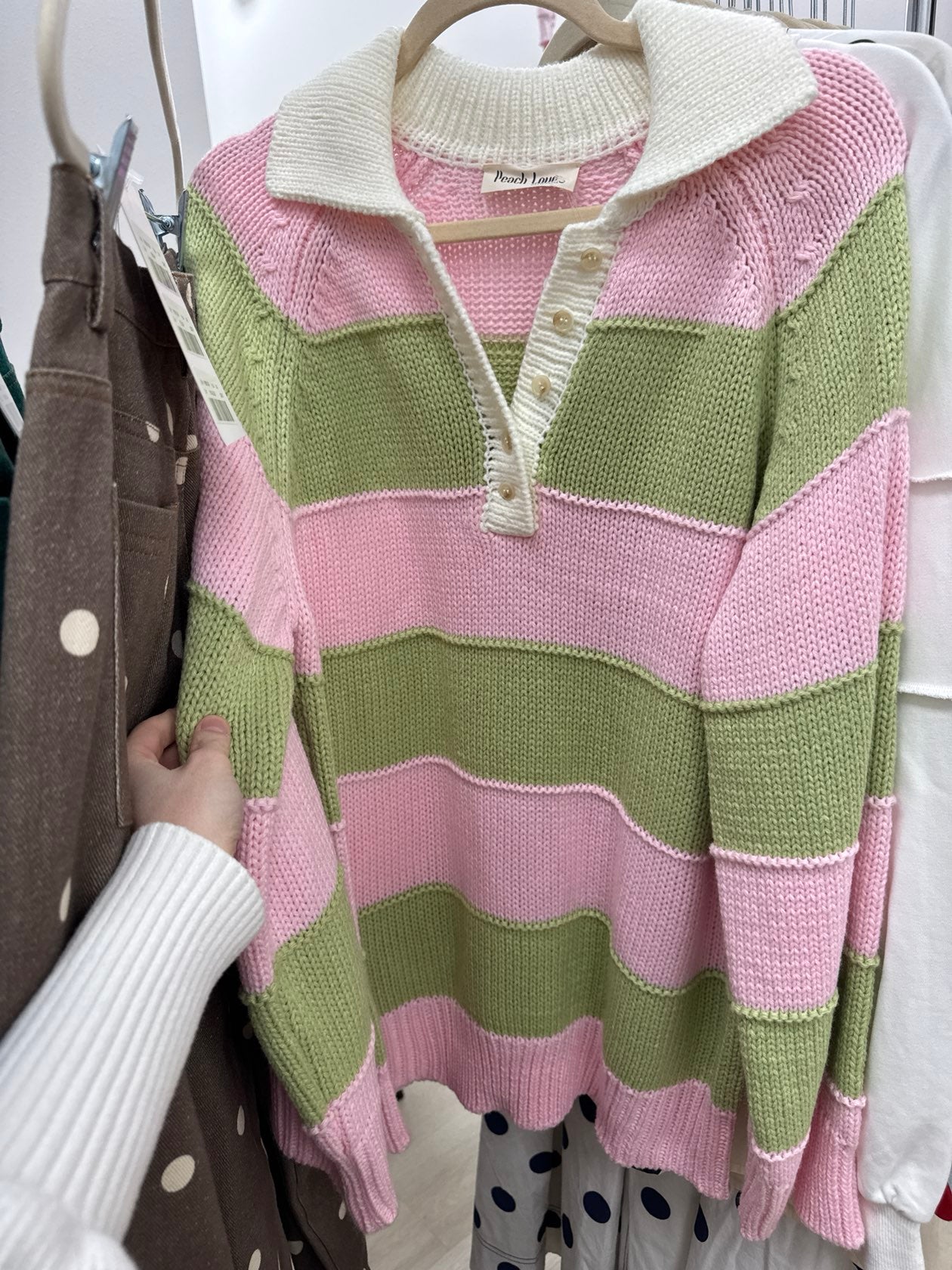 Cozy meets cute in this effortlessly charming striped knit sweater by Peach Love. Featuring soft pink and sage wide stripes, this relaxed pullover is finished with a crisp contrast collar and a partial button neckline for a playful, preppy touch. The textured knit gives it that lived-in, comfy feel while still looking put-together—perfect for everyday wear.