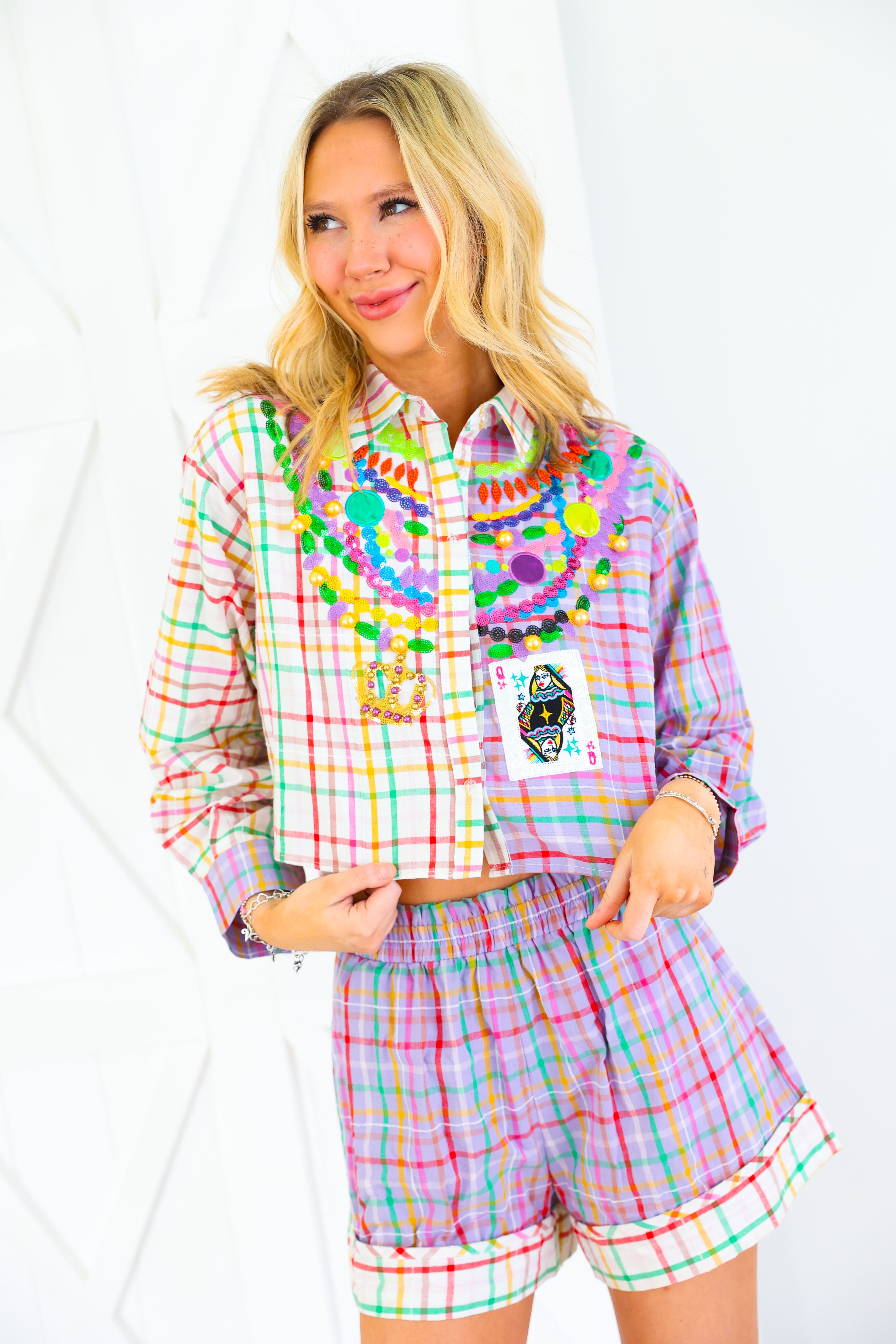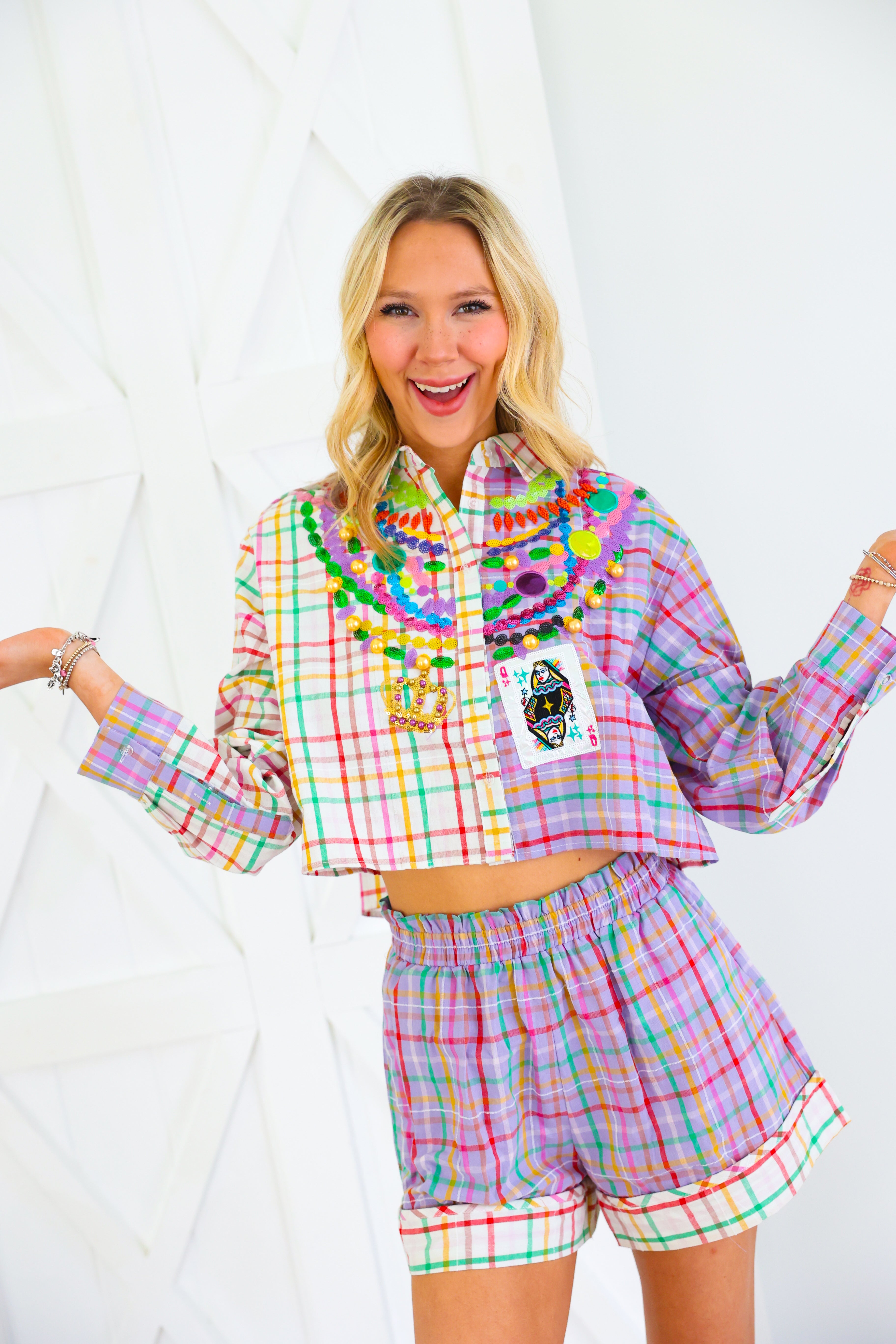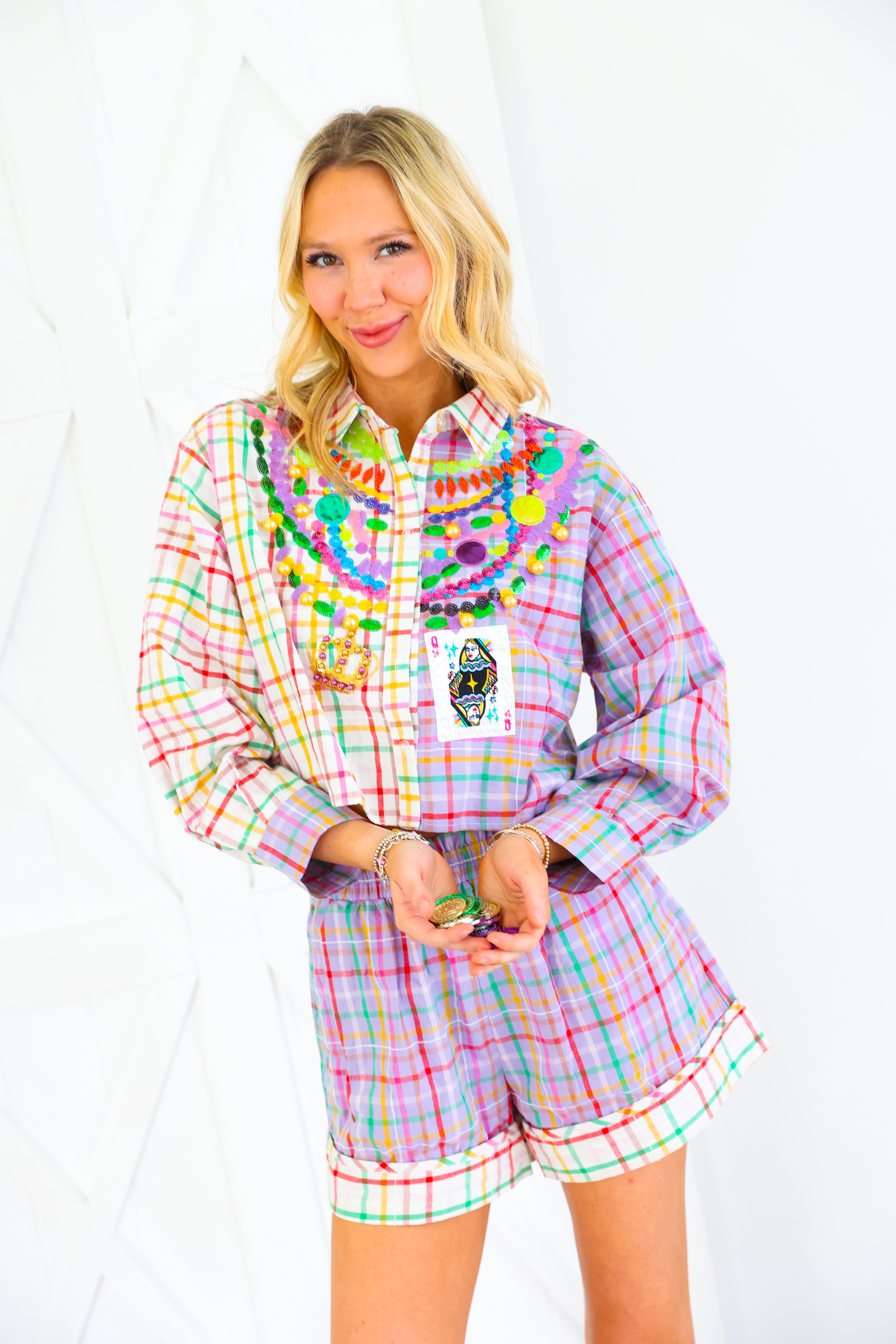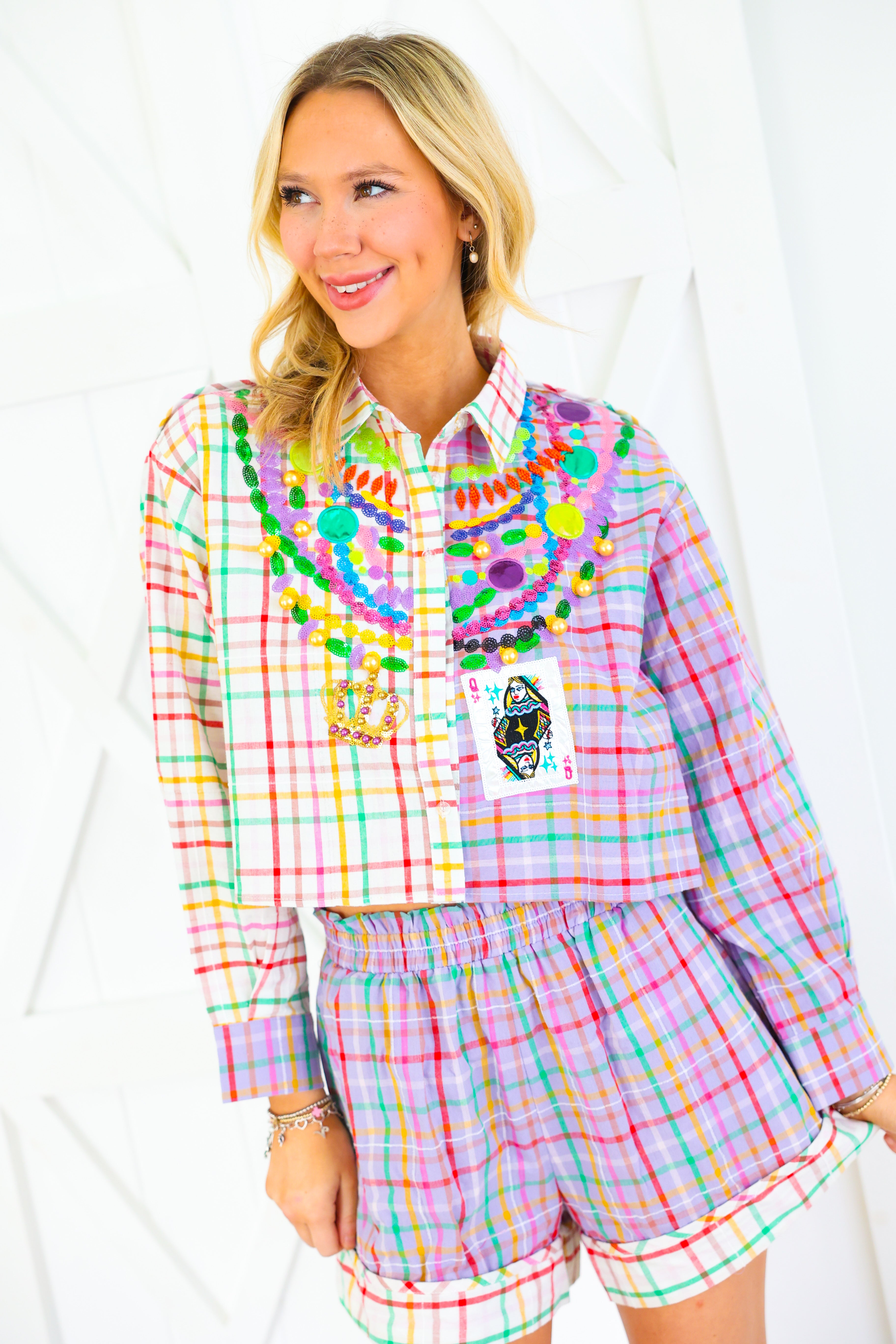 Celebrate Mardi Gras in full sparkle with the Queen of Sparkles Colorblock Plaid Mardi Gras Beads Button Up Top 🎭✨ This vibrant colorblock plaid button-up is adorned with signature Queen of Sparkles embellishments—layered sequin bead strands, jeweled appliqués, gold baubles, and a festive Mardi Gras playing card patch 💚💜💛 The cropped silhouette keeps the look fun and modern while bringing all the carnival flair. Pair it with the matching shorts for the complete show-stopping set!