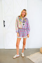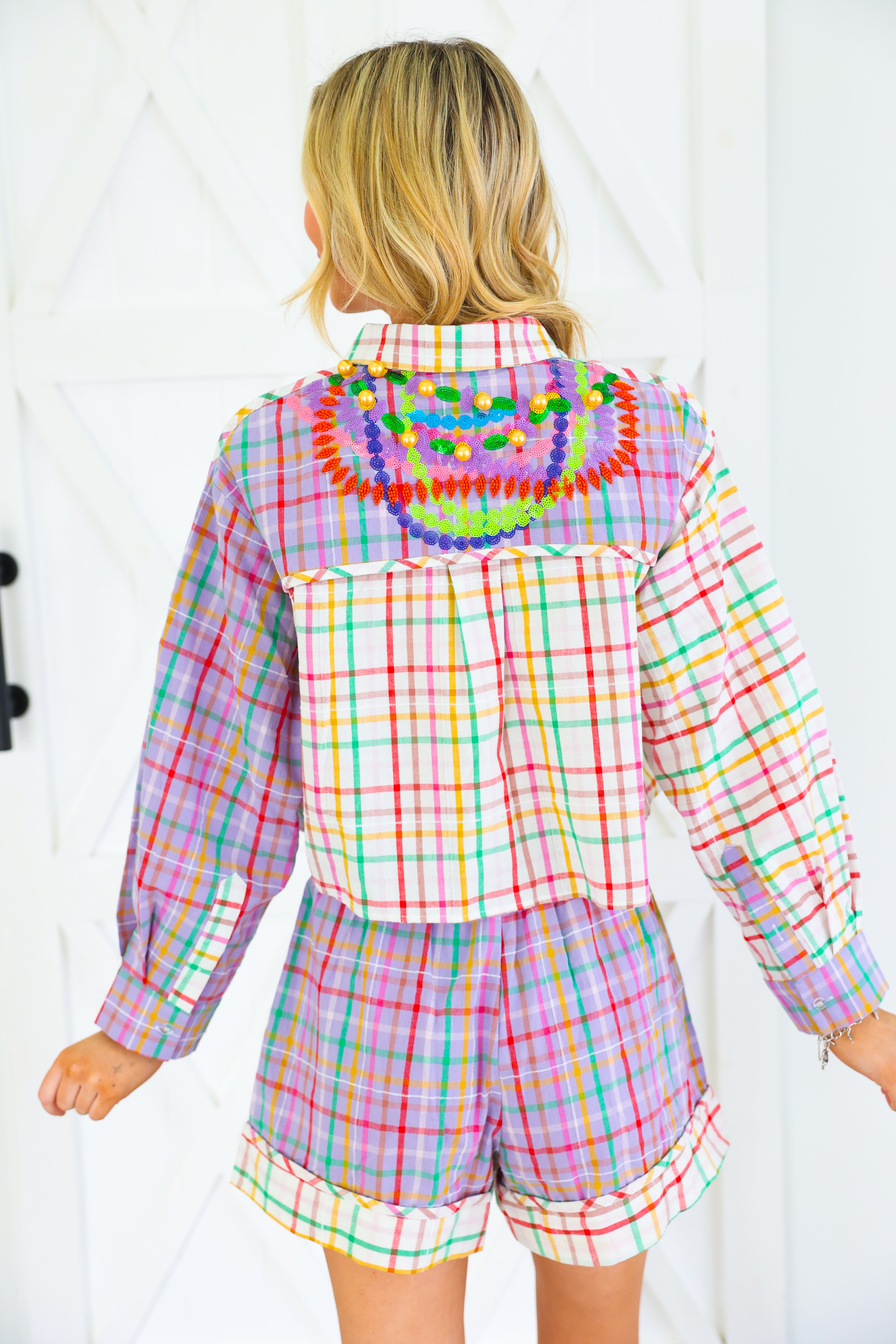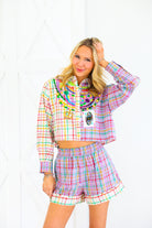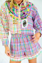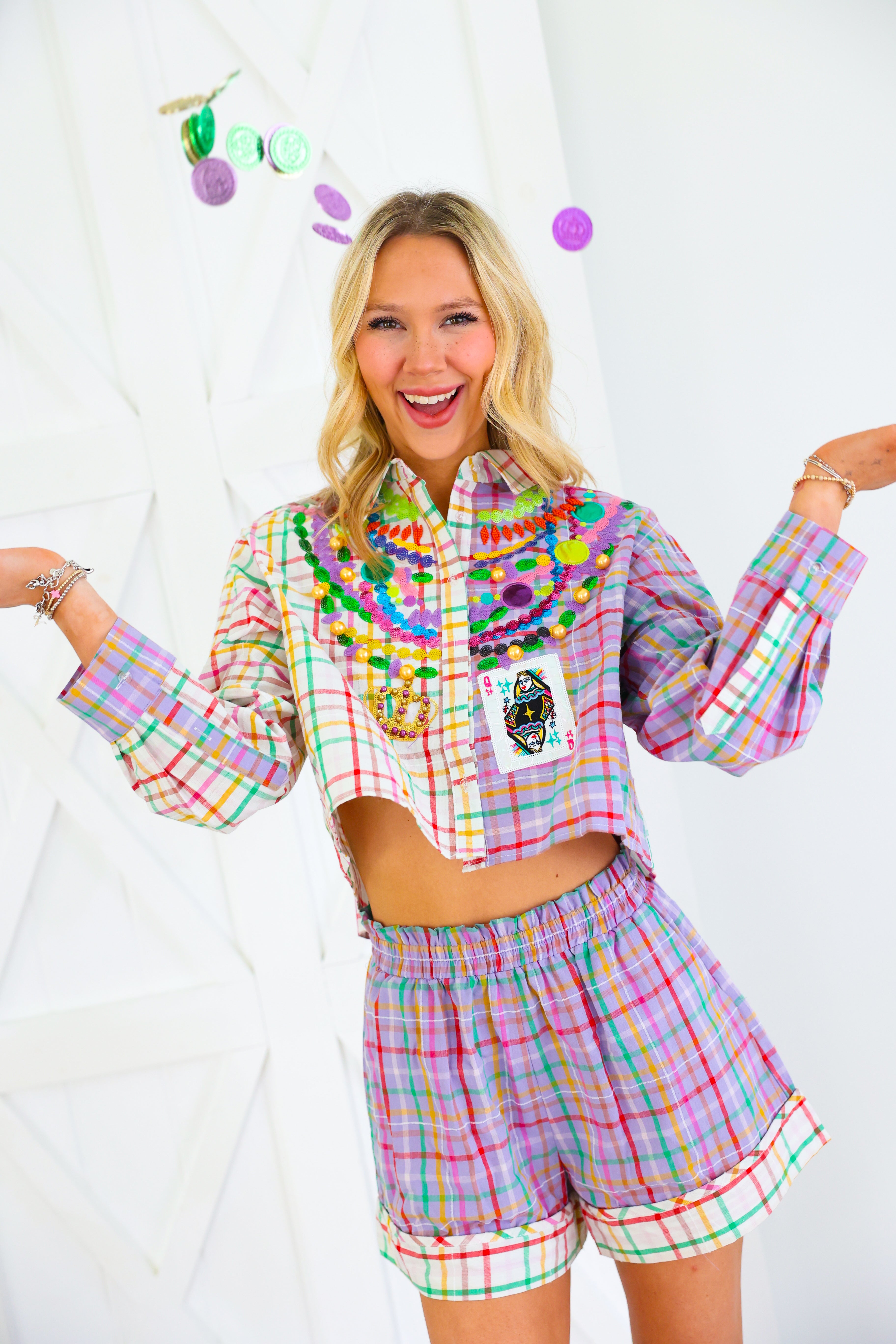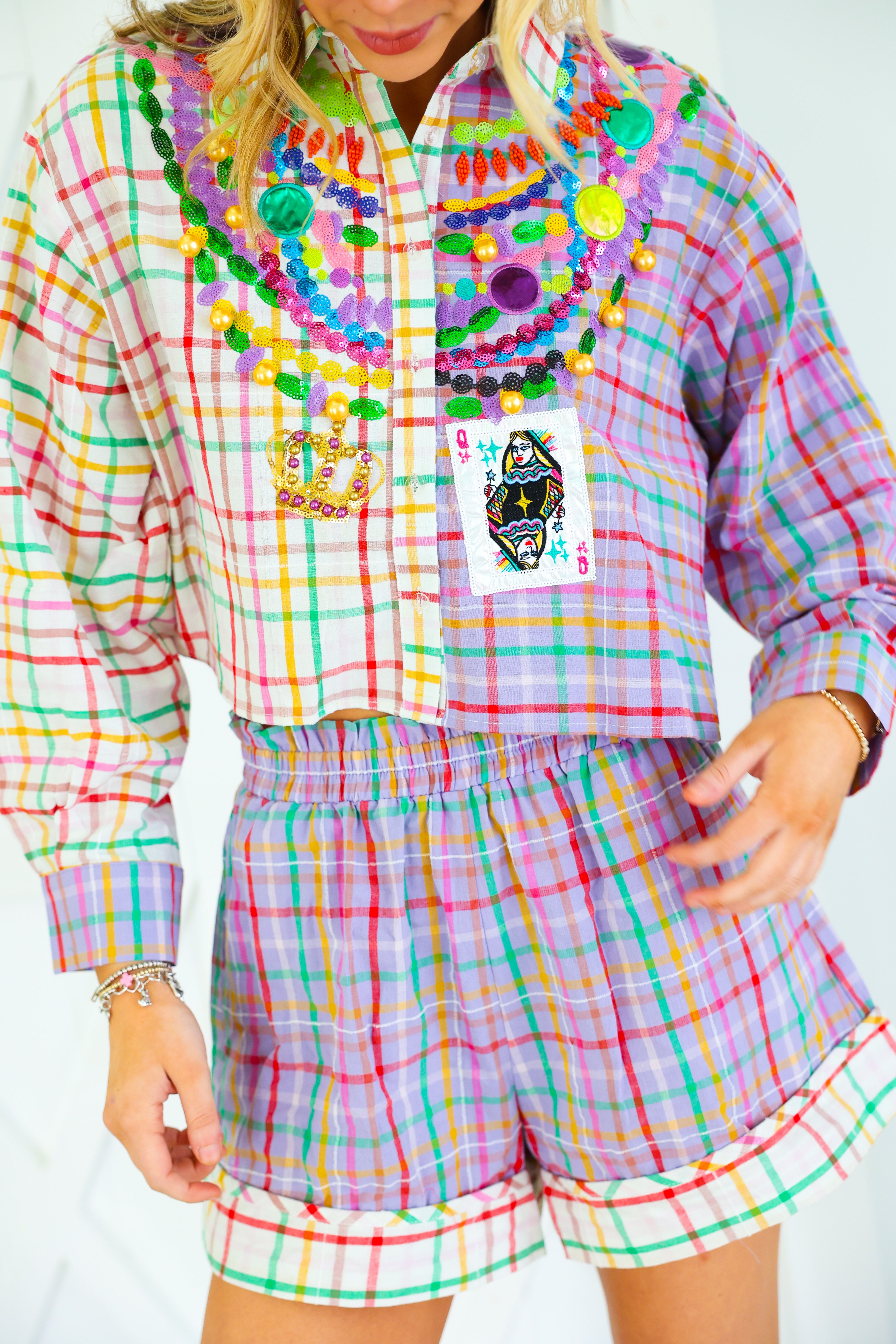 Celebrate Mardi Gras in full sparkle with the Queen of Sparkles Colorblock Plaid Mardi Gras Beads Button Up Top 🎭✨ This vibrant colorblock plaid button-up is adorned with signature Queen of Sparkles embellishments—layered sequin bead strands, jeweled appliqués, gold baubles, and a festive Mardi Gras playing card patch 💚💜💛 The cropped silhouette keeps the look fun and modern while bringing all the carnival flair. Pair it with the matching shorts for the complete show-stopping set!