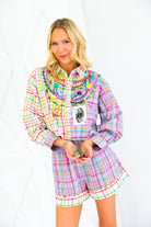 Queen of Sparkles Colorblock Plaid Mardi Gras Beads Button Up Top